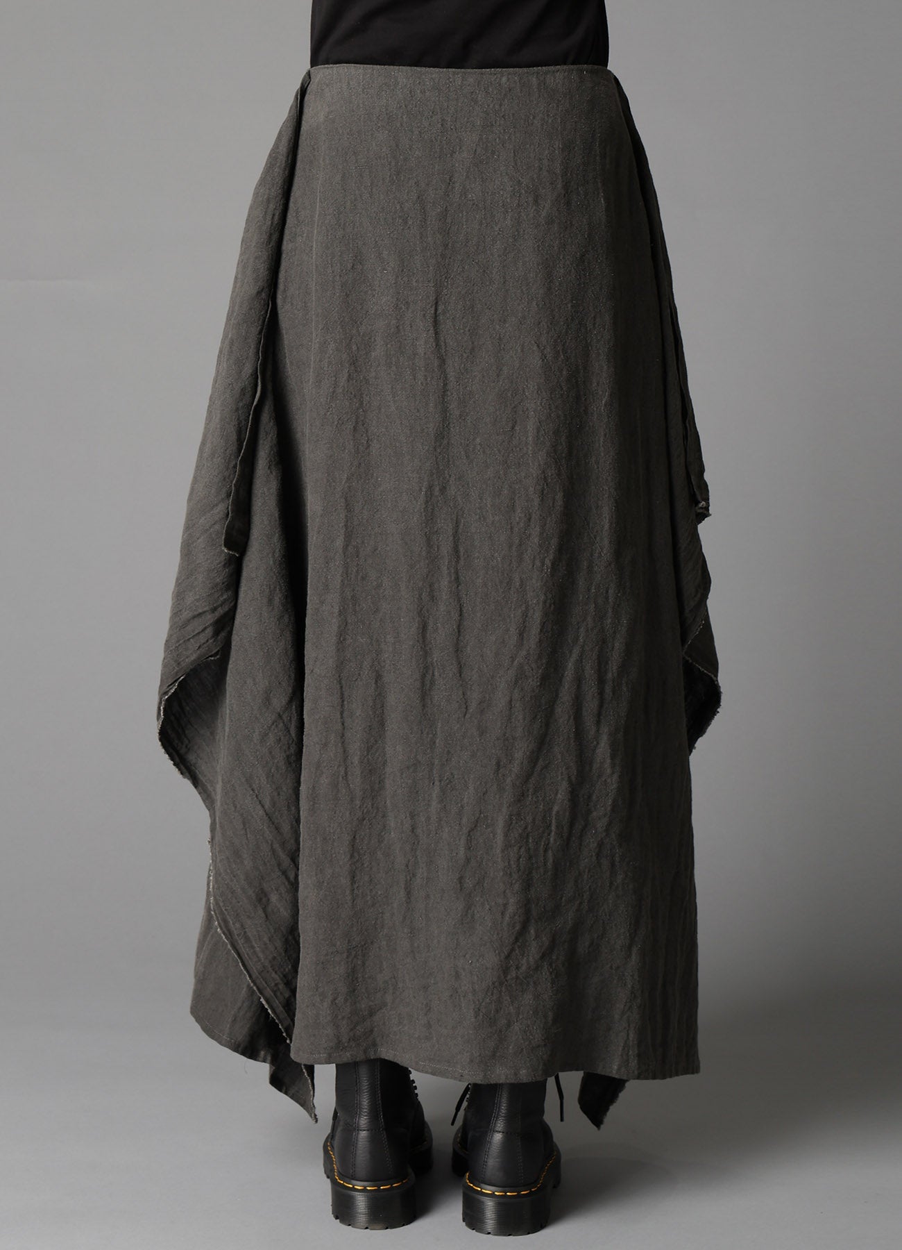 This skirt made from fine flax has a unique color gradient and texture, achieved through ink dyeing. Over time, the piece evolves, showcasing individual differences in its frayed edges. The voluminous silhouette, with its asymmetric hemline, creates movement, while the dye may cause color transfer, needing careful handling.