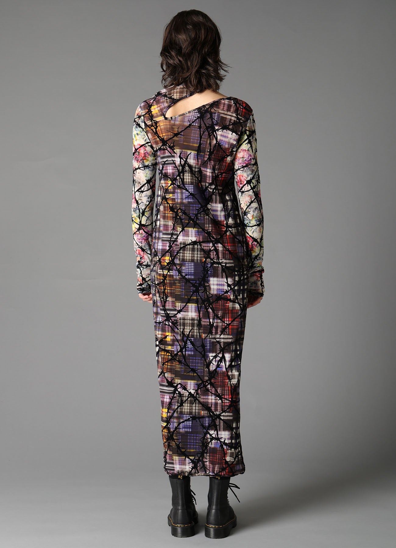 This elegant long dress is made with a high-shrink tulle material that combines printed and flocked designs, featuring barbed wire motifs over checkered and floral patterns for a textured finish. The dress offers a fitted silhouette, and its cut-out neckline with drapes highlights a sleek, vertical line.
