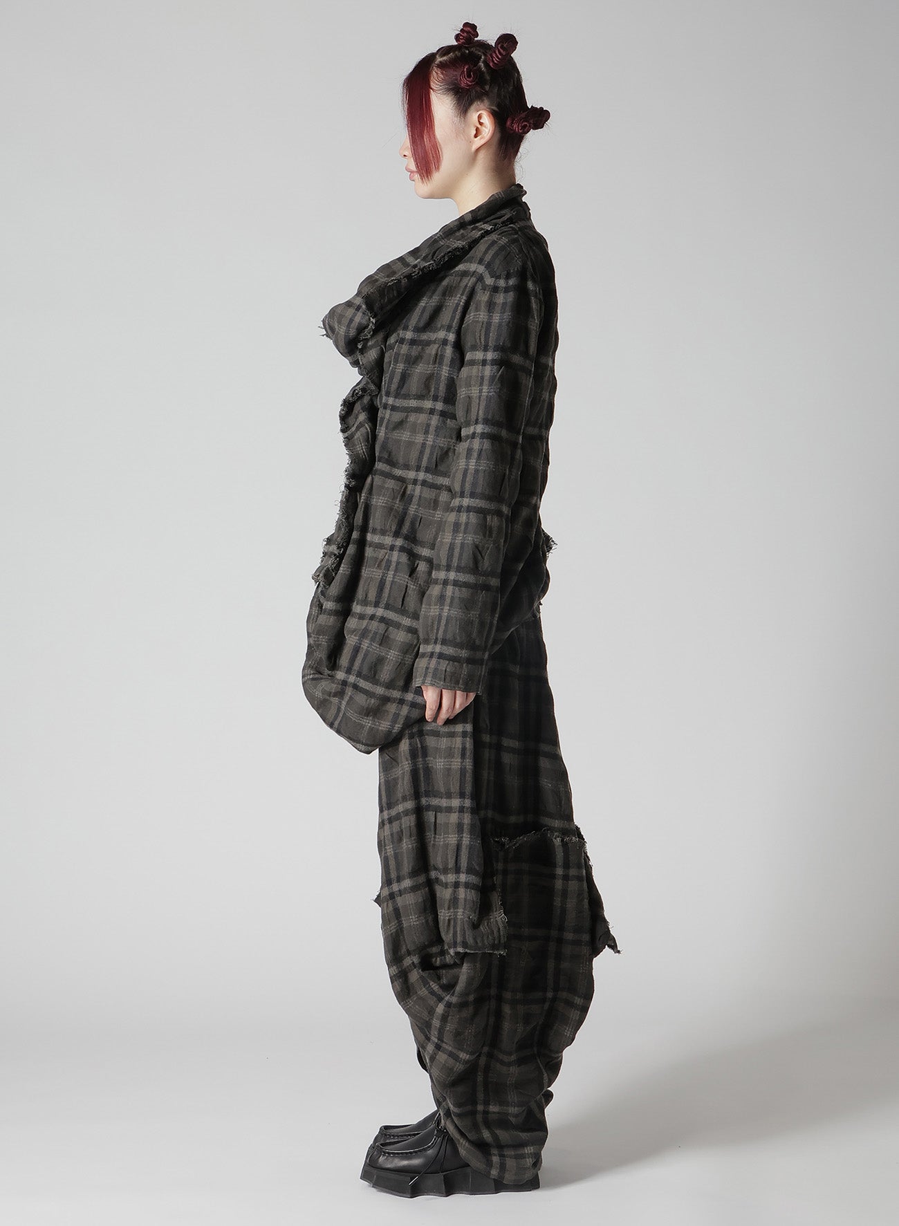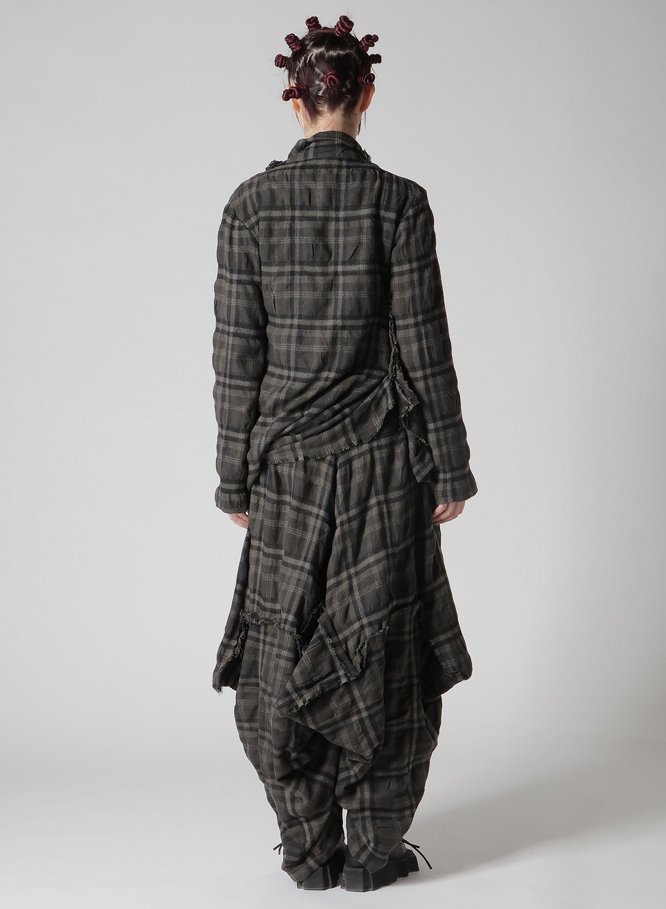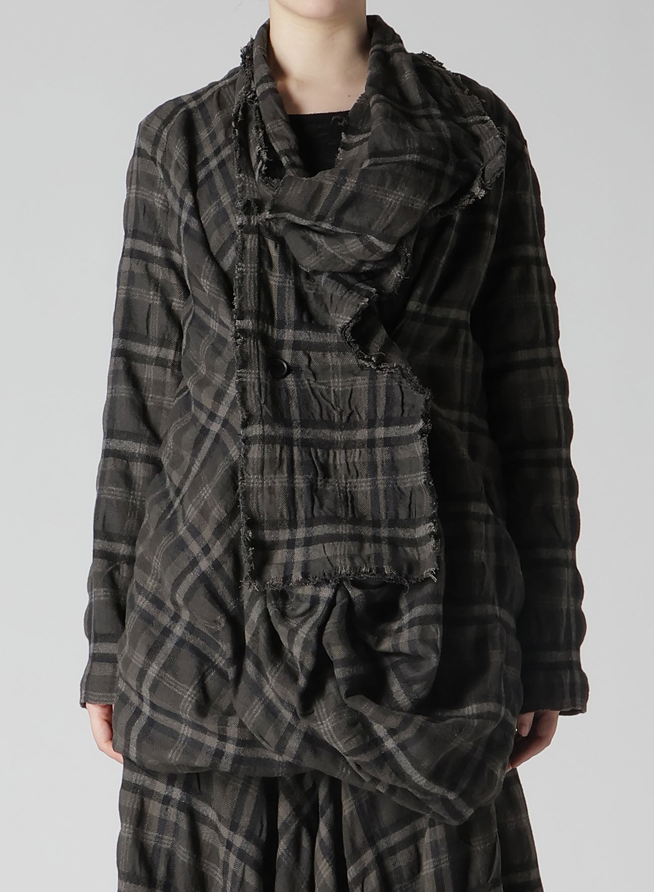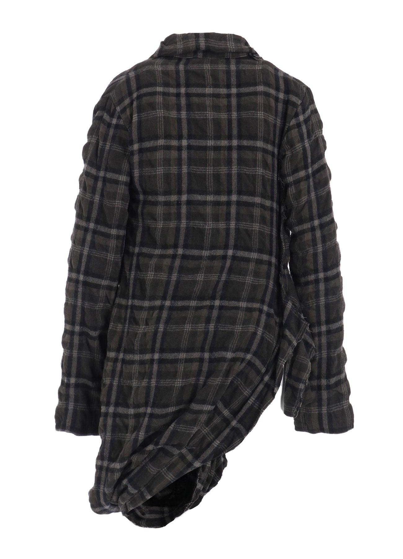 这款夹克以灰色为底色,采用羊毛和棉混纺的GLEN PLAID图案,用墨水染色。染色过程产生独特的色调、色差和褶皱。穿得越久,它的颜色变化越多,增强复古感。夹克特色包括独特拼接、前面廓形饱满、背面线条利落。 - 墨水染色的GLEN PLAID面料,羊毛混棉 - 独特色调和自然褶皱 - 未完成边缘的复古风格,边缘逐渐磨损 - 带有独特领口及下摆的拼接设计 - 避免与白色或浅色单品搭配,以防染色转移