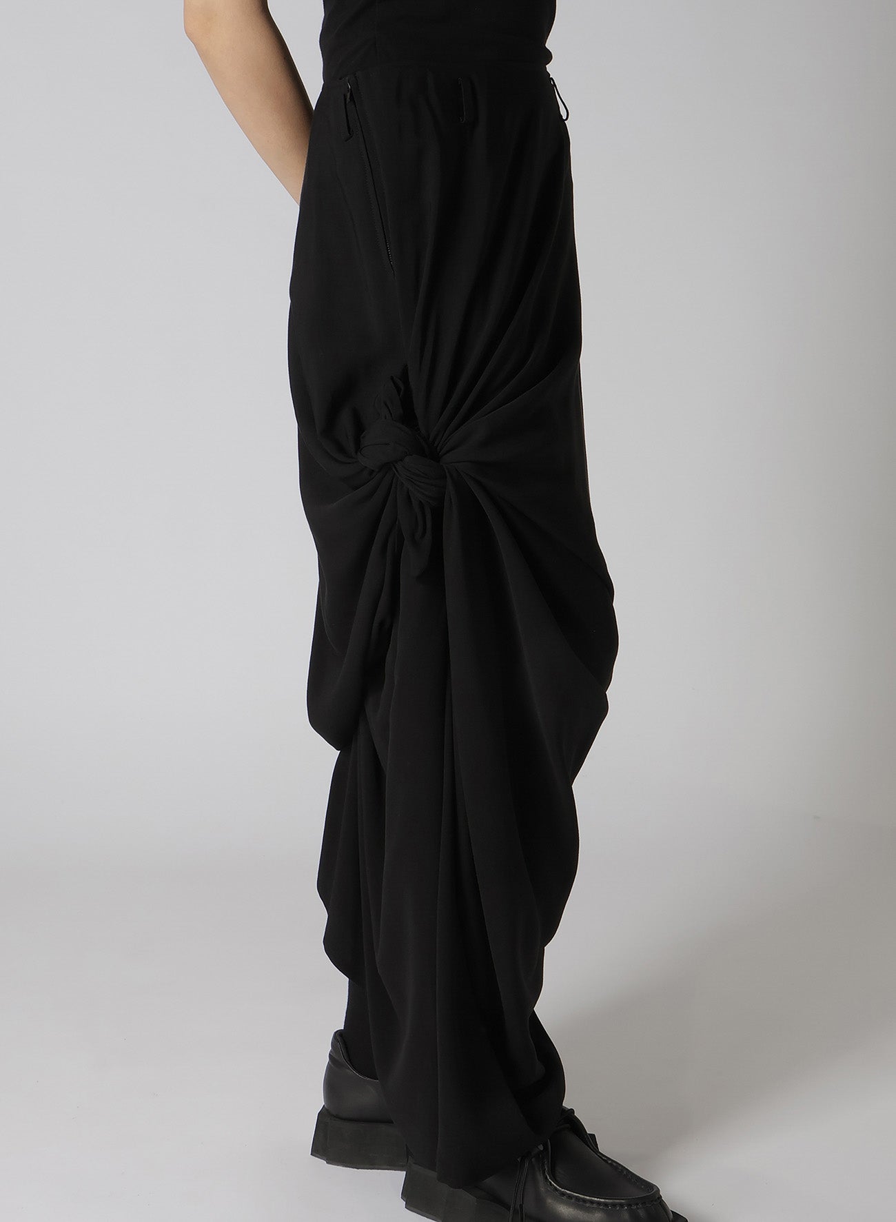 这款面料采用强捻纱线制成,具有精致的微光泽、出色的垂感和柔软的触感。滚筒处理确保了自然的质感和外观。裙子的突出设计元素是右前方的结,营造出流畅的垂感。左侧较短,露出小腿,从不同角度展现出多样的视觉吸引力。