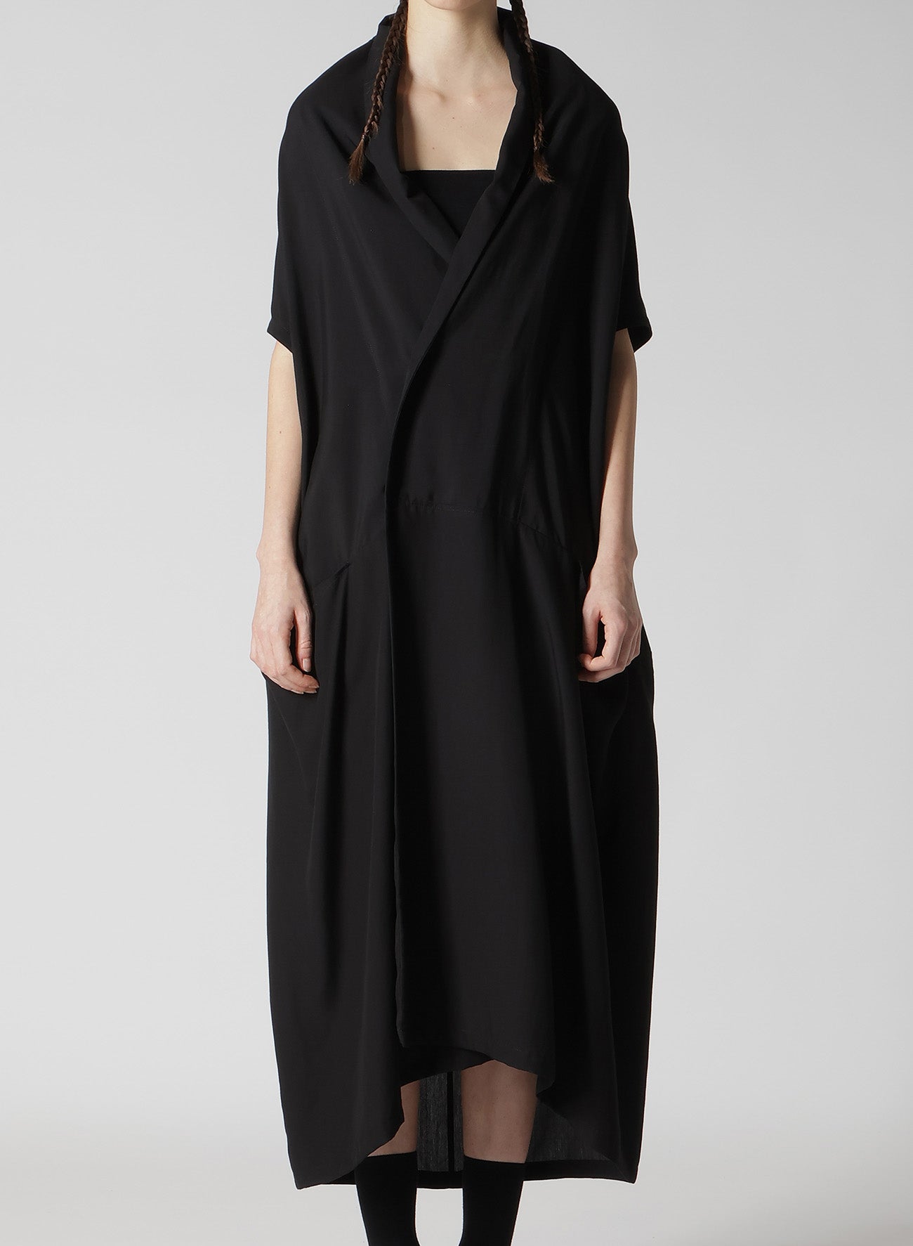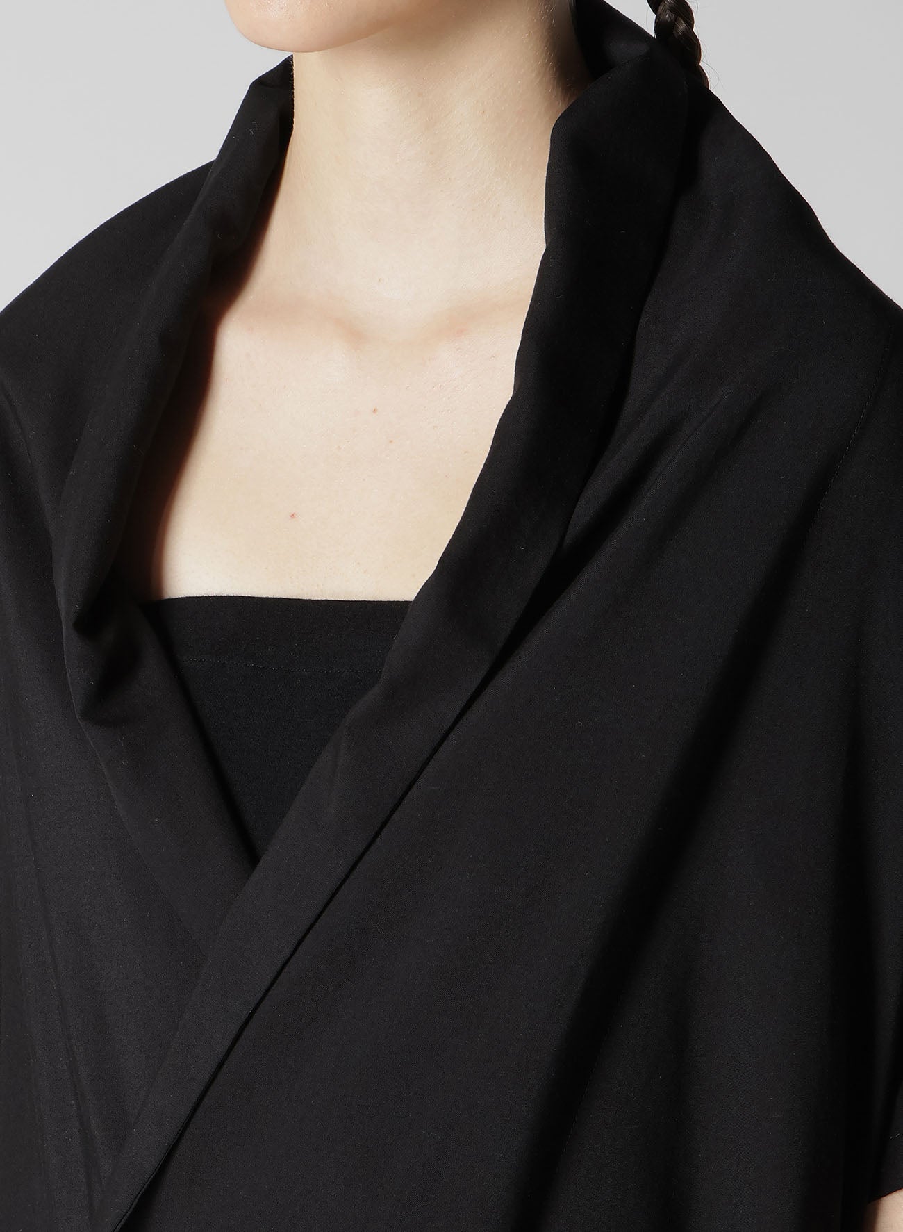 此产品采用柔软、略微光泽的面料,呈现优雅感。右前交叉设计融入和服元素,增强了其精致感。独特的光泽特性使整体优雅度更胜一筹。更换内搭可享受多样风格与氛围。