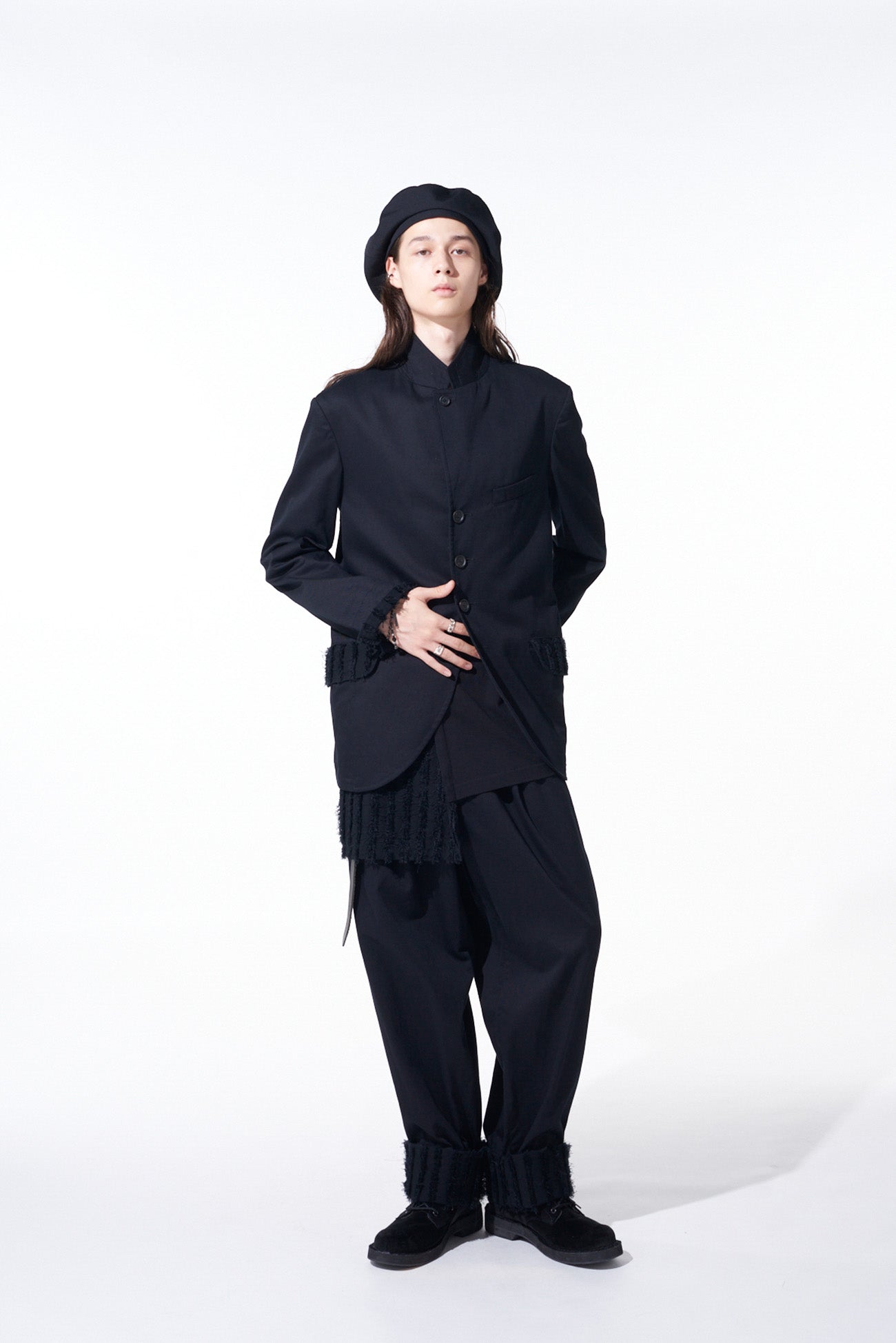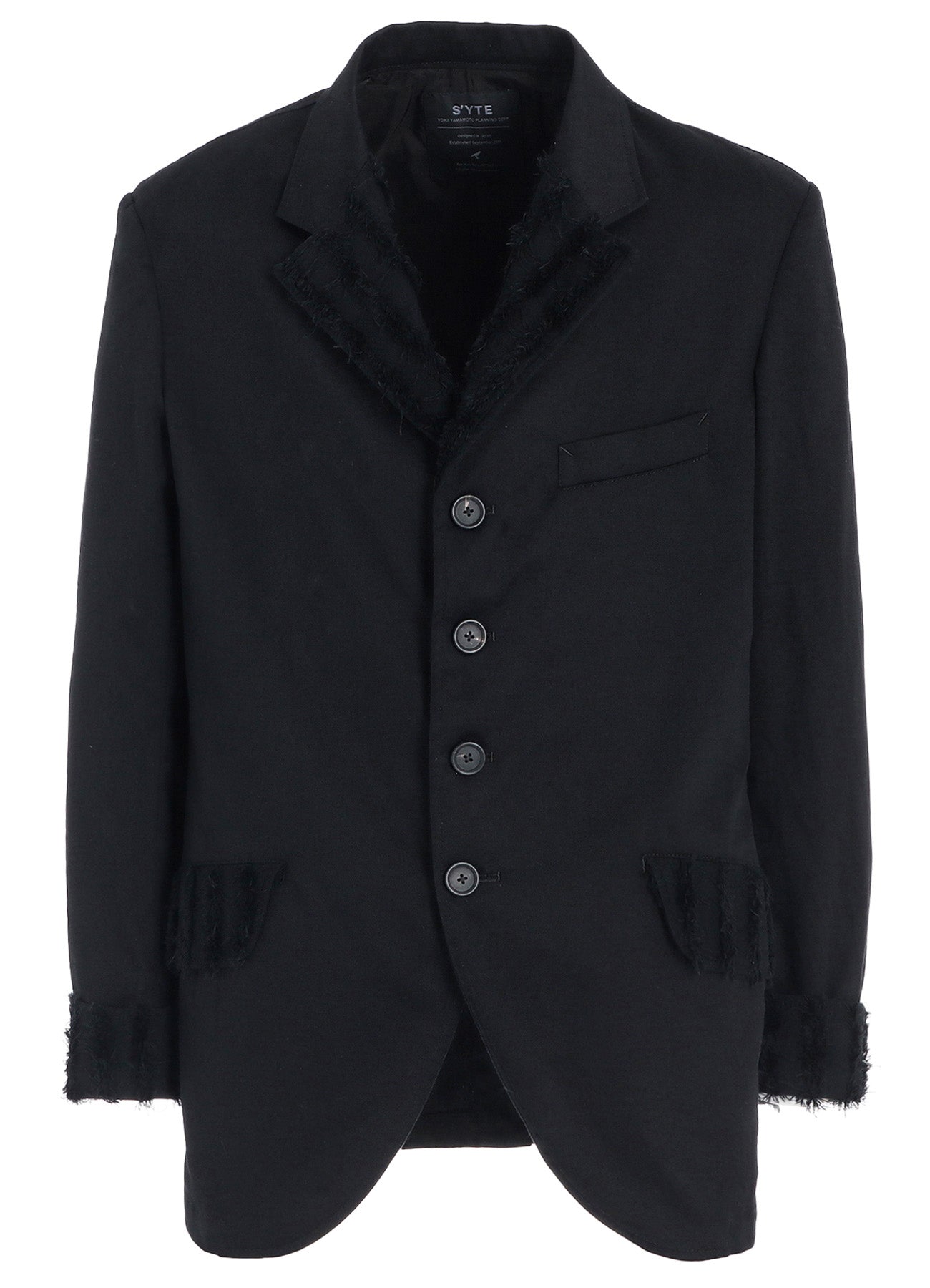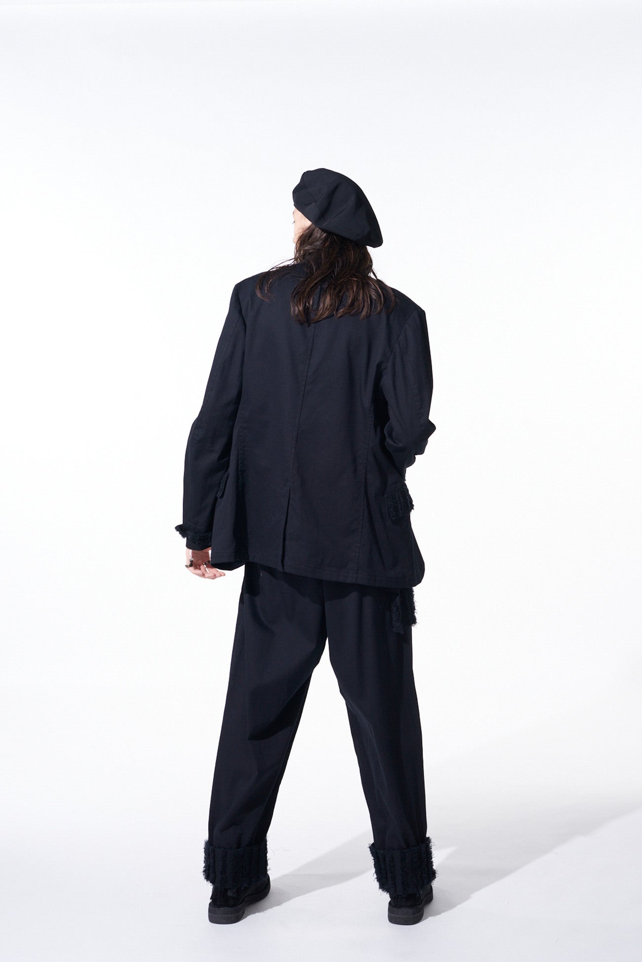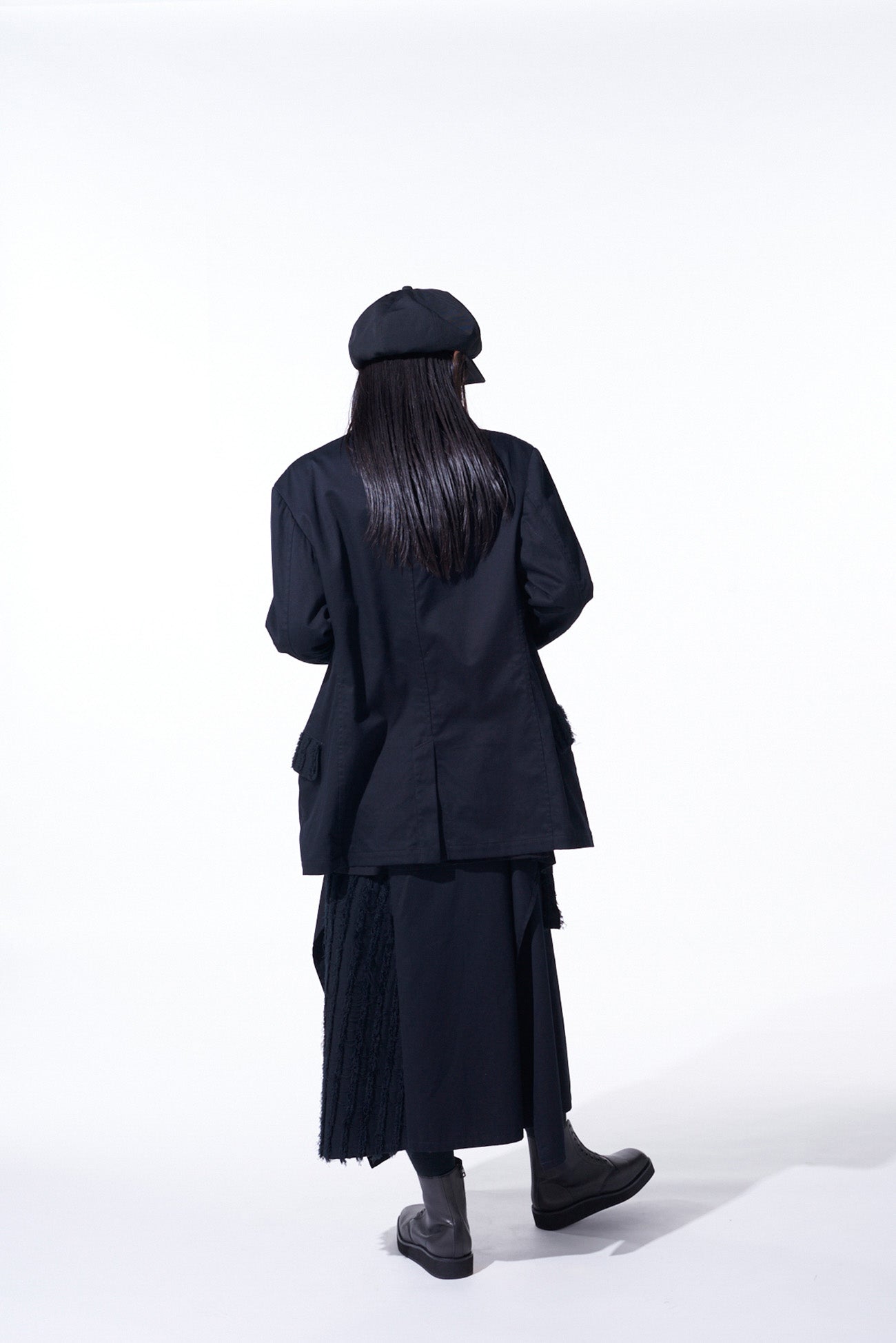 这款四扣棉斜纹夹克采用毛茸茸的JACQUARD面料制成。流苏条纹JACQUARD与平斜纹面料之间的对比形成鲜明的设计。上扣领口可实现立领设计。这款中等厚度的夹克提供了多样化和优雅的外观。