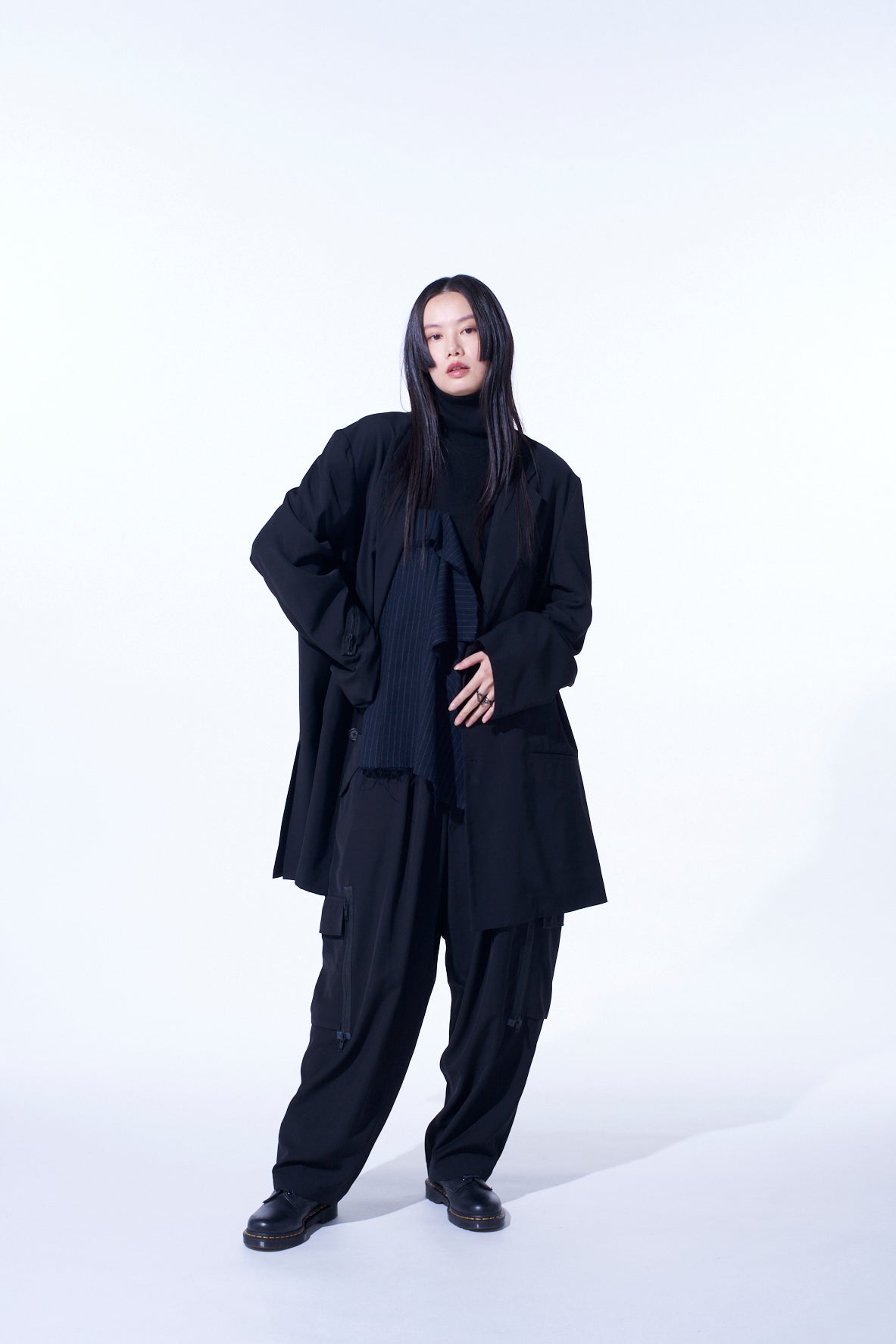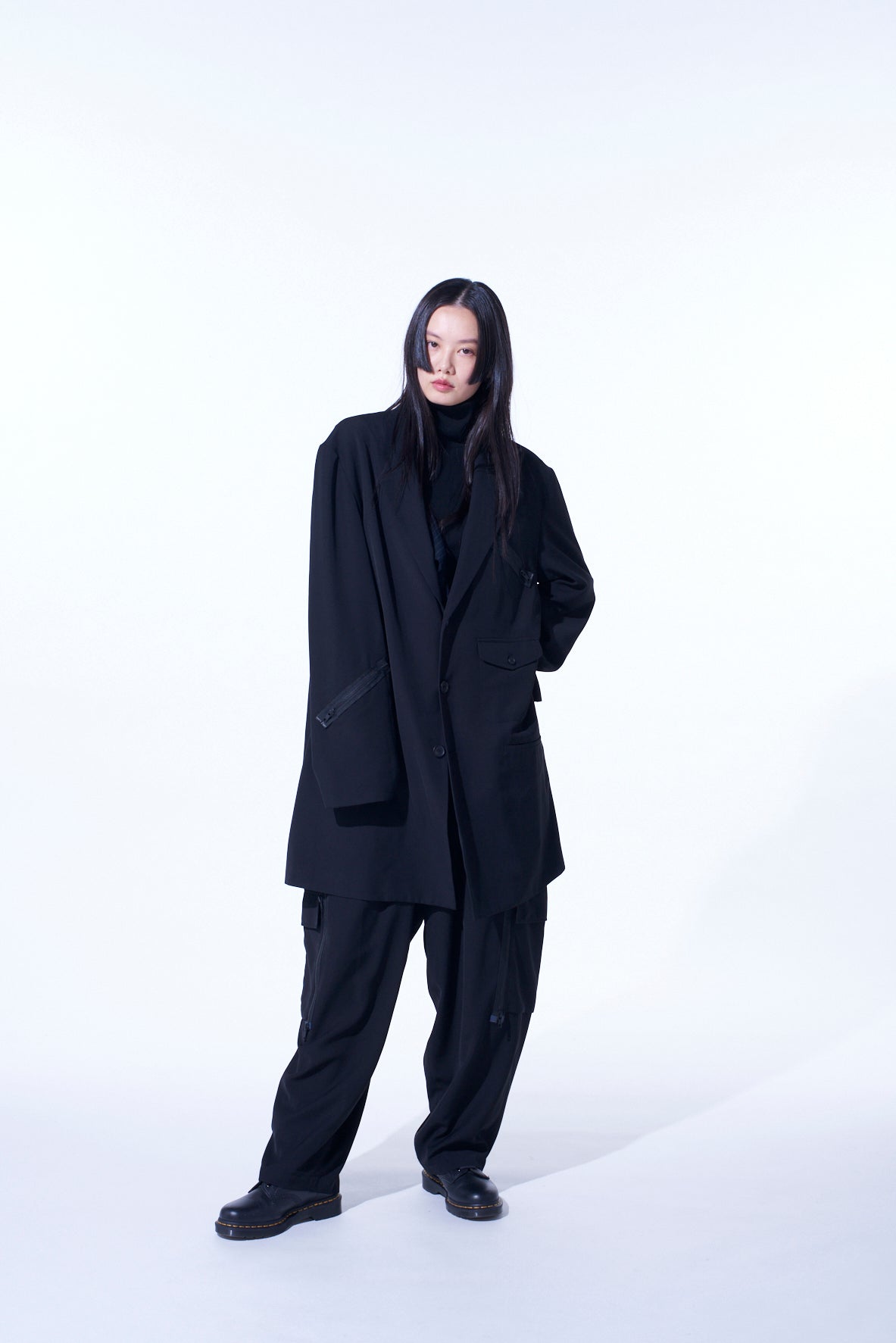 这款长款夹克采用灵感来自朋克设计,右袖和左胸配有缝线拉链口袋。落肩风格增添了休闲氛围,适合宽松或修身裤装多种搭配。使用耐用的聚酯斜纹布制成,抗皱并保持形状。