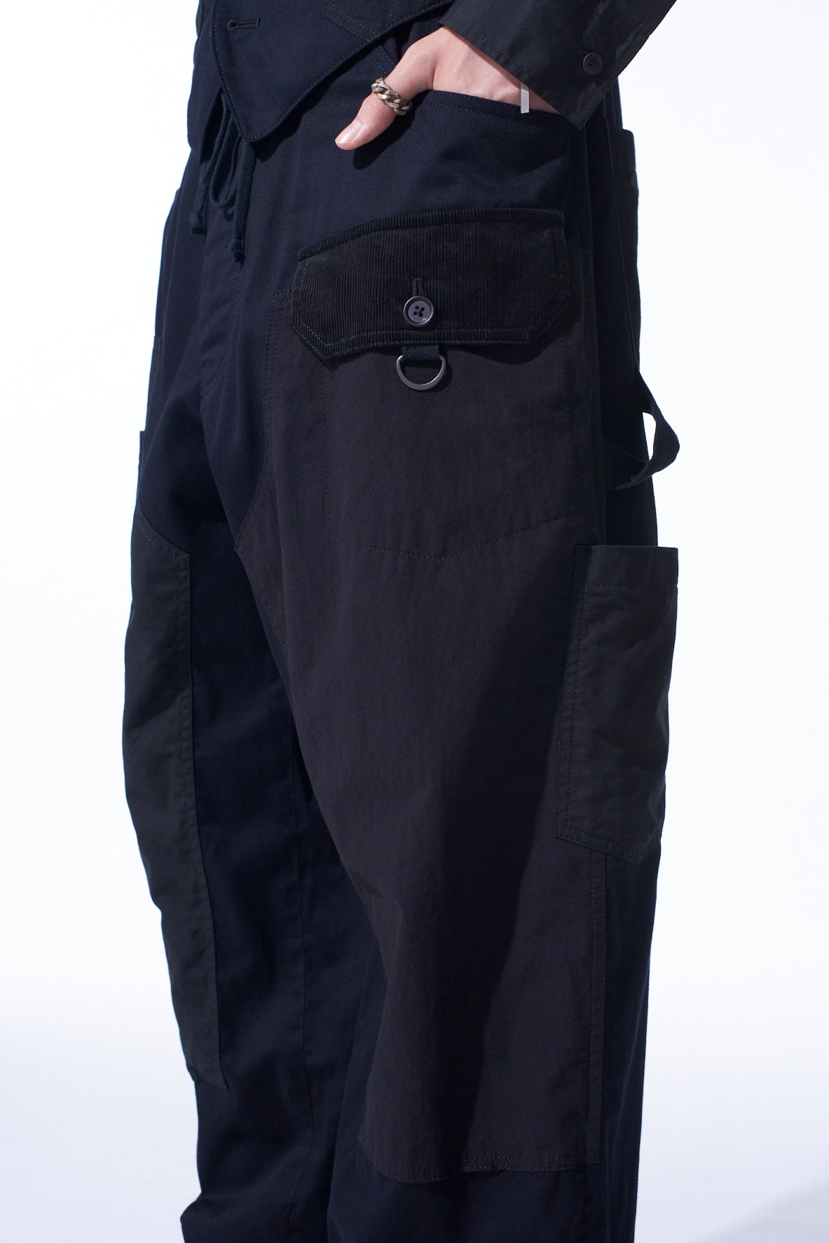 拼布画家裤采用棉斜纹布,结合多种面料呈现独特外观。工装风格的工具袋和大口袋设计,拼接的防撕裂布、气候布和灯芯绒增加了层次感和深度,确保穿着风格。