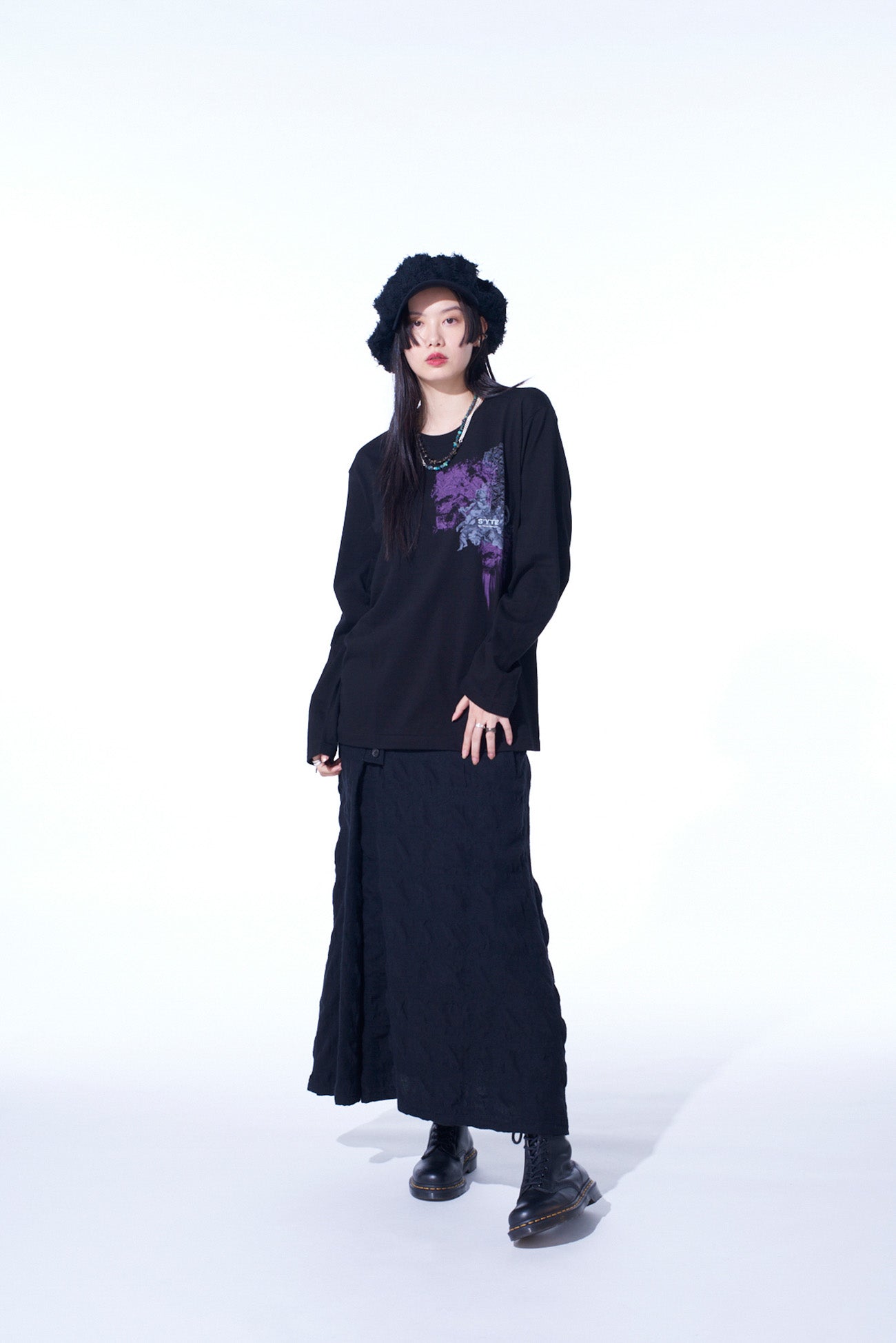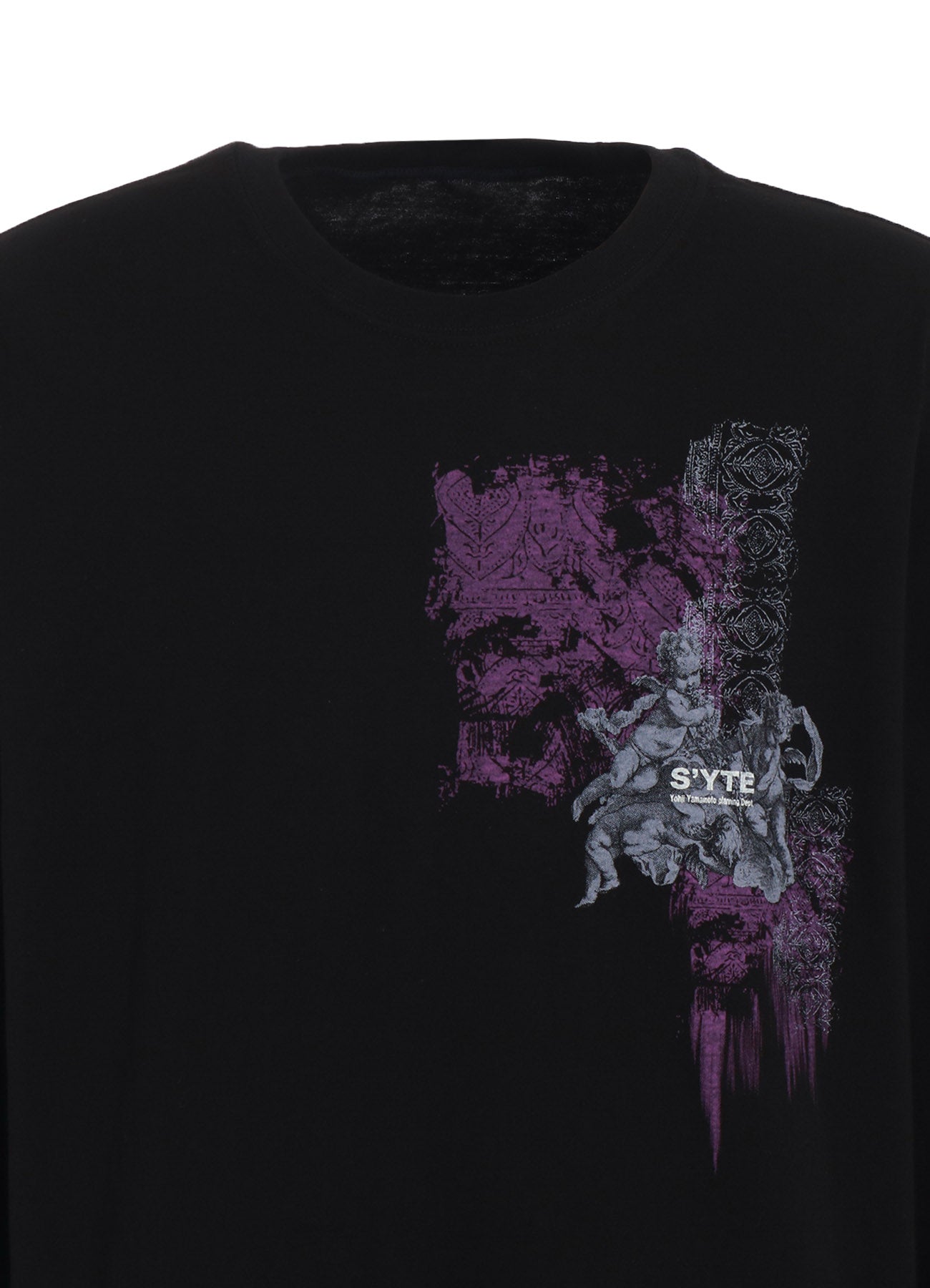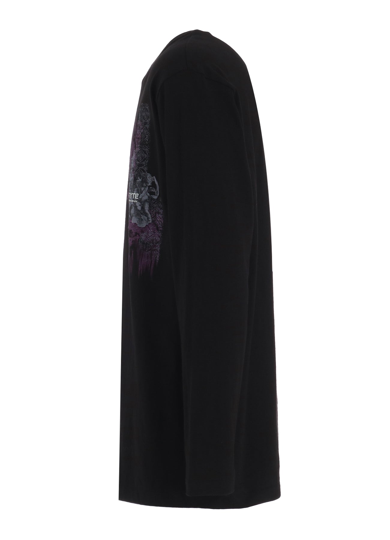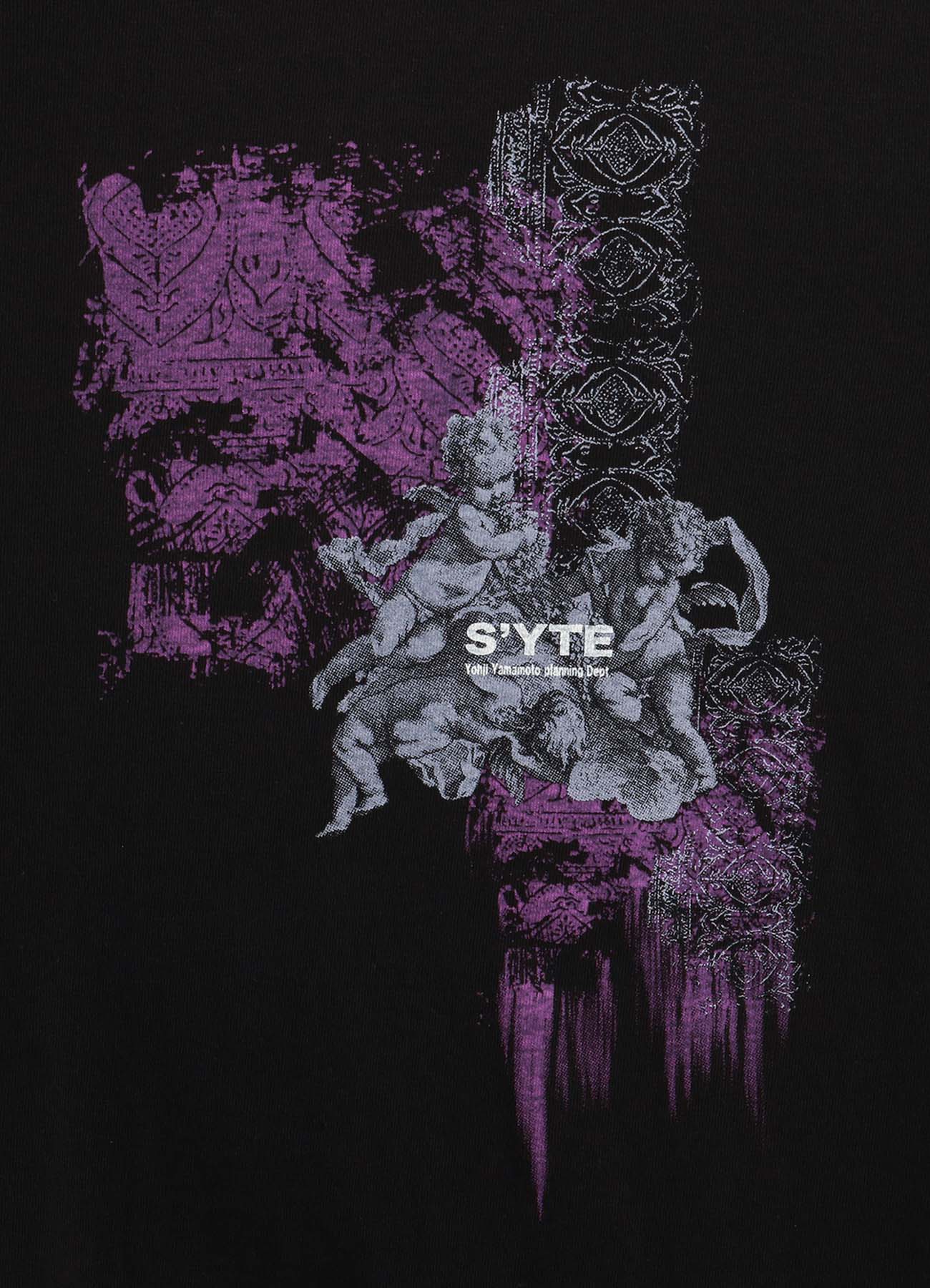 灰色调的天使图案印在黑色底布上,搭配紫色细节,为任何服装增添风采。这款上衣适合单穿或作为内穿,使用久米纺织特别制作的无侧缝设计,确保穿着舒适。提供多种尺码,以适应不同的风格偏好。