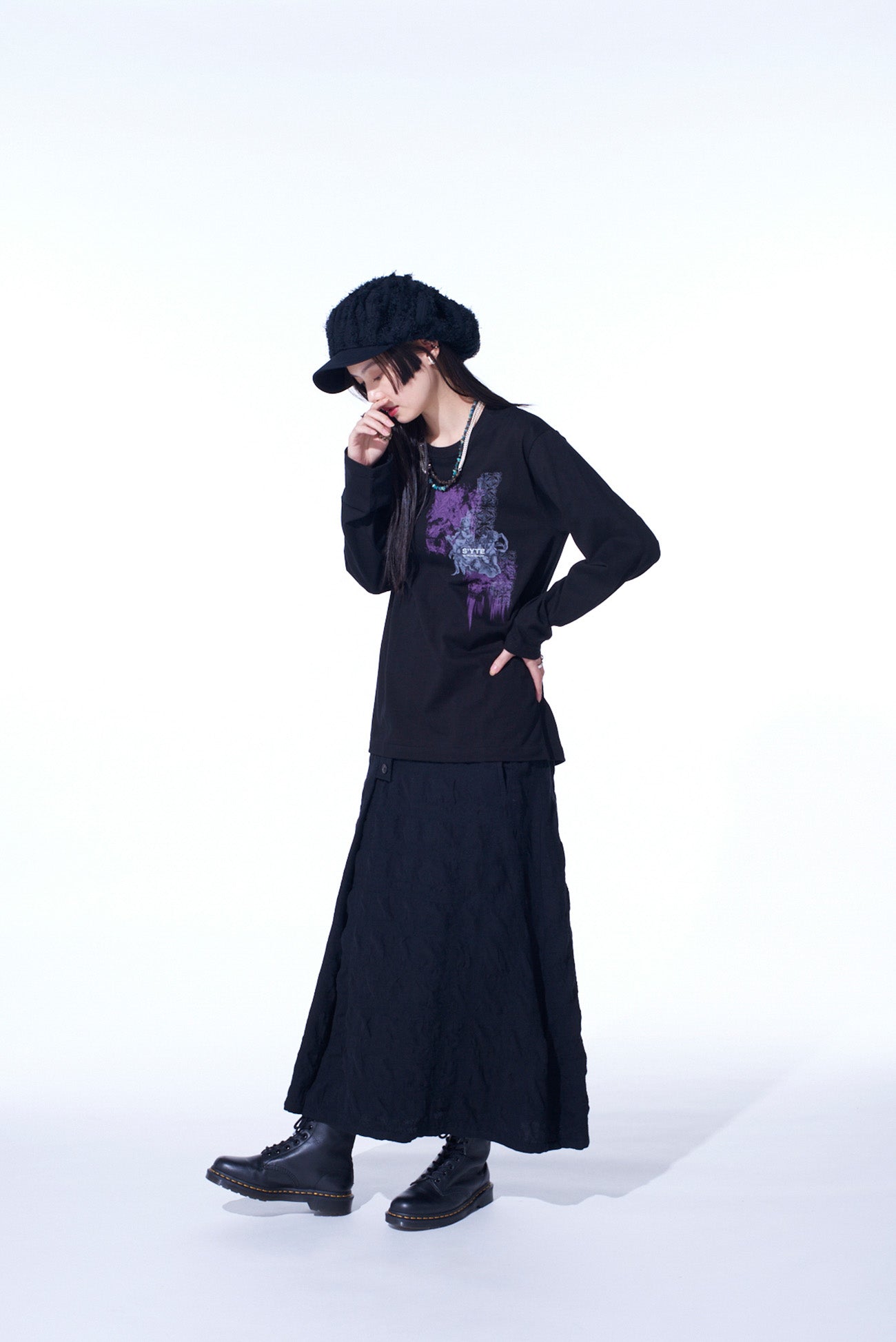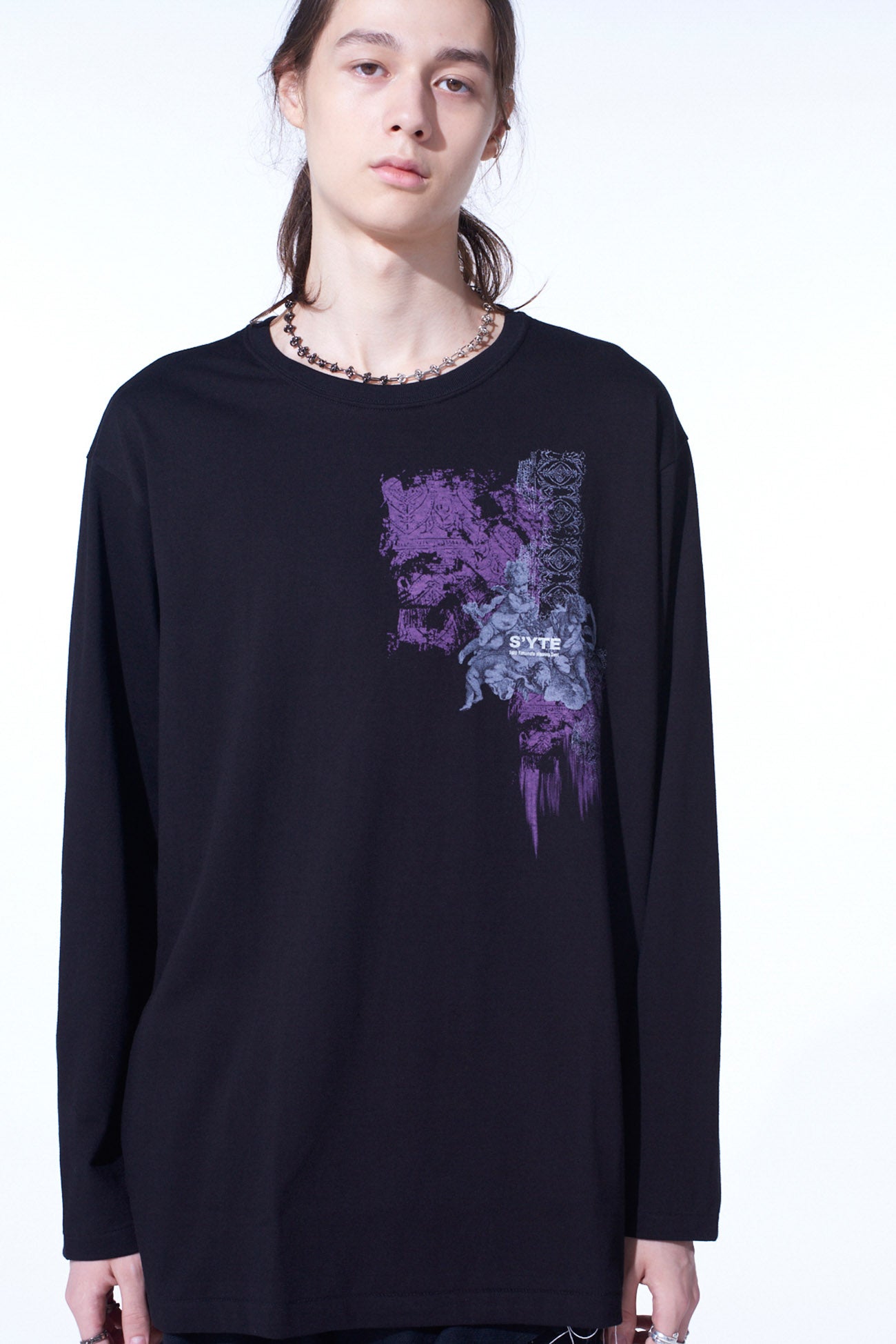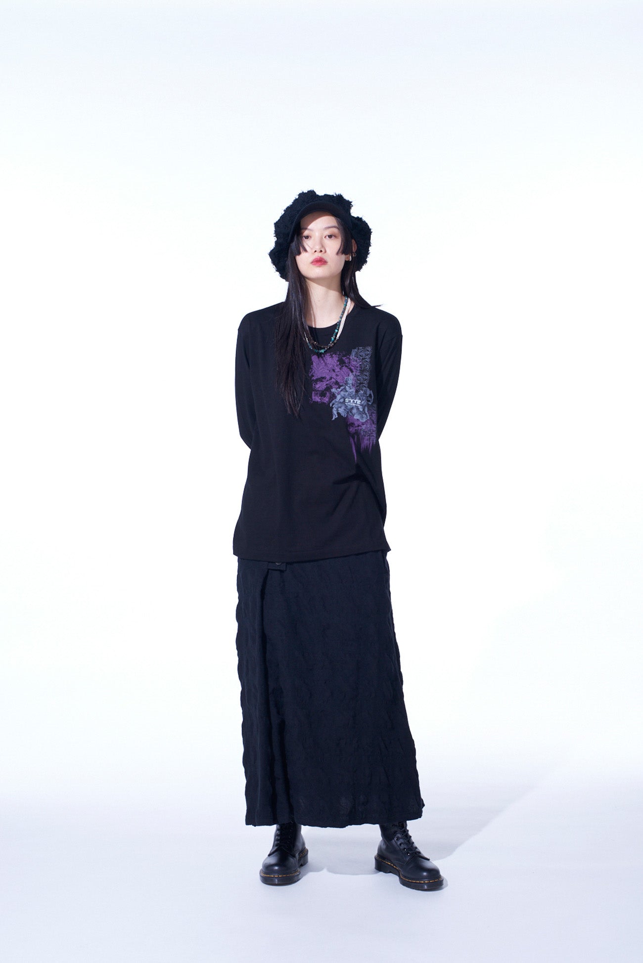 灰色调的天使图案印在黑色底布上,搭配紫色细节,为任何服装增添风采。这款上衣适合单穿或作为内穿,使用久米纺织特别制作的无侧缝设计,确保穿着舒适。提供多种尺码,以适应不同的风格偏好。