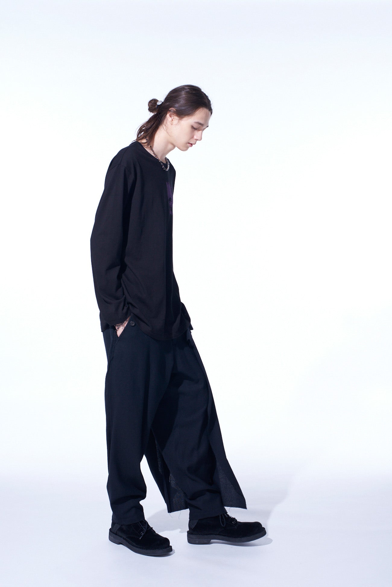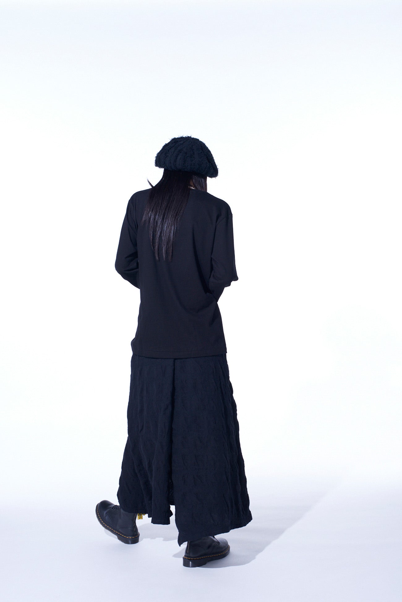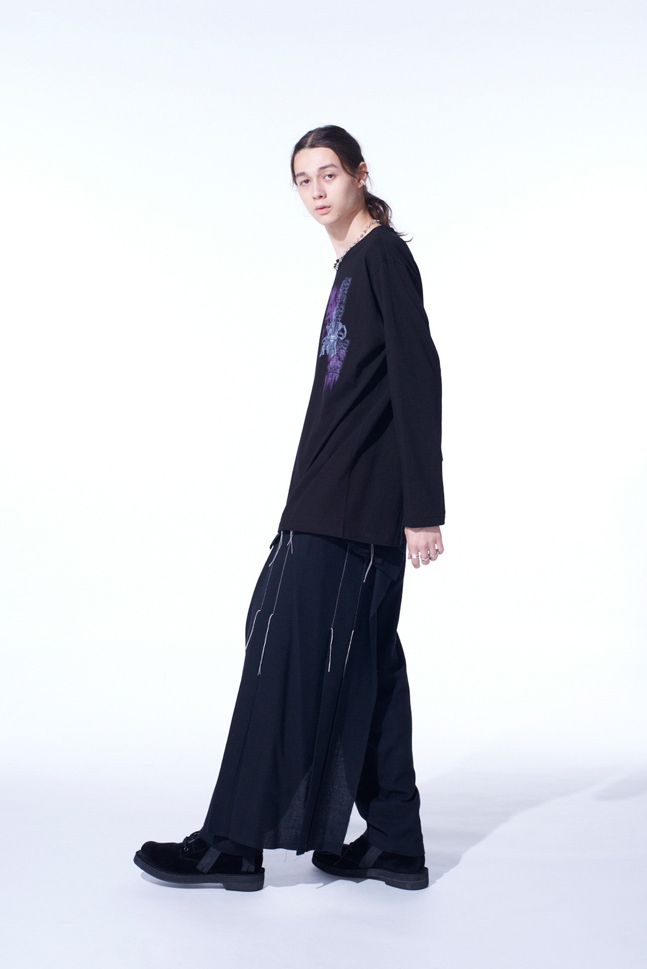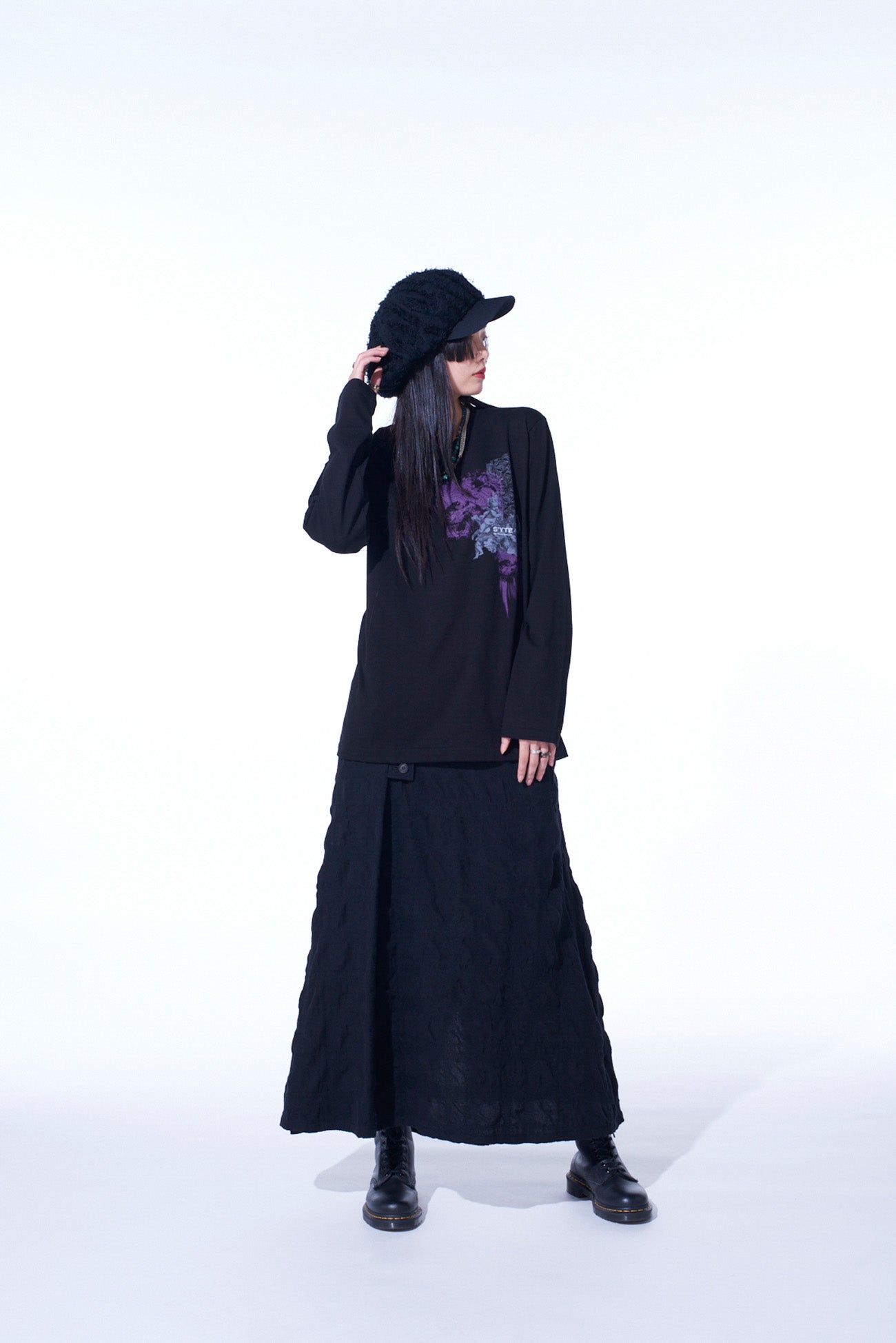 灰色调的天使图案印在黑色底布上,搭配紫色细节,为任何服装增添风采。这款上衣适合单穿或作为内穿,使用久米纺织特别制作的无侧缝设计,确保穿着舒适。提供多种尺码,以适应不同的风格偏好。