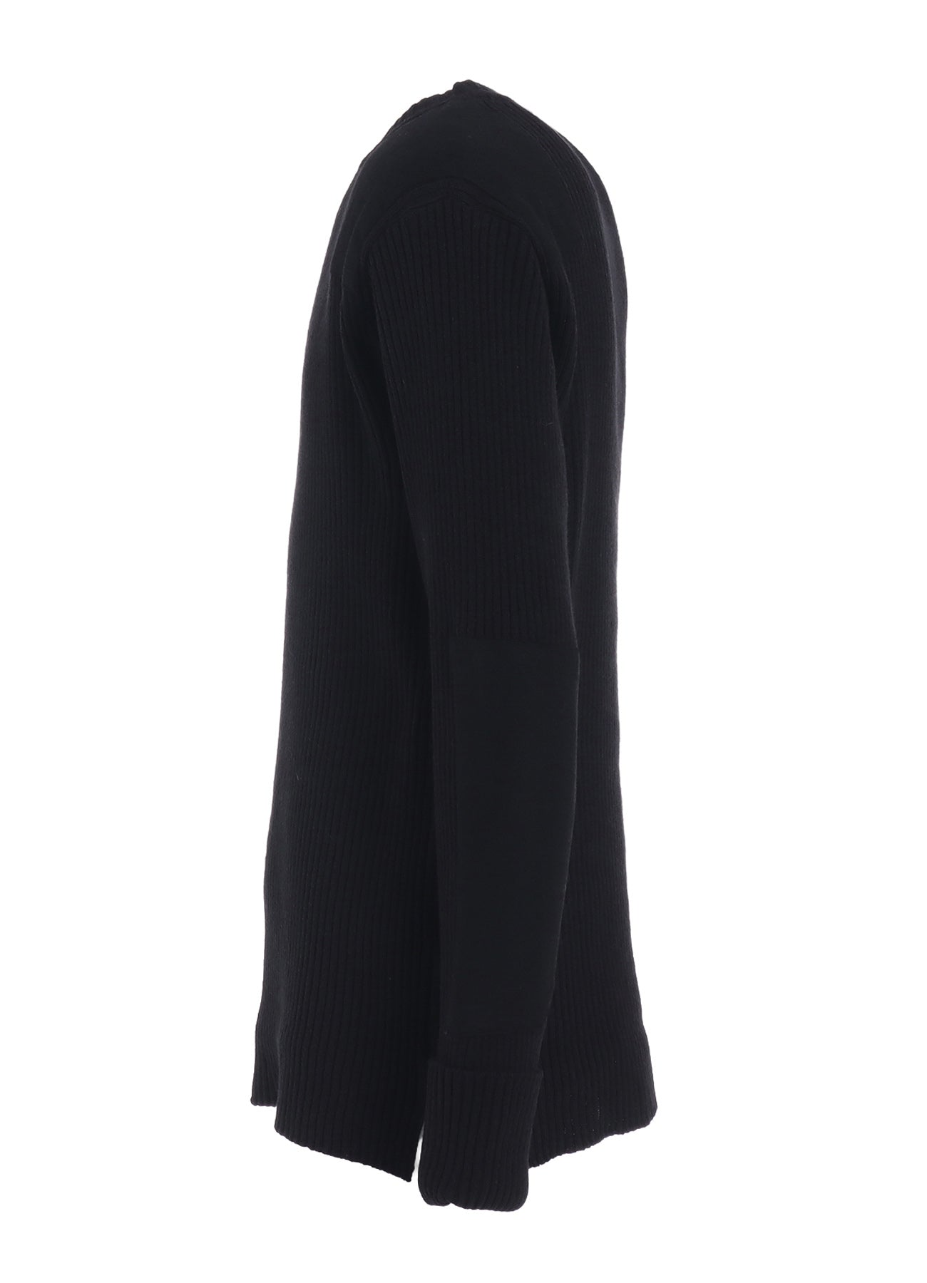 A pullover featuring chunky 7-gauge wool-cotton blend yarn with striking rib knitting. The blend of wool's insulation and cotton's softness ensures warmth in fall and winter. Flannel accents on shoulders/elbows enhance durability and style, while slits add flexibility. It offers a relaxed yet fitted silhouette, suitable for layering and versatile styling.