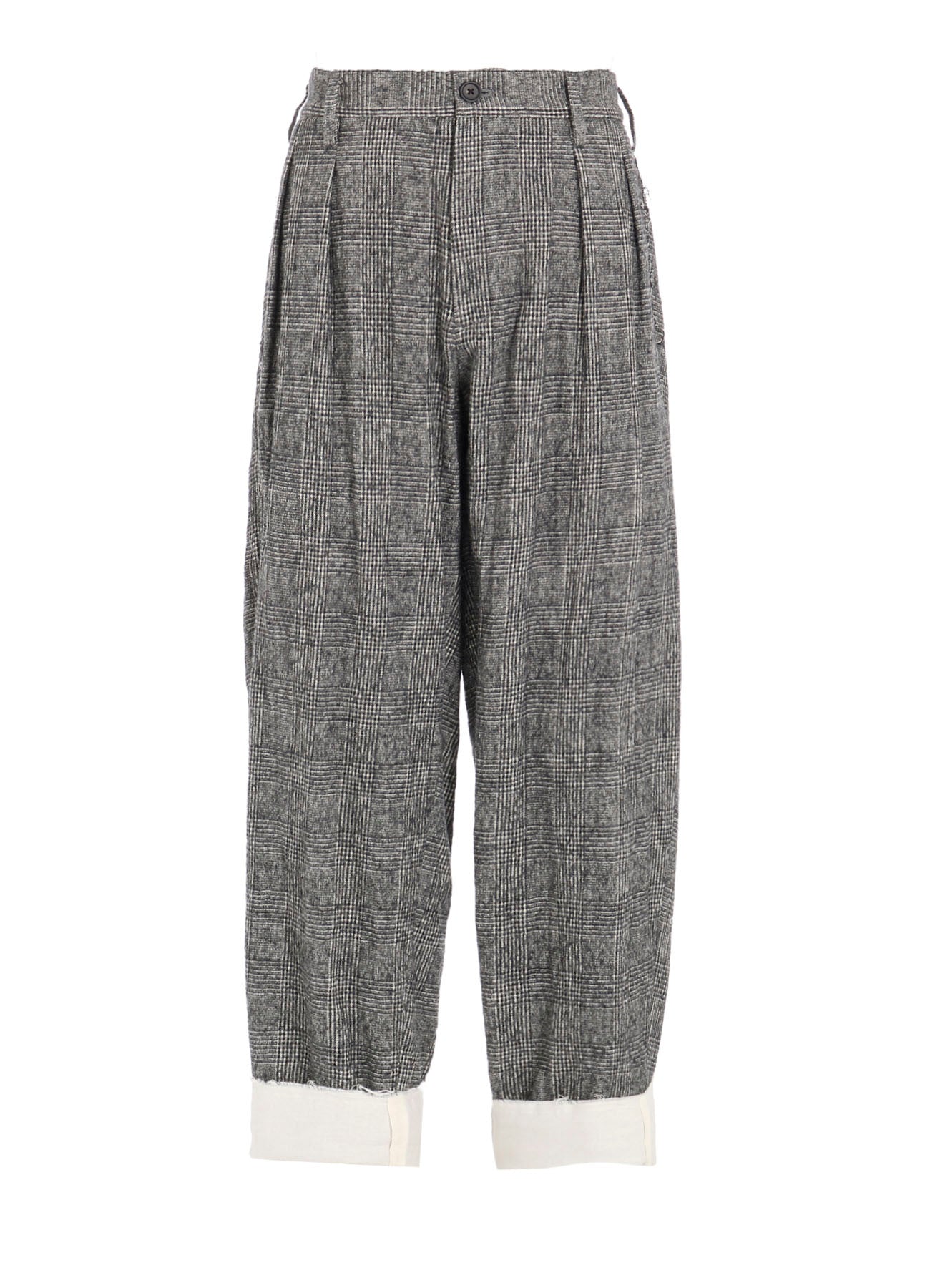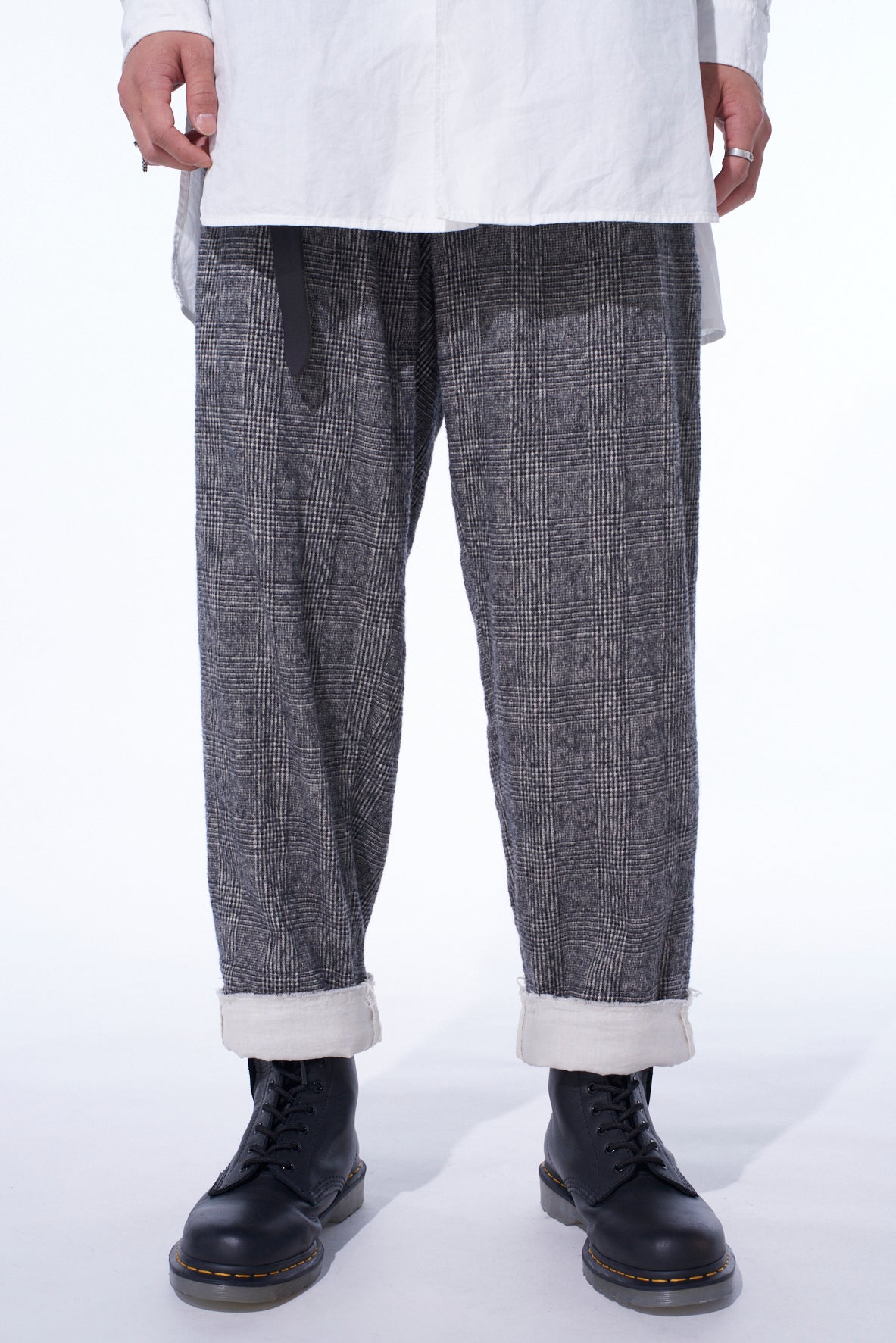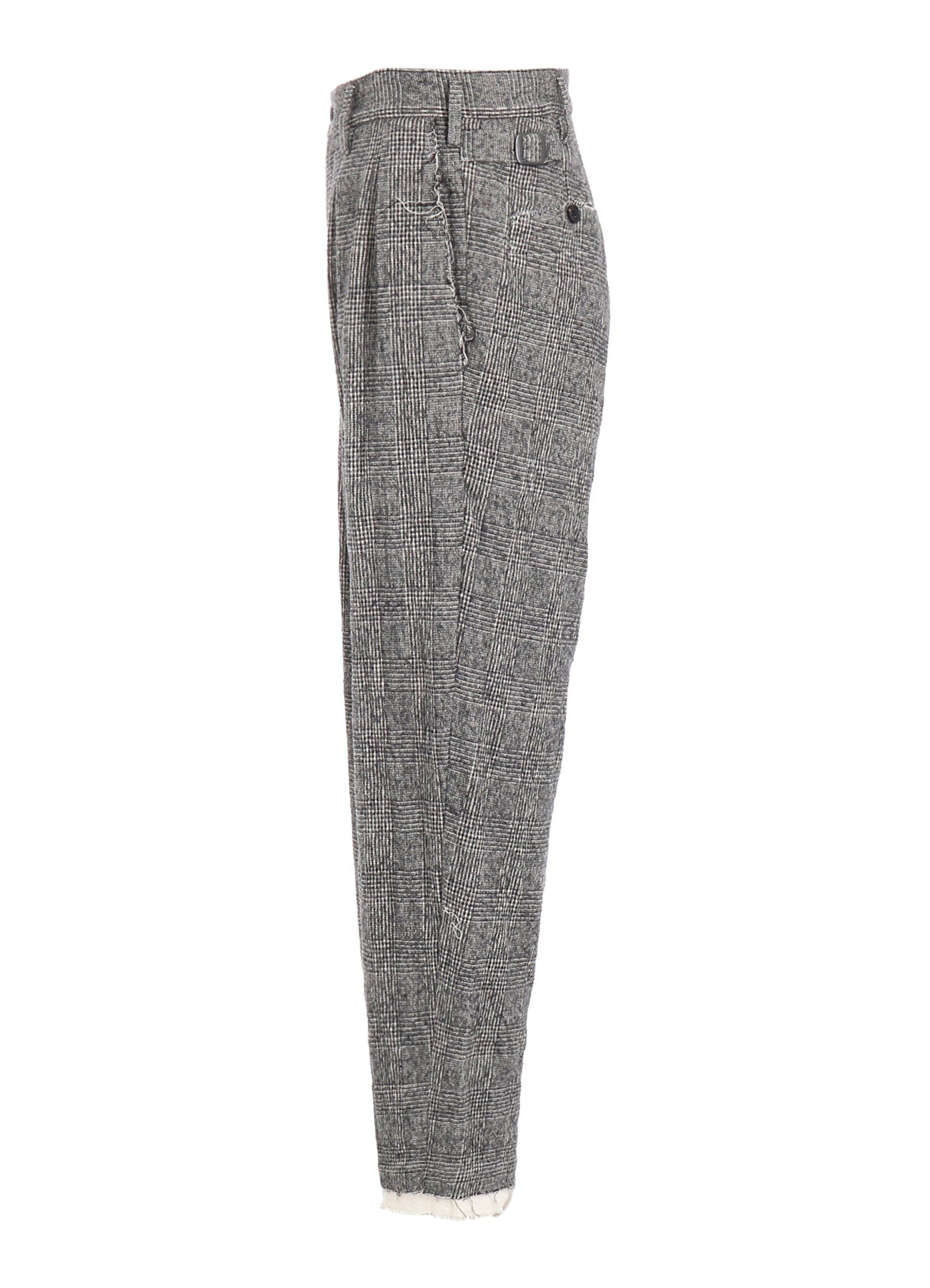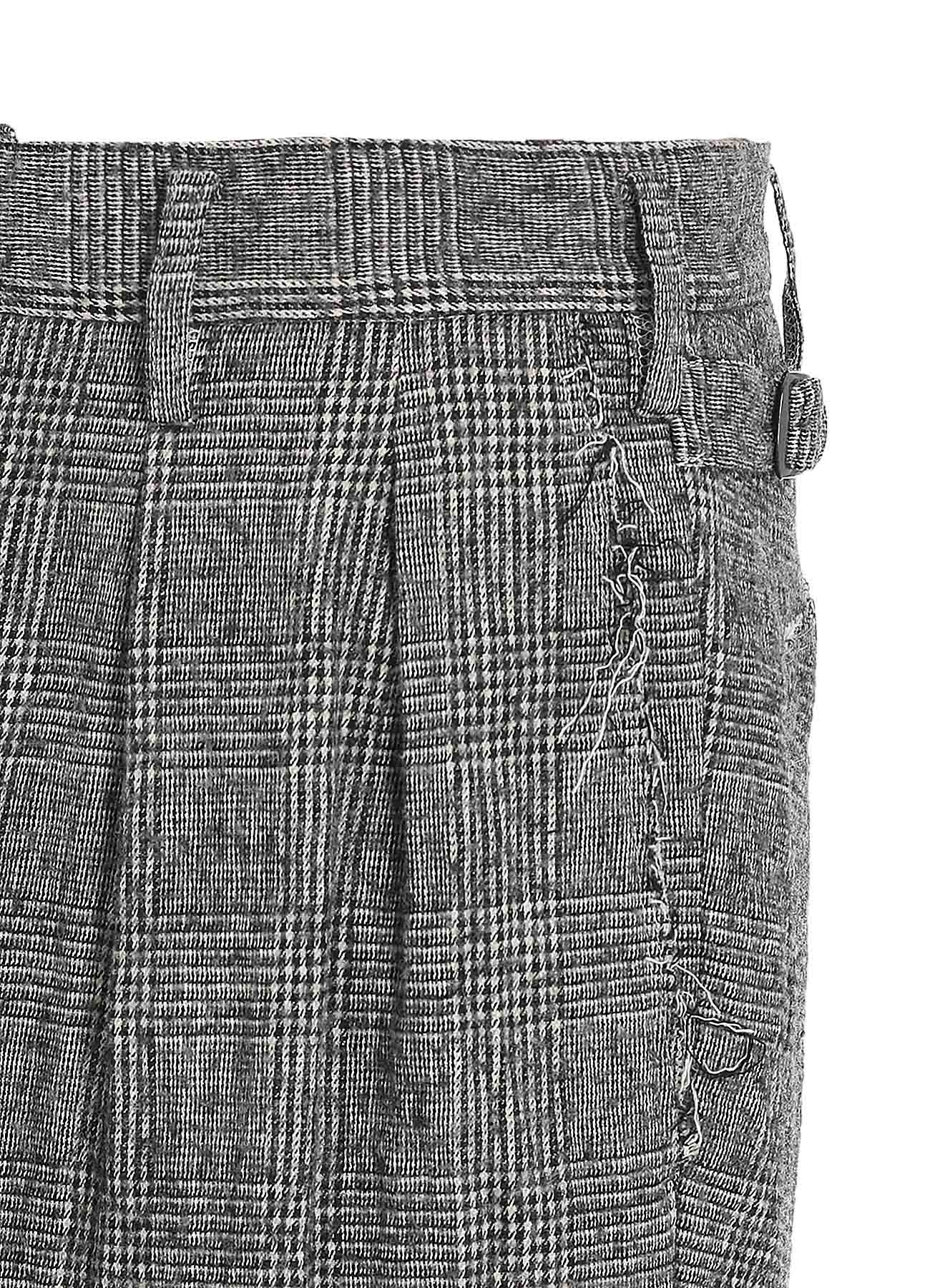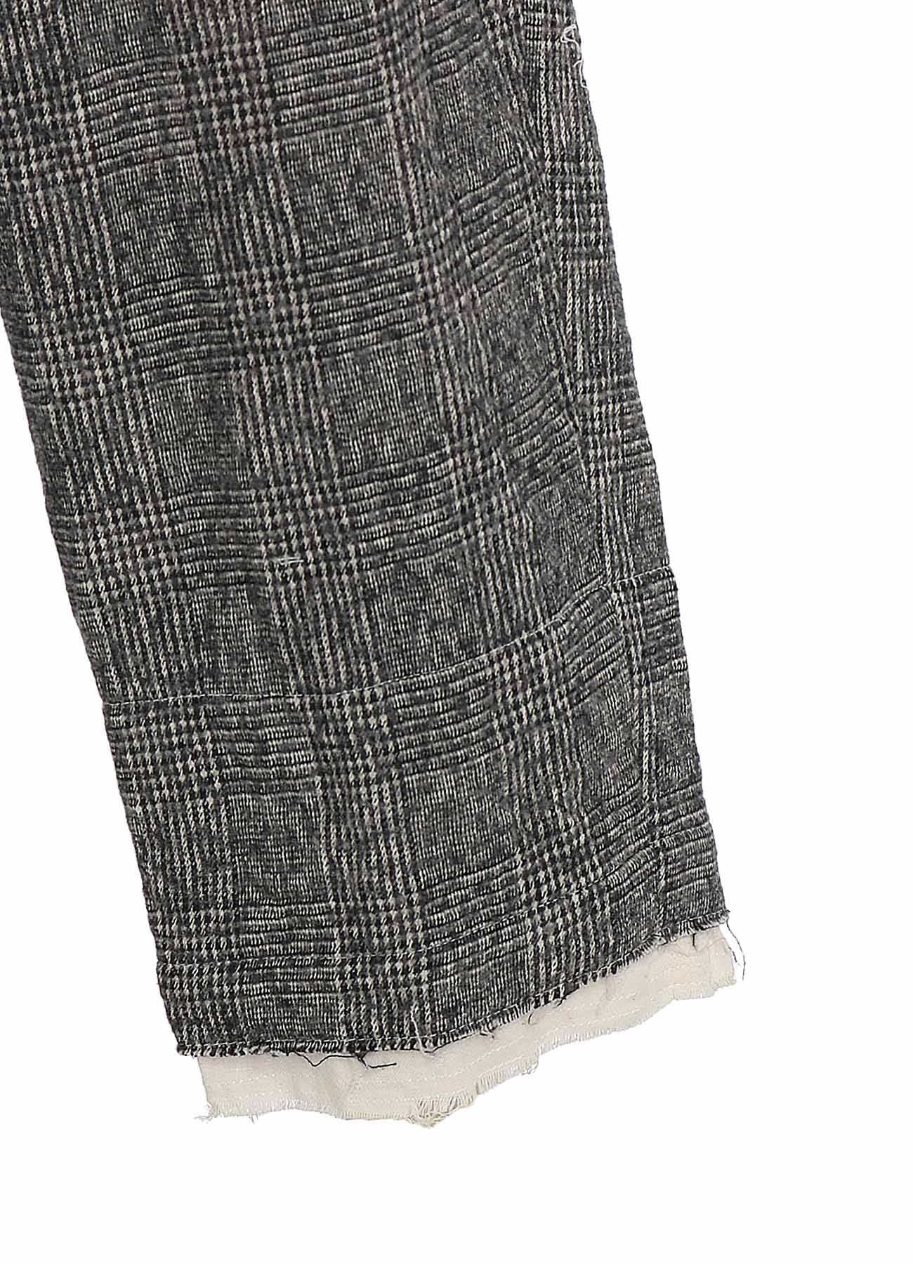 一款Glen plaid图案裤子,锥形剪裁,口袋开口和裤脚处有毛边细节,将经典与现代风格相结合。流畅的线条和随意的处理使整体造型完美平衡,为任何搭配增添一丝休闲优雅。