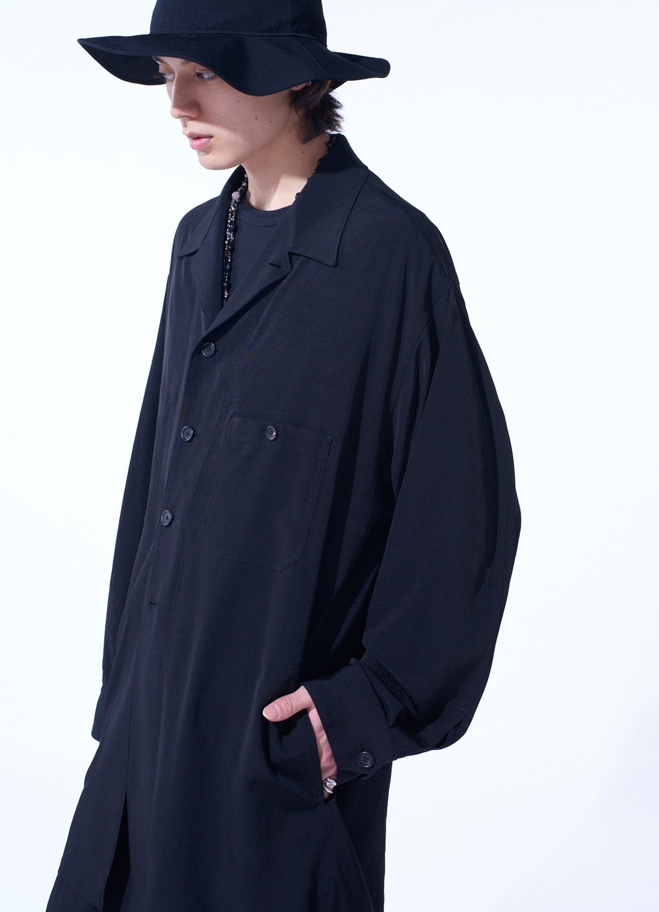 This oversized long shirt blouson, crafted from lightweight crepe de Chine, offers a soft texture and naturally draping fit. Its Cuban collar creates a clean neckline while chest pockets add an accent. Despite its workwear design, it exudes elegance.