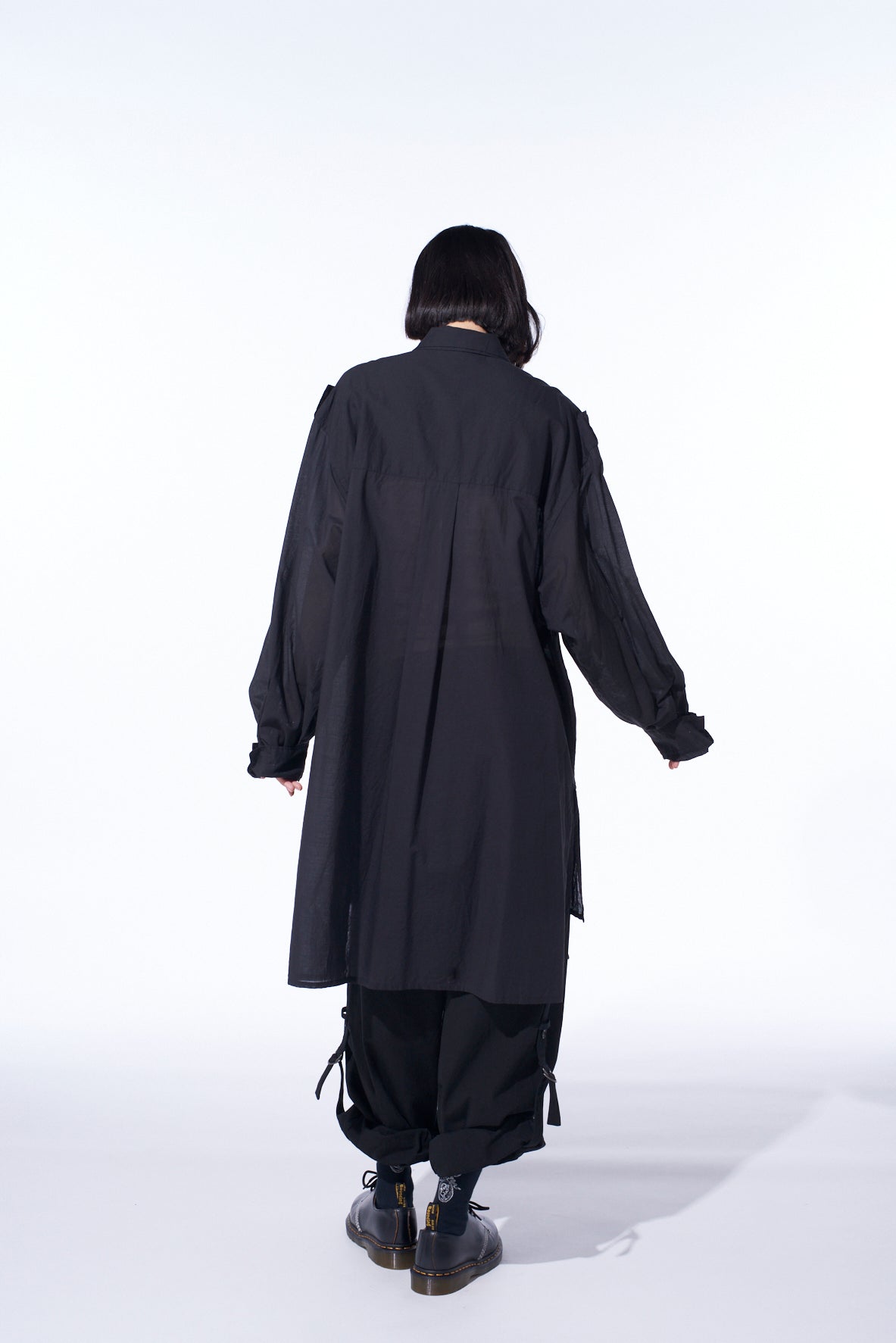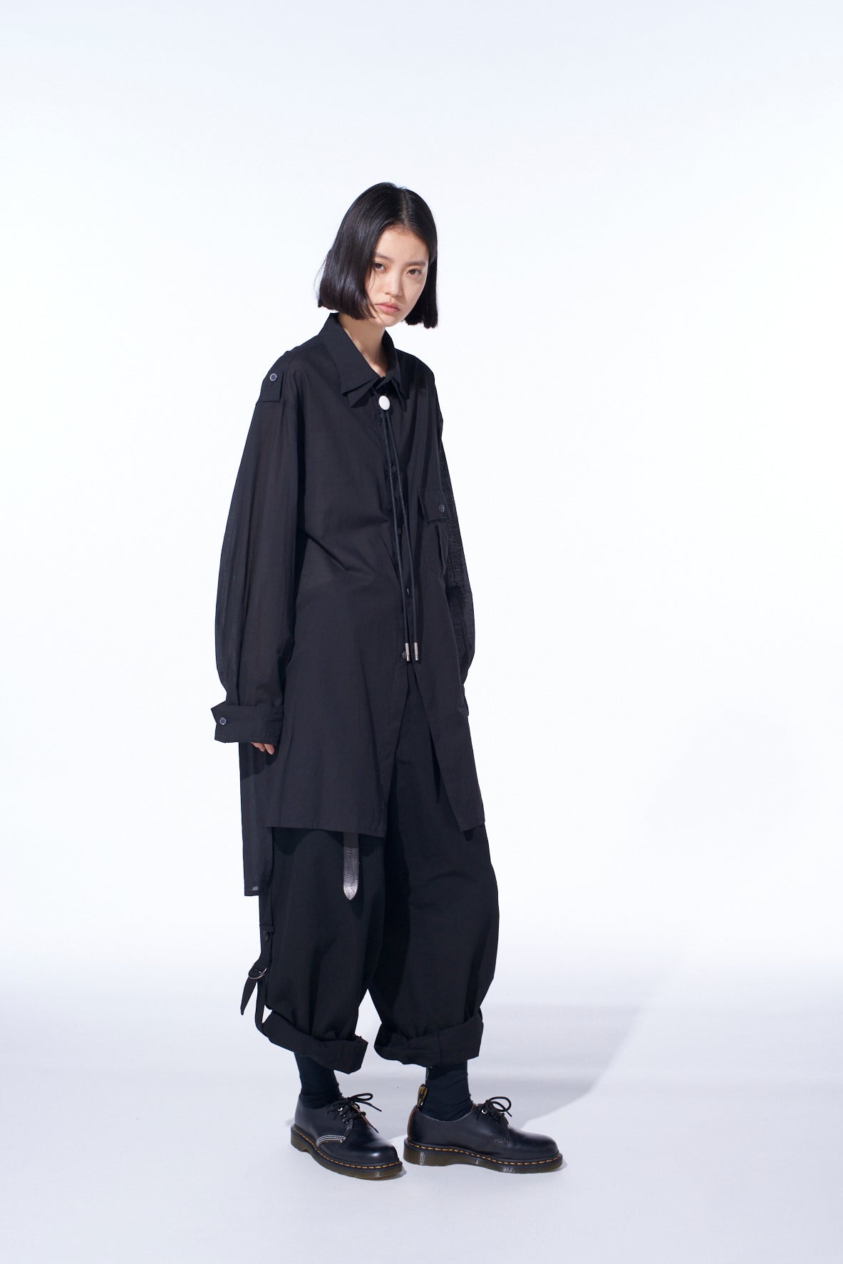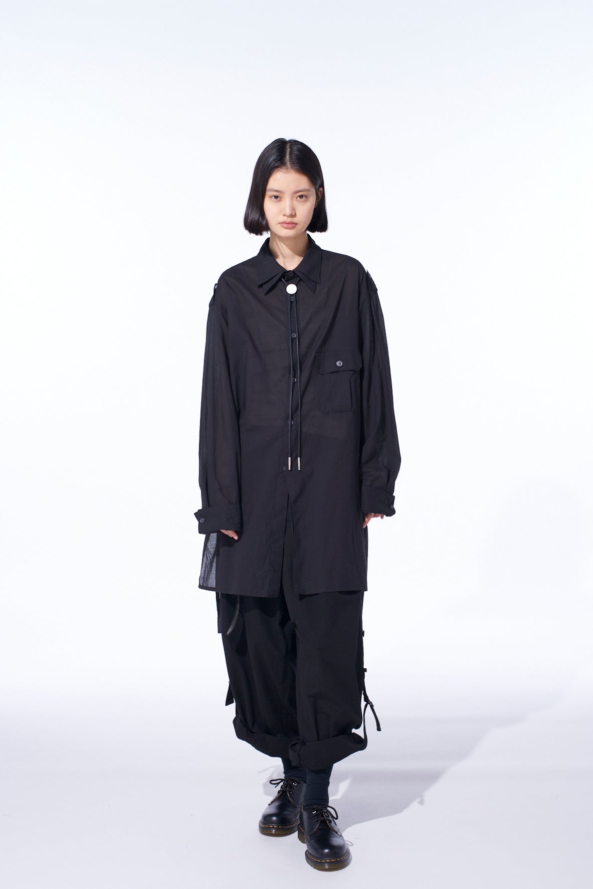 这款棉/丝薄纱衬衫具有透明柔软的质感,并采用双领设计。轻盈的轮廓与像S’YTE阔腿裤这样有体积感的下装搭配效果佳。肩章等军事风细节增加了吸引力。不对称下摆及深侧开衩提供多样化造型选择,带来舒适透气、光滑的穿着感受,非常适合温暖季节。