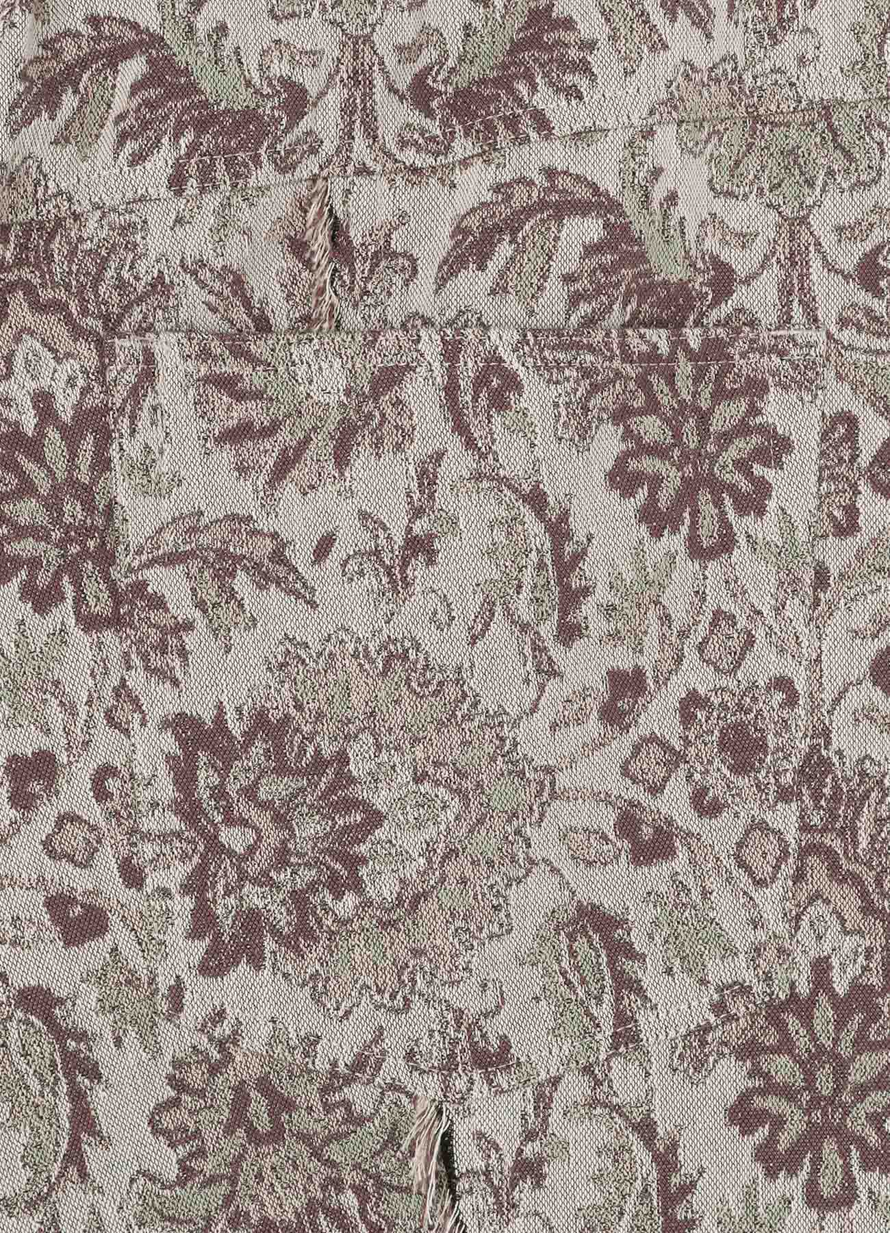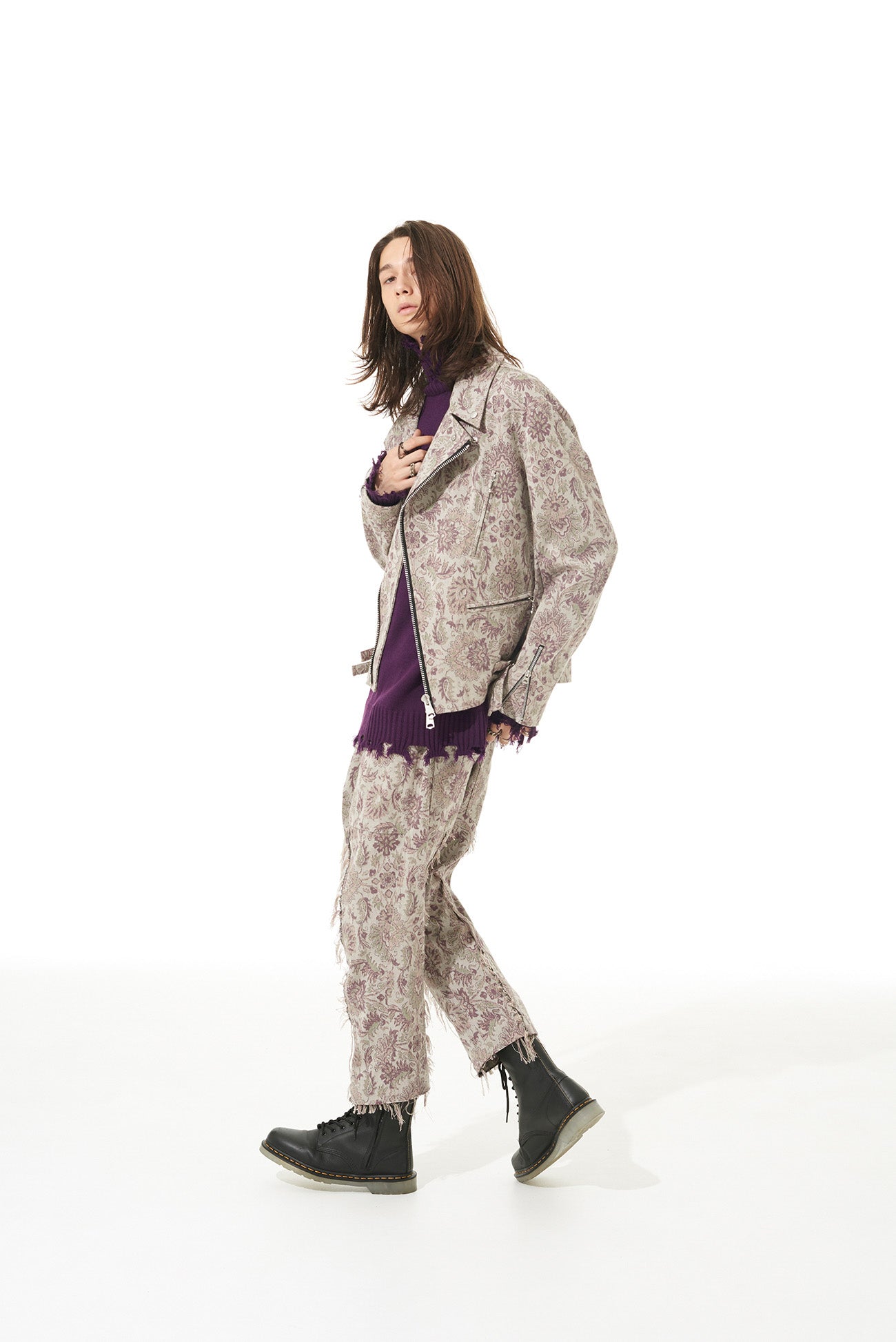 这些哈伦裤灵感来自Vintage哥布林挂毯,通过立体剪裁结合了修身轮廓和灵活性。面料采用精致而奢华的花卉提花,和毛边设计增添了一丝朋克风。烟熏色调与本季的关键颜色紫色相得益彰。