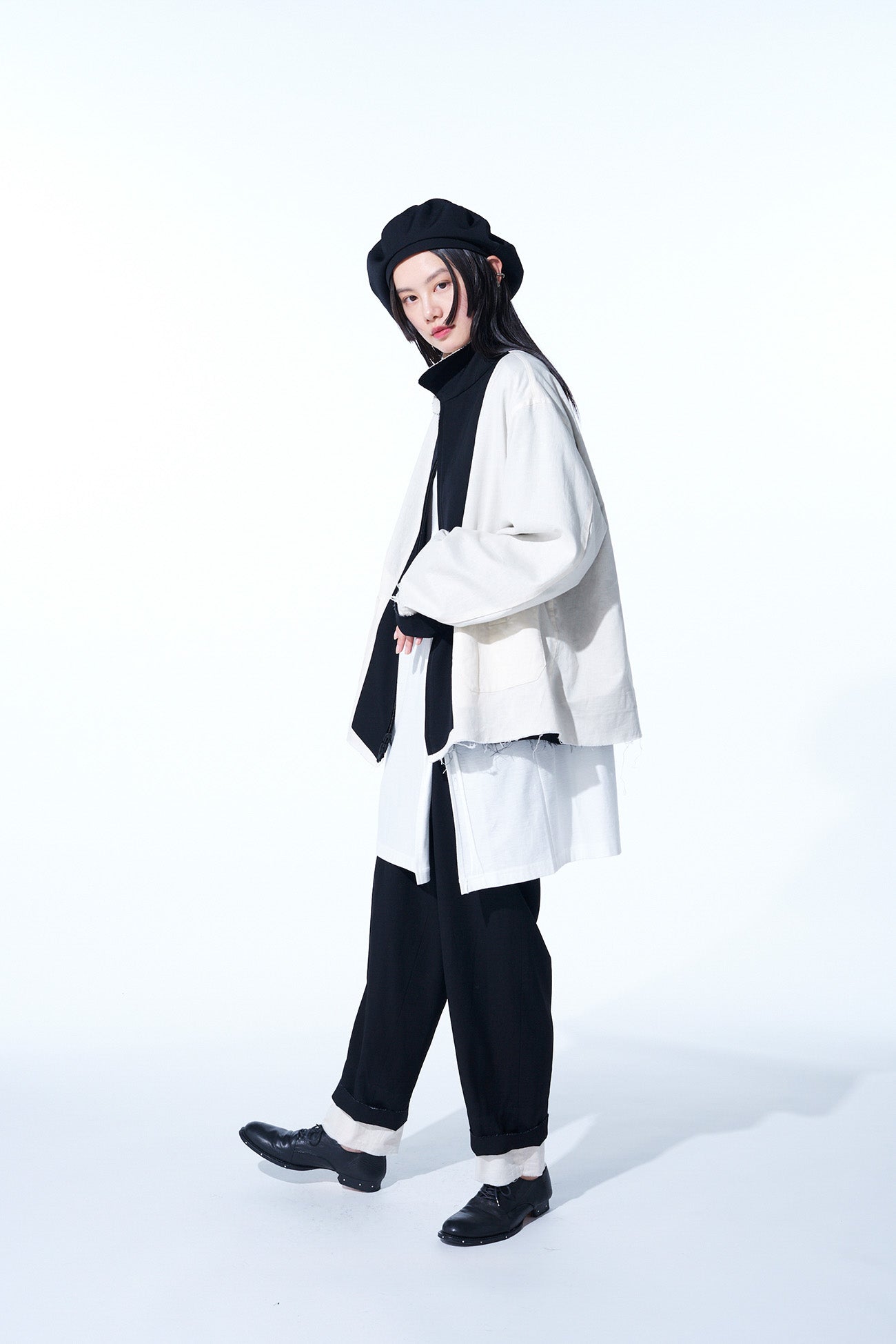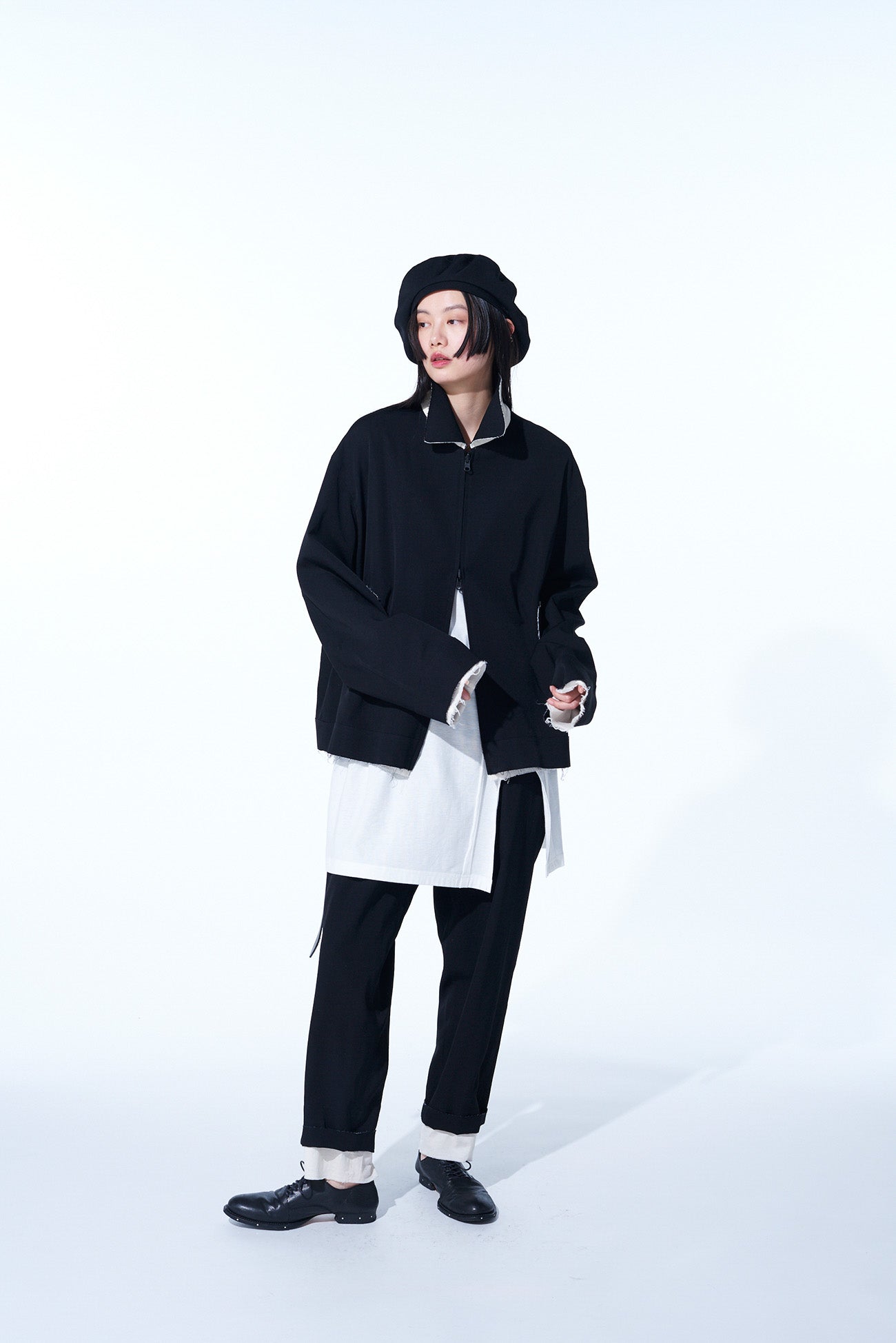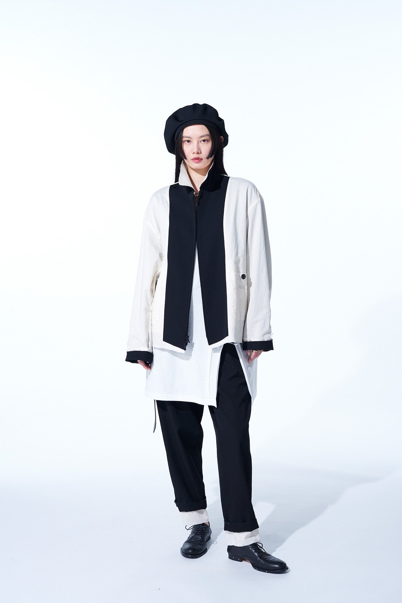 一款引人注目的超大短款外套,配有单拉链,采用黑色和象牙白的单色调色板以及生边设计细节。采用羊毛斜纹布,提供可翻转的结构,增强了造型的多样性。宽松的超大版型确保舒适感,而独特的面料纹理则提供了独特的吸引力。