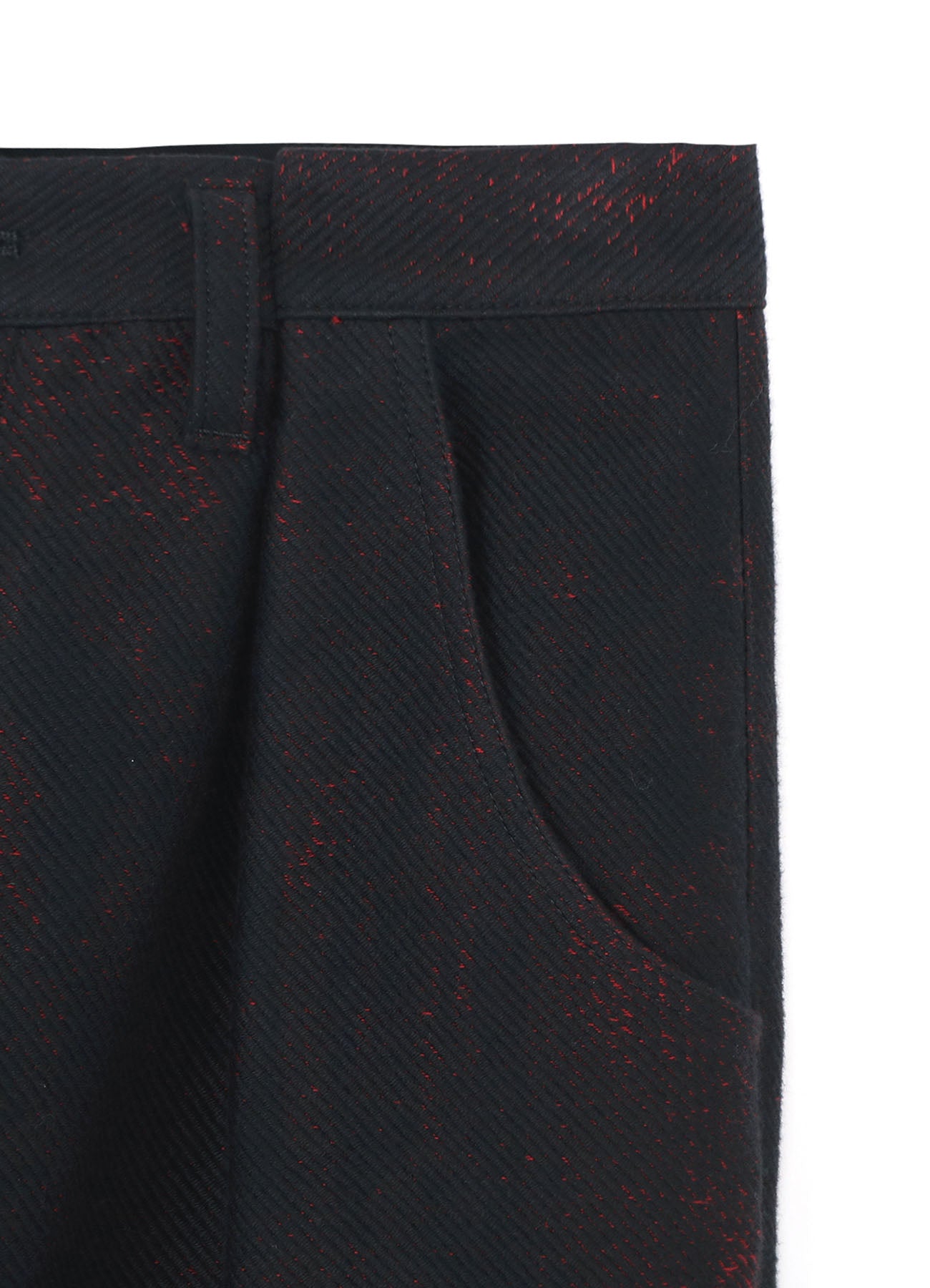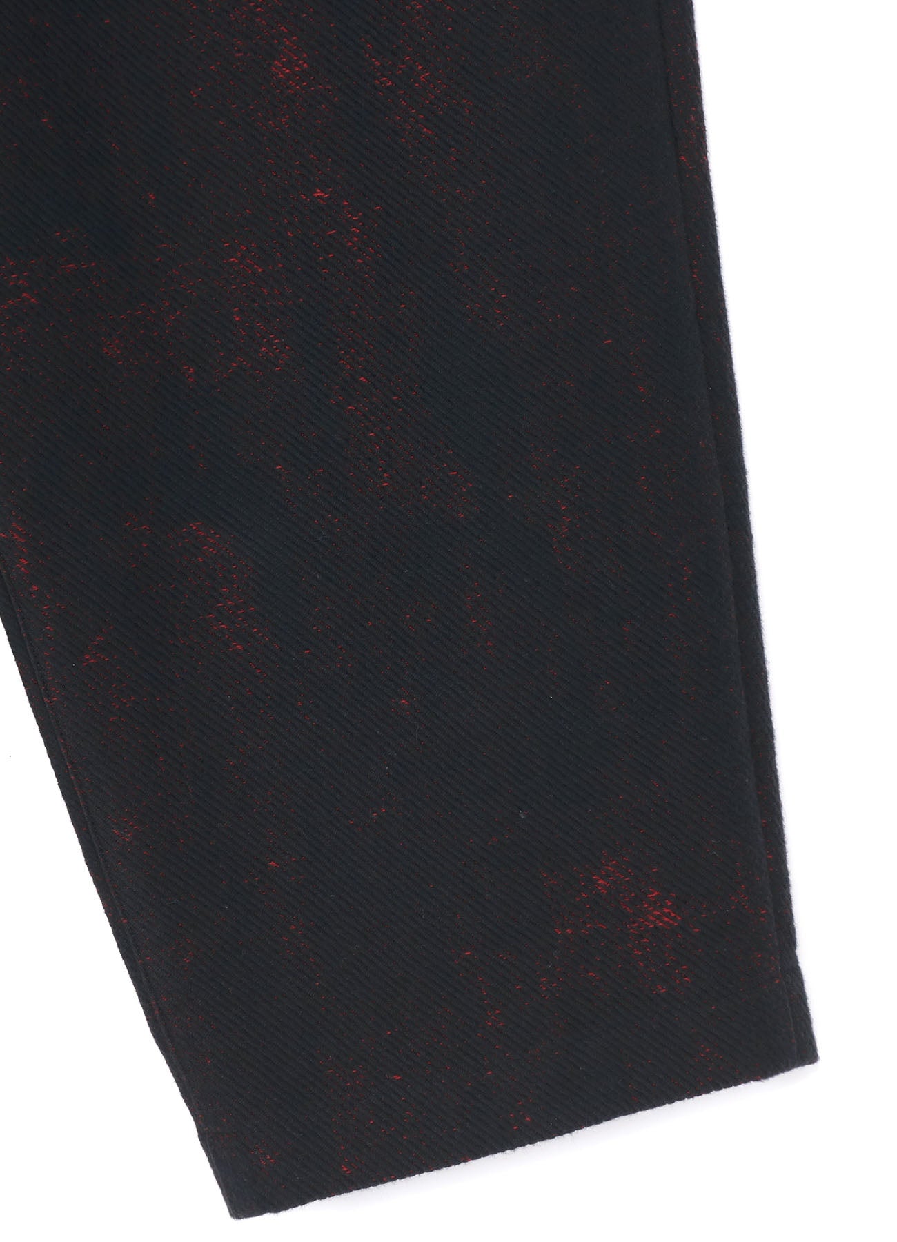 提花阔腿裤,饰有重叠复古印花。复杂的编织与黑色印花形成鲜明对比,营造出复杂的纹理。尽管廓形较宽,但褶皱腰部确保了合身的外观,增添了吸引力。