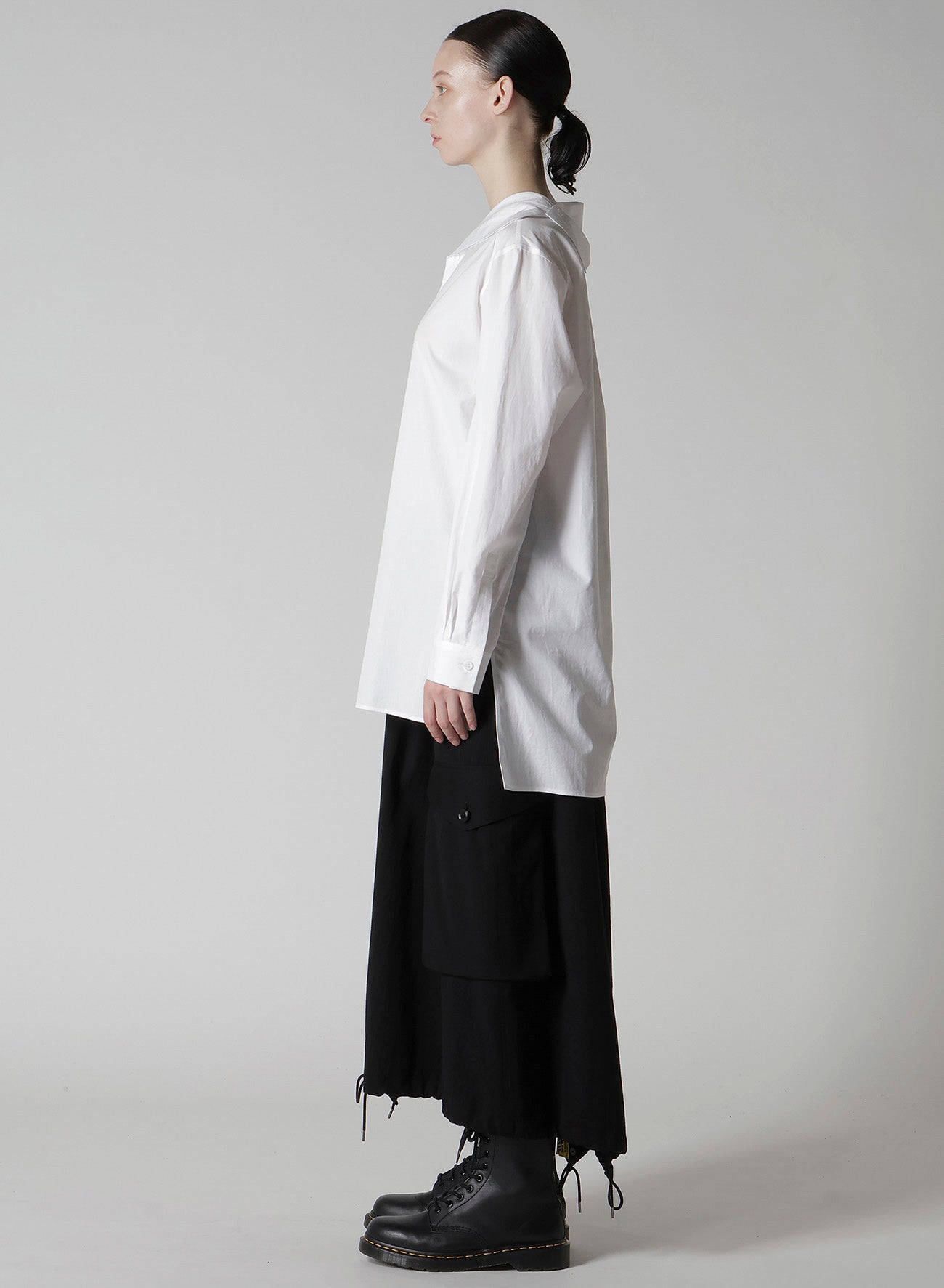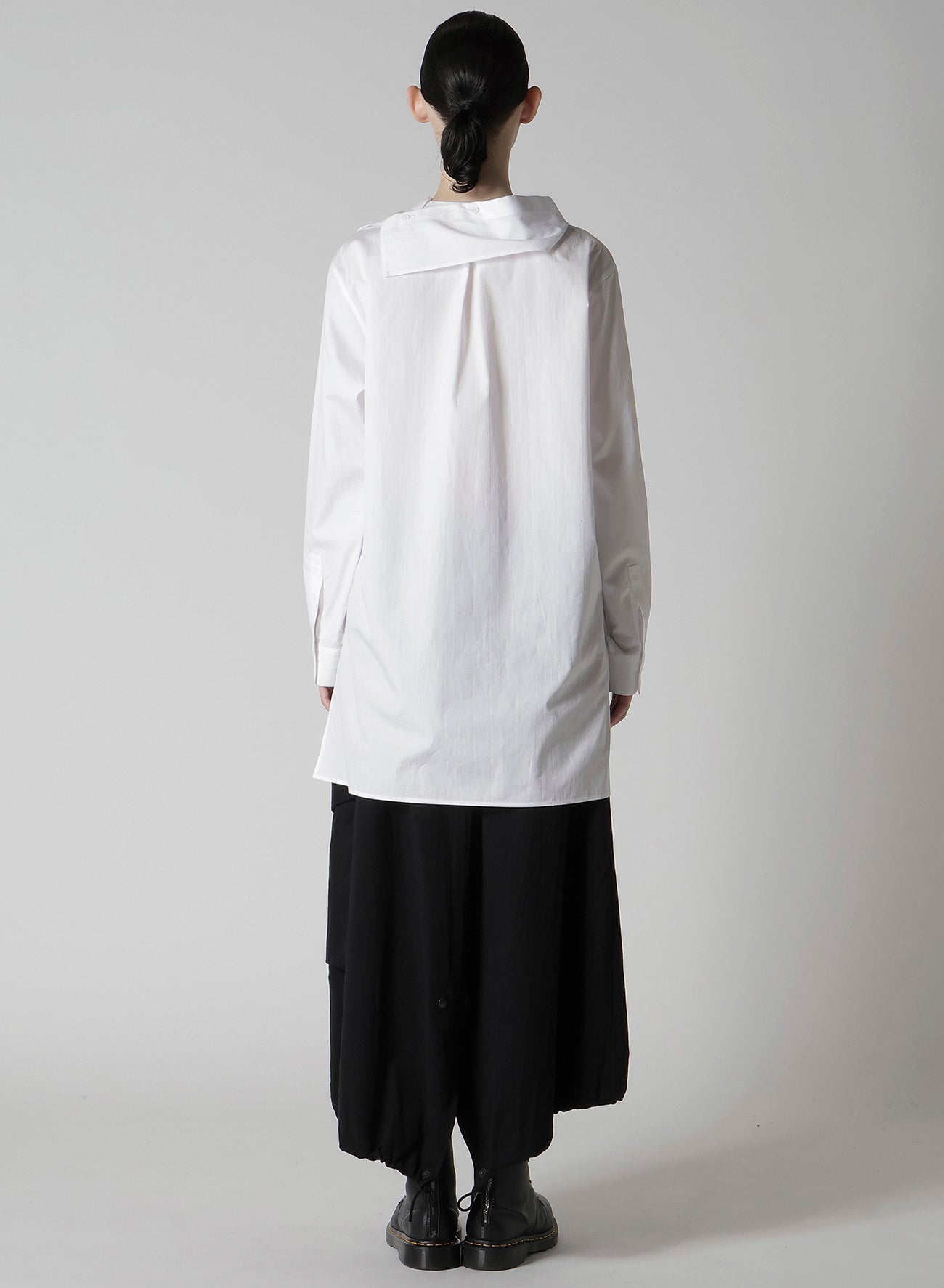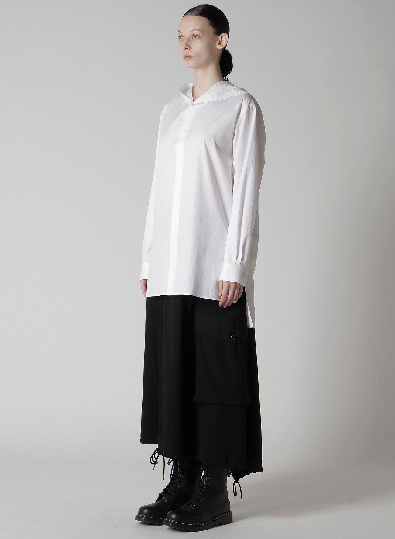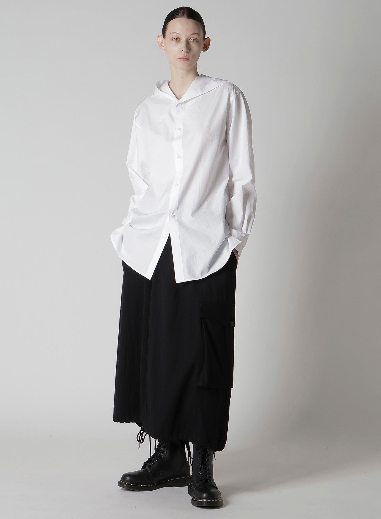 这款衬衫采用Y's标志性棉布制成,经过气旋处理,质地柔软轻盈,带有轻微褶皱。独特的领子从正面看像帽子,从背面看似水手领,穿在带肩带的连衣裙下时,是个完美的点缀。
