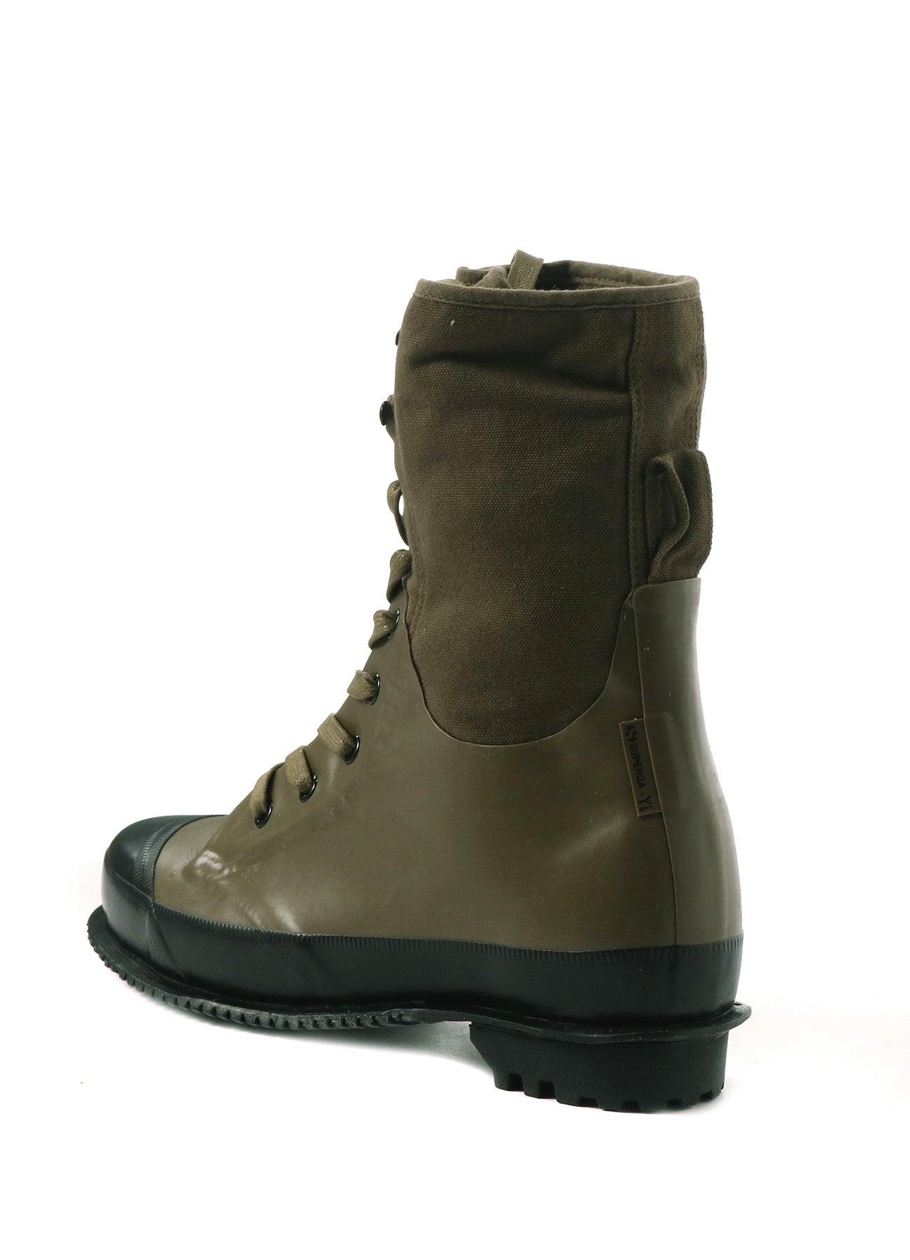 基于实际在意大利军队中使用的军用鞋的靴子,通过用橡胶覆盖到脚踝的高度,具有防水效果,也可以作为雨靴穿着。