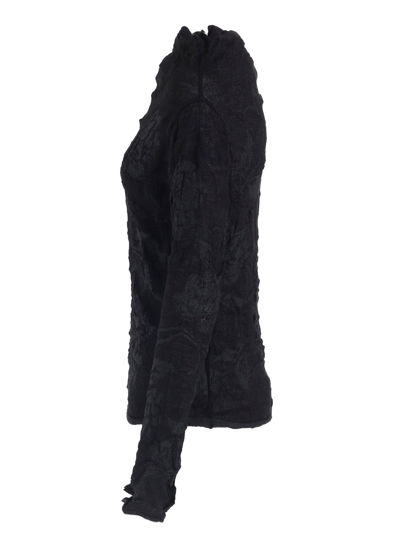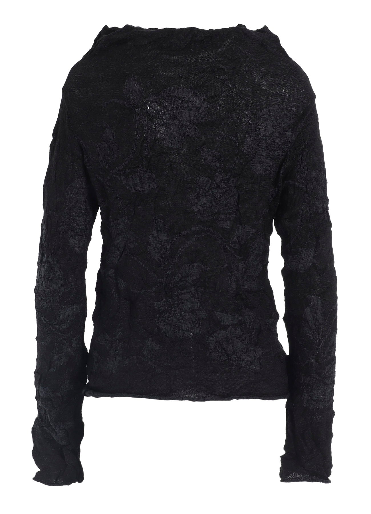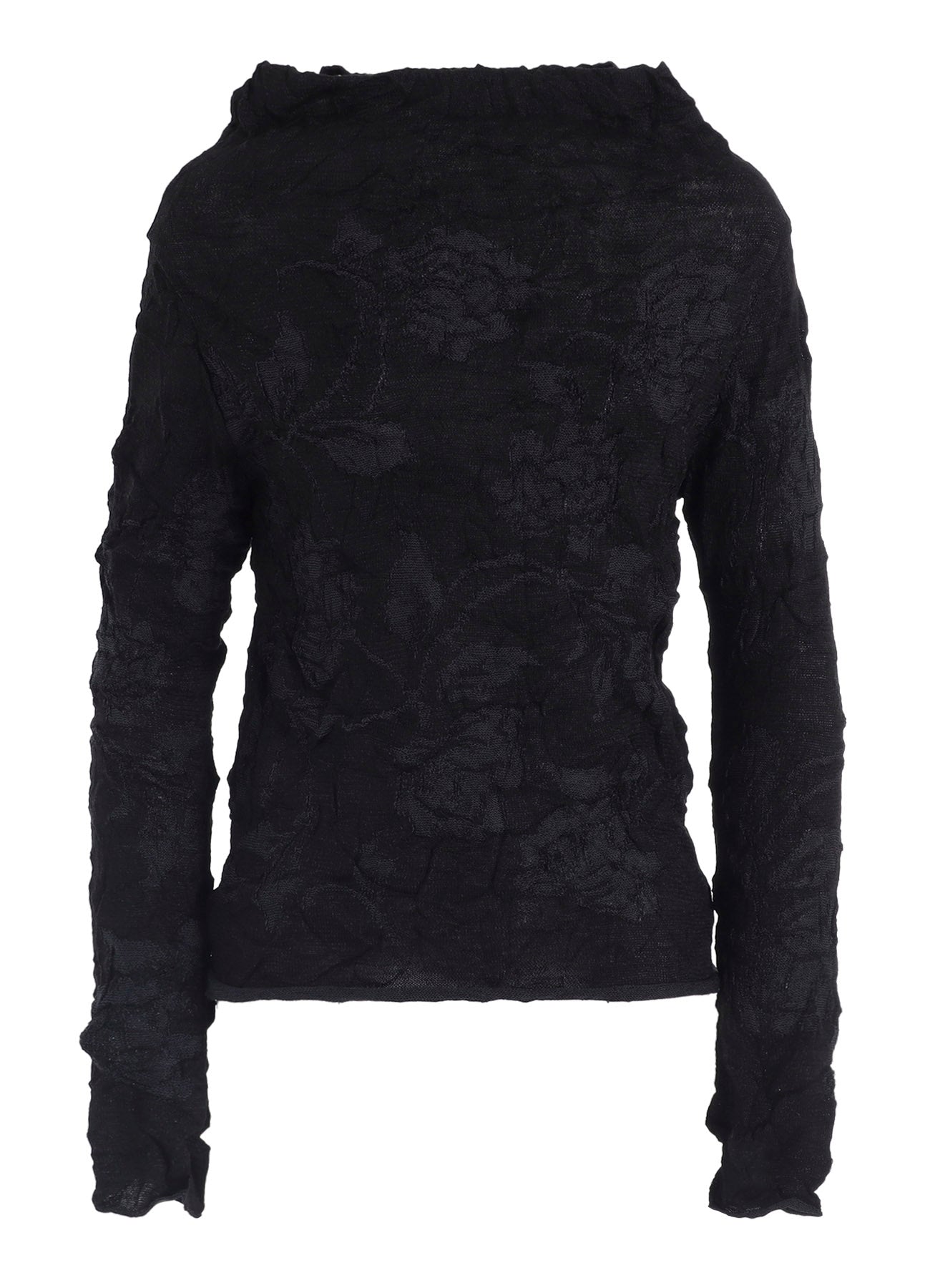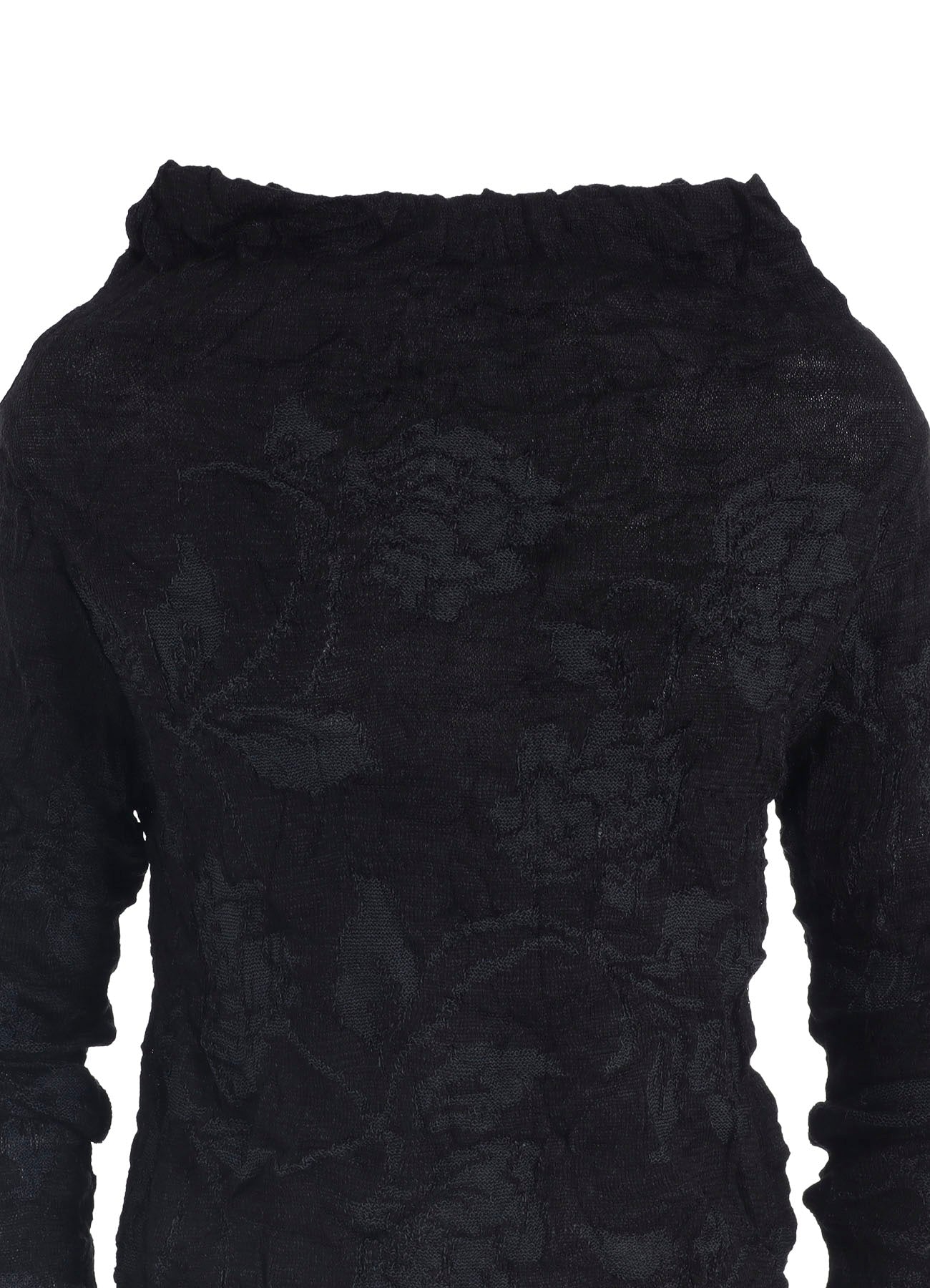 这款时尚的花卉图案套头衫采用了偏领设计和长袖,采用独特的皱纹效果通过连接针织制作。它提供了紧身的轮廓,同时领口更加宽松,展现出优雅的垂感。具备一定的弹性,非常适合内搭和多样化的搭配。