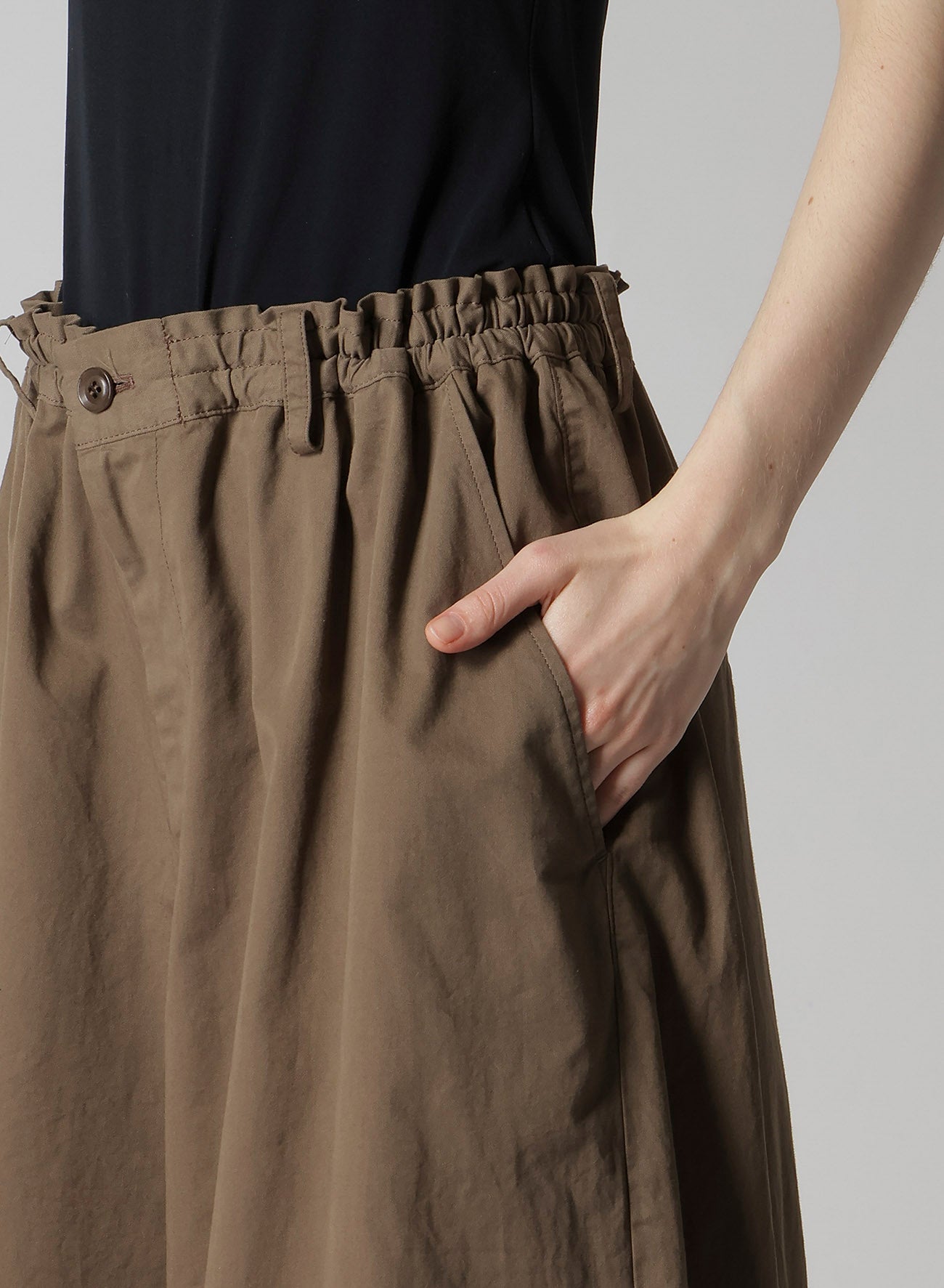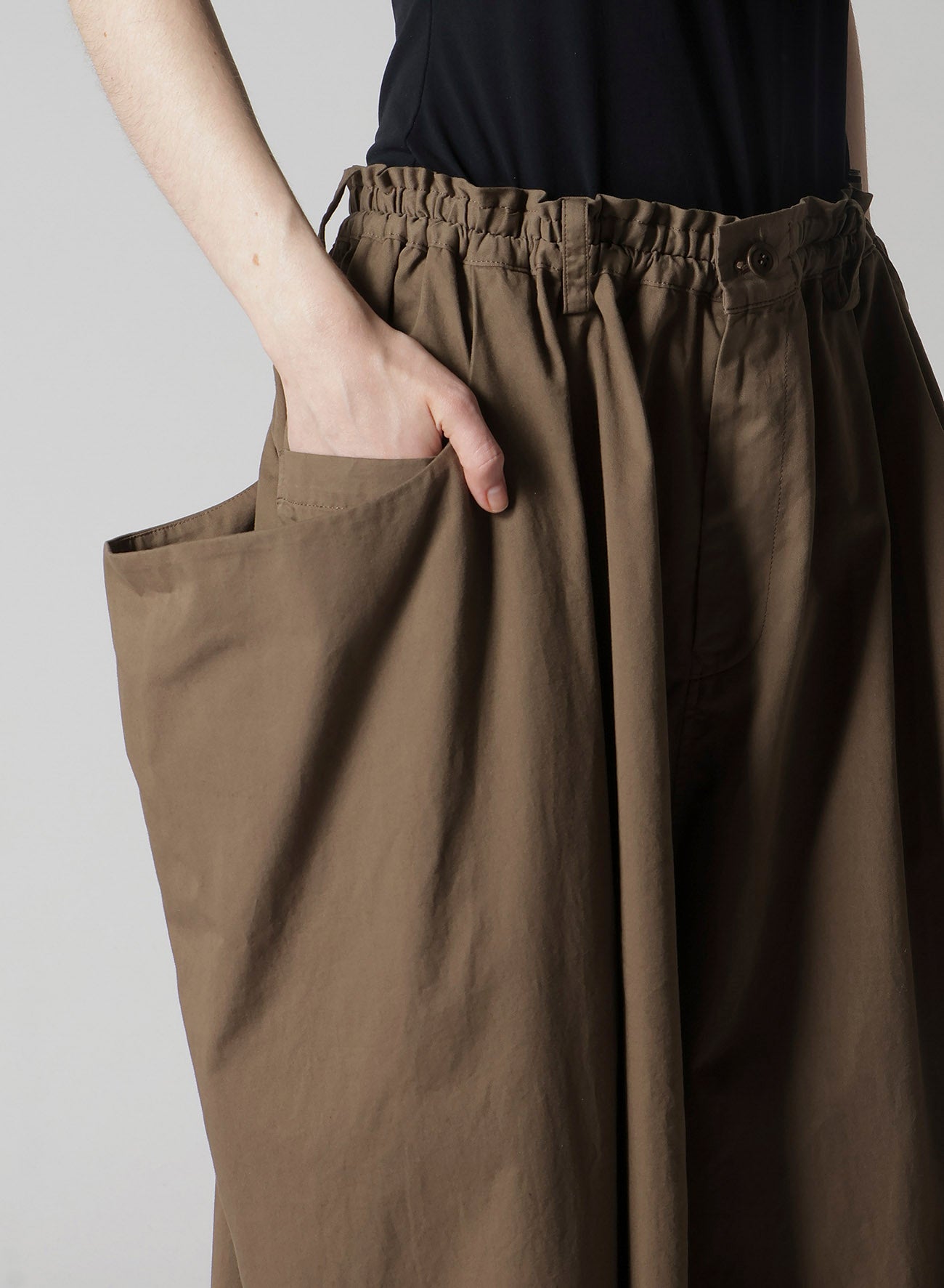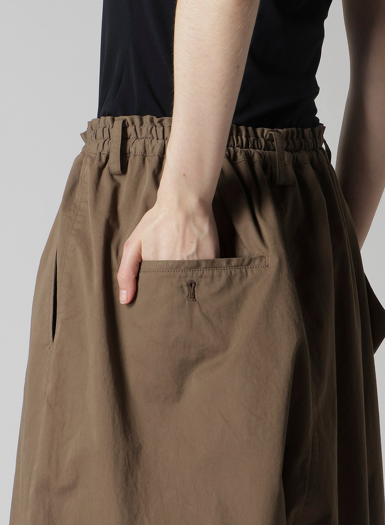 这条裤子在右侧展现出柔软、光滑且优雅的垂褶。腰带配有可调弹性和抽绳,确保完美合身。两侧设有口袋,左后方也有一个。由于生产工艺,颜色变化和质感差异可能会发生。