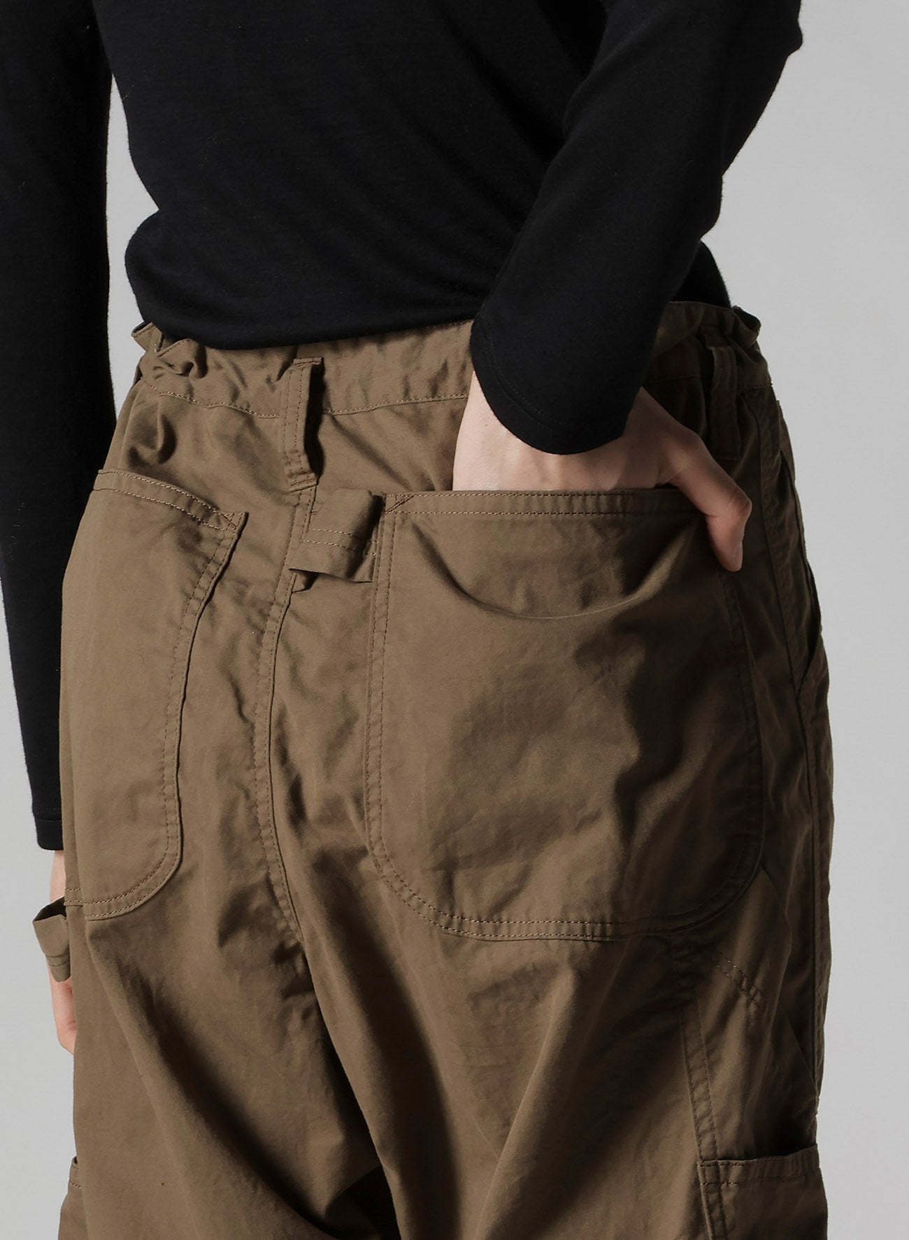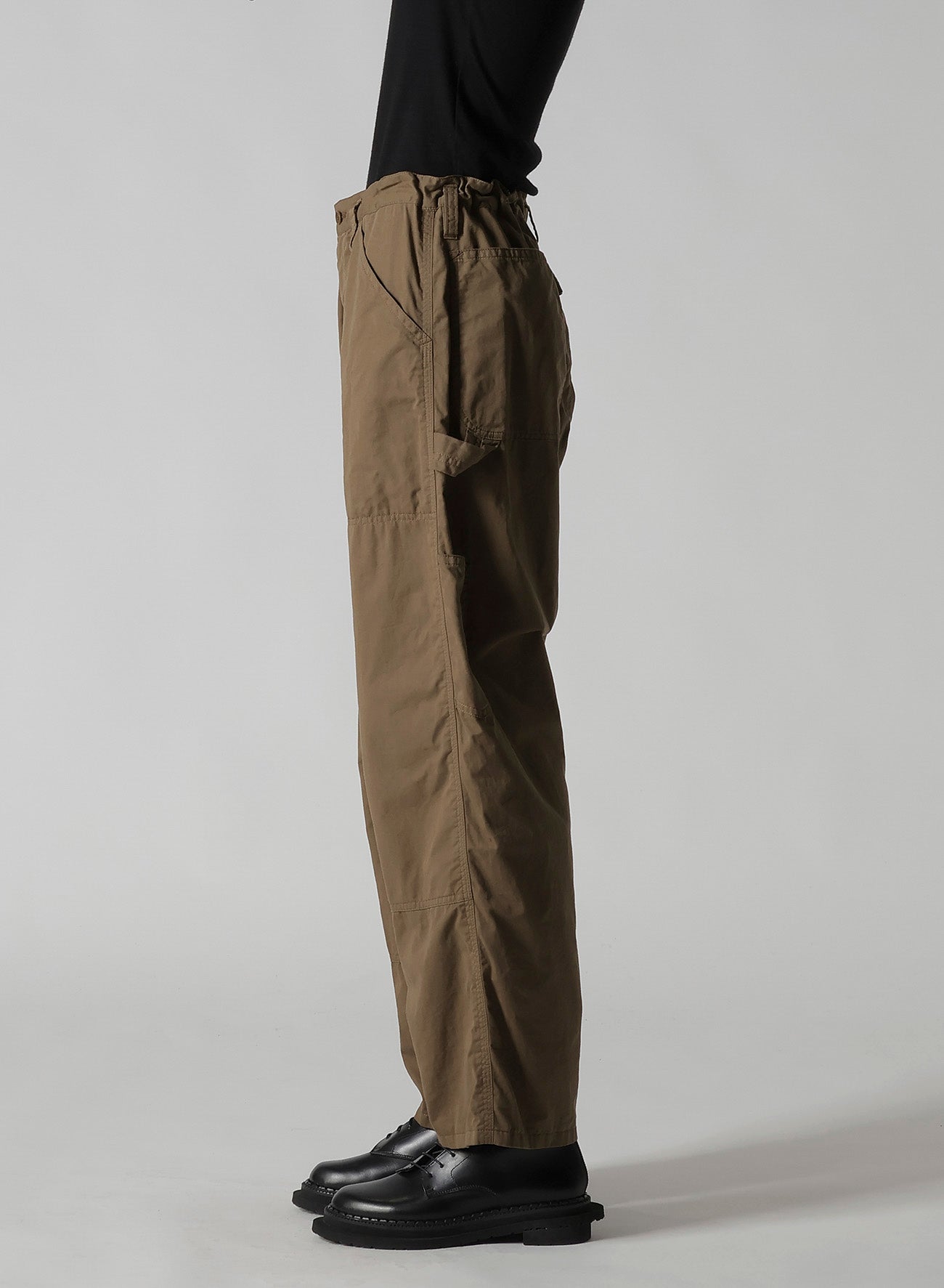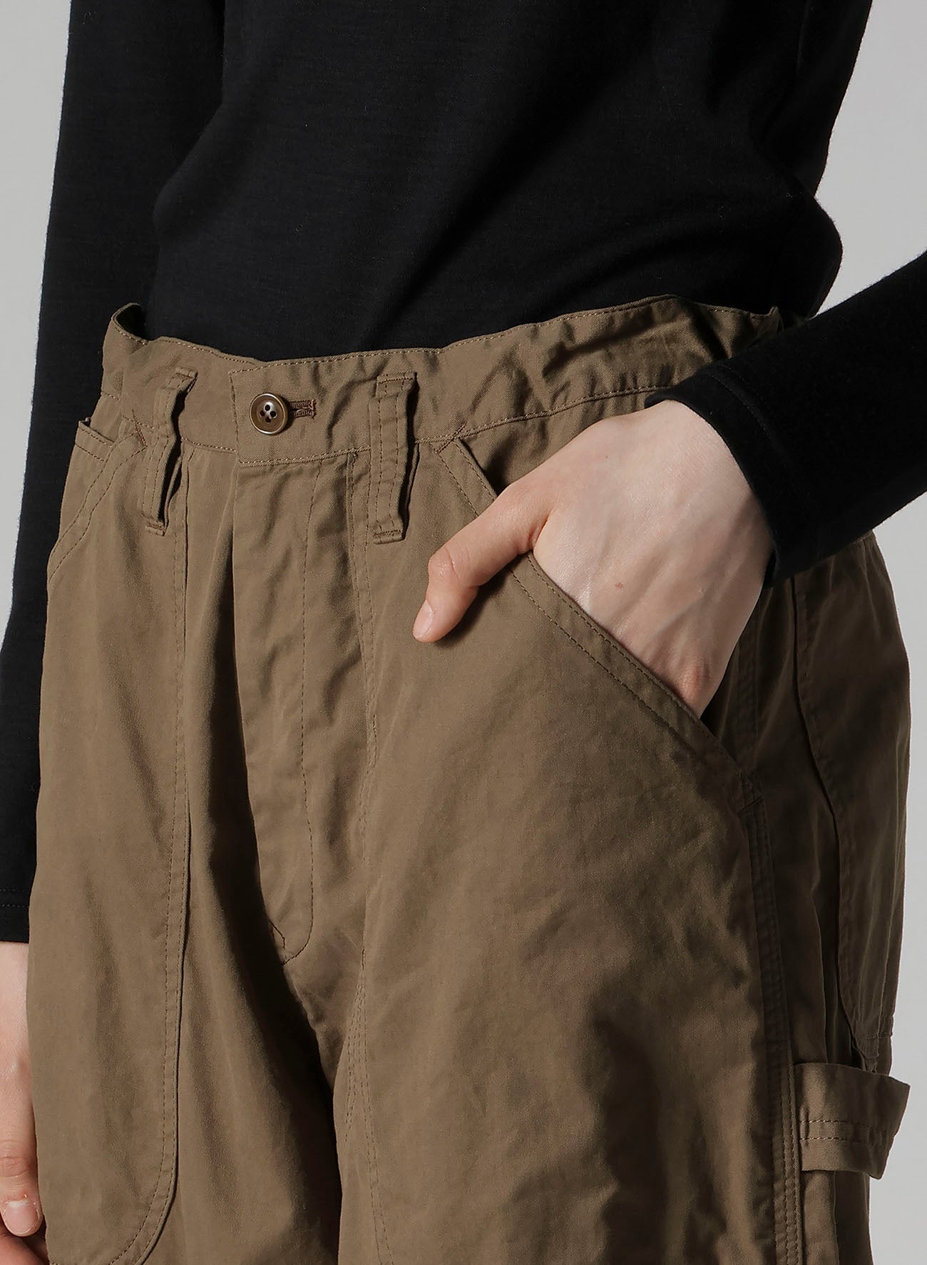 这款产品是一条优雅光滑的工作裤,具有精致的质感。它借鉴传统工装的设计元素,如锤环,同时融入了相同面料的拼接设计。请注意,由于制造过程,颜色和质感可能因单件产品而异。