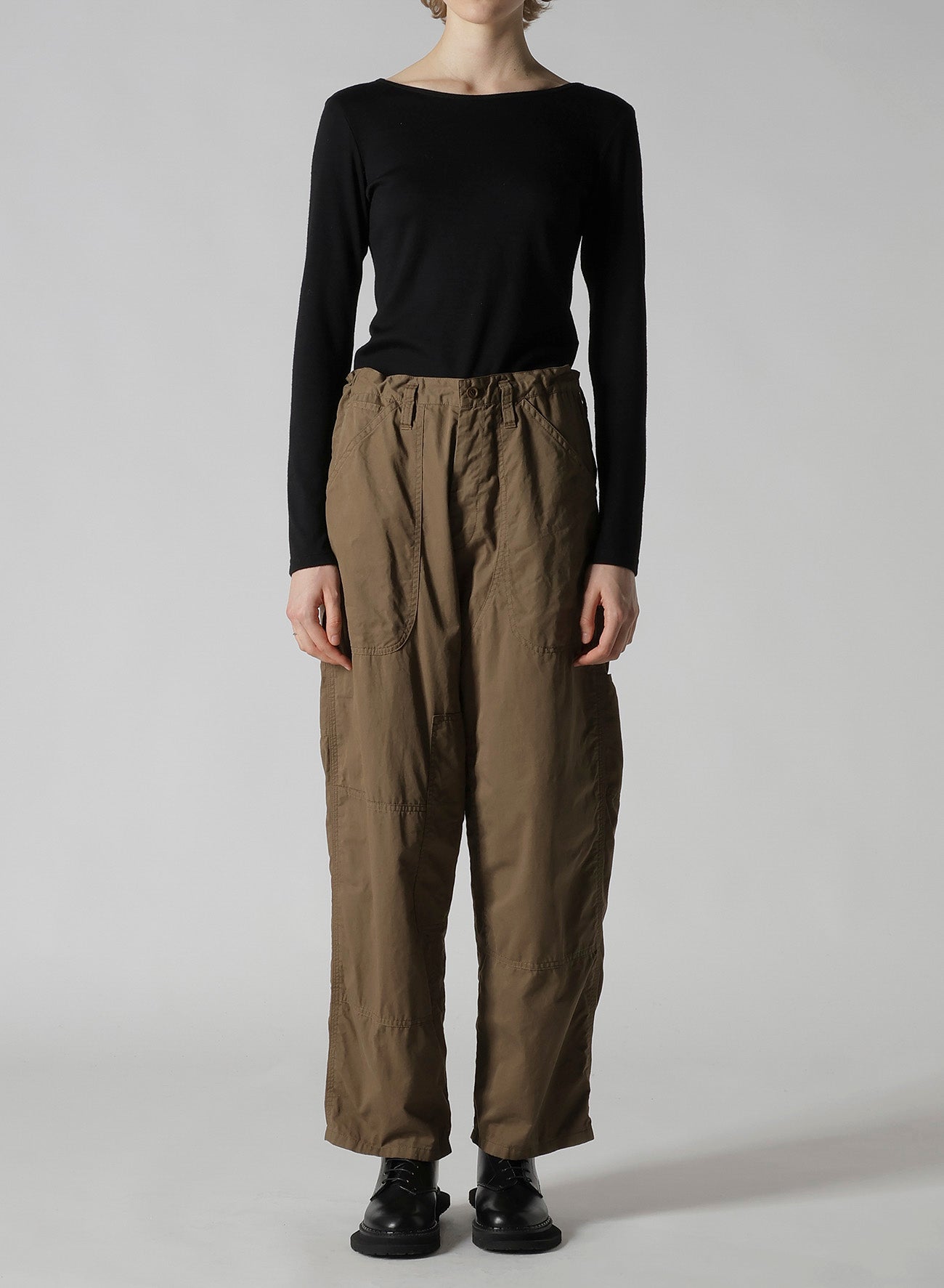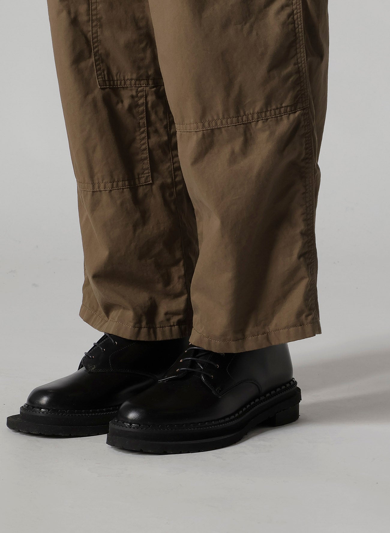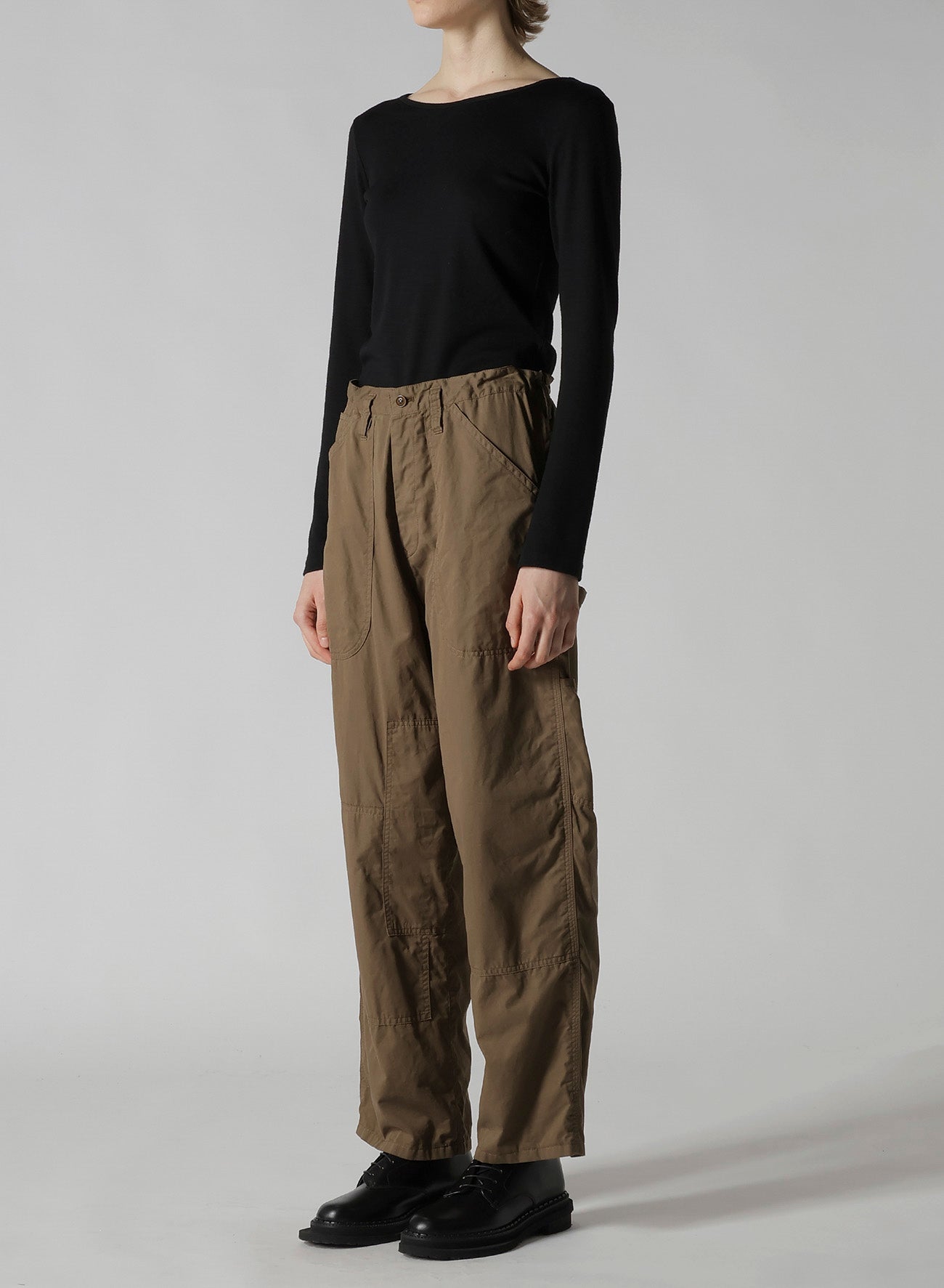 这款产品是一条优雅光滑的工作裤,具有精致的质感。它借鉴传统工装的设计元素,如锤环,同时融入了相同面料的拼接设计。请注意,由于制造过程,颜色和质感可能因单件产品而异。