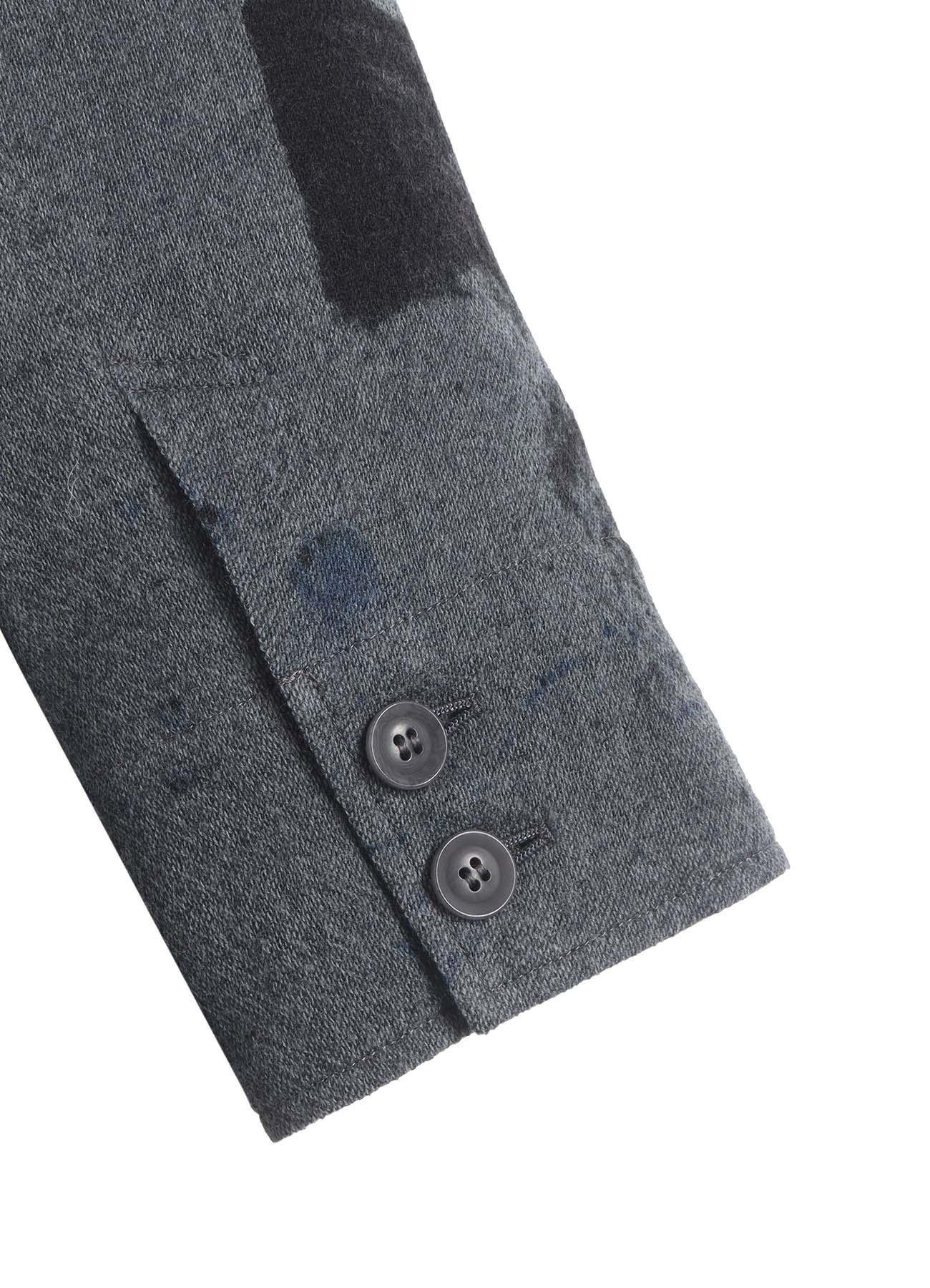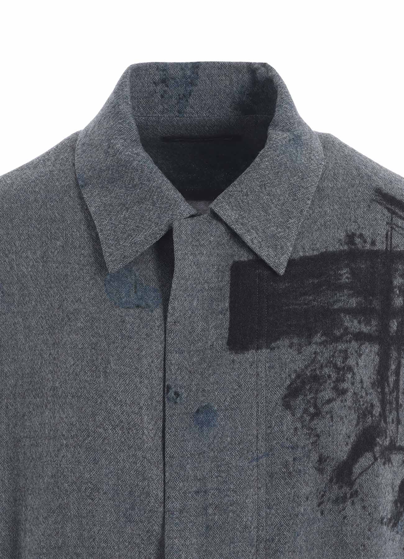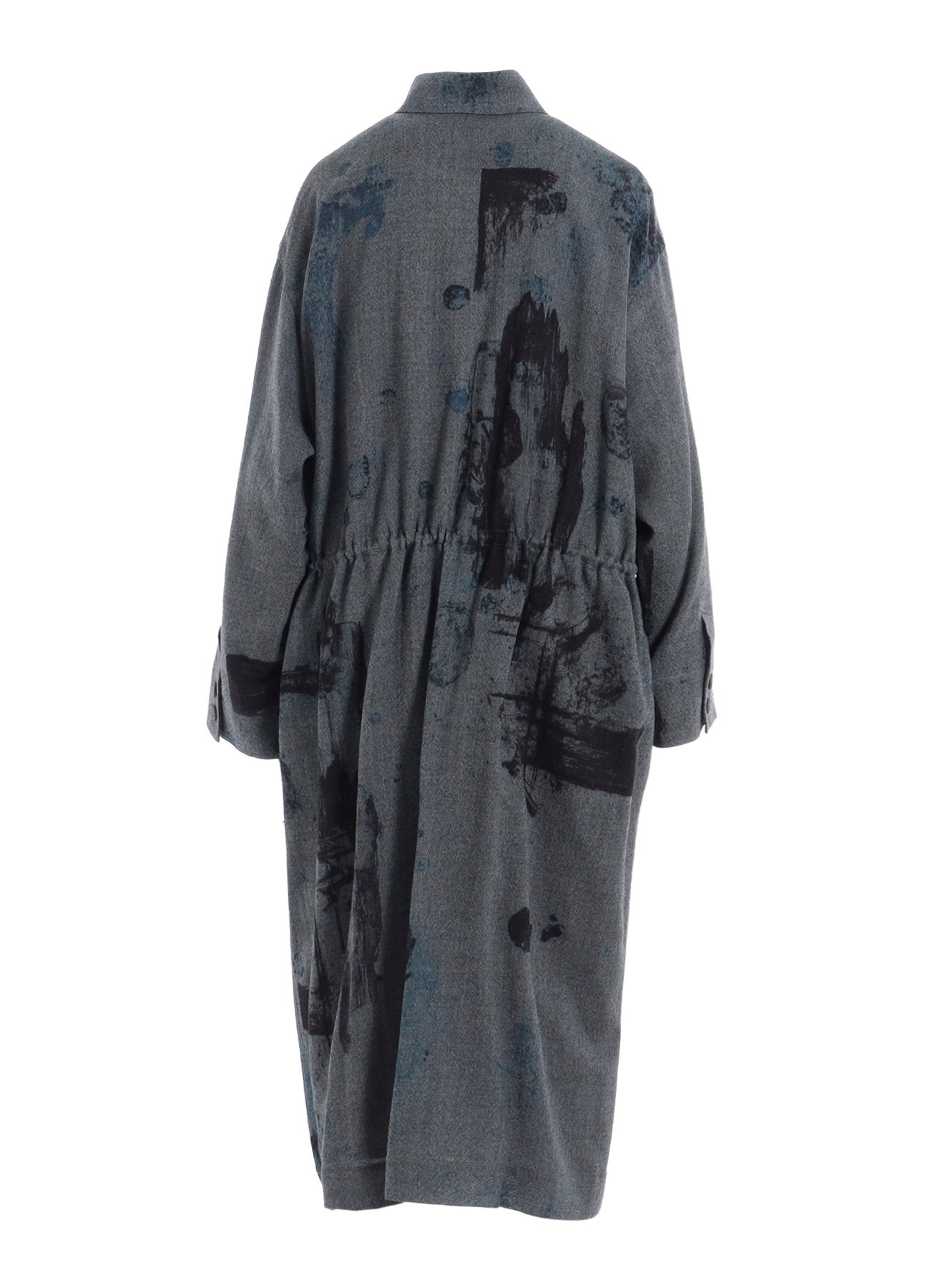 This dress features ink-jet printed, blurred dots on a warm yet lightweight fabric. The rhythmic design transitions from top to bottom with dynamic paint strokes and dots. Its drawstring waist allows for versatile fit adjustments. The dress may serve as outerwear but handle with care to avoid seam stress.