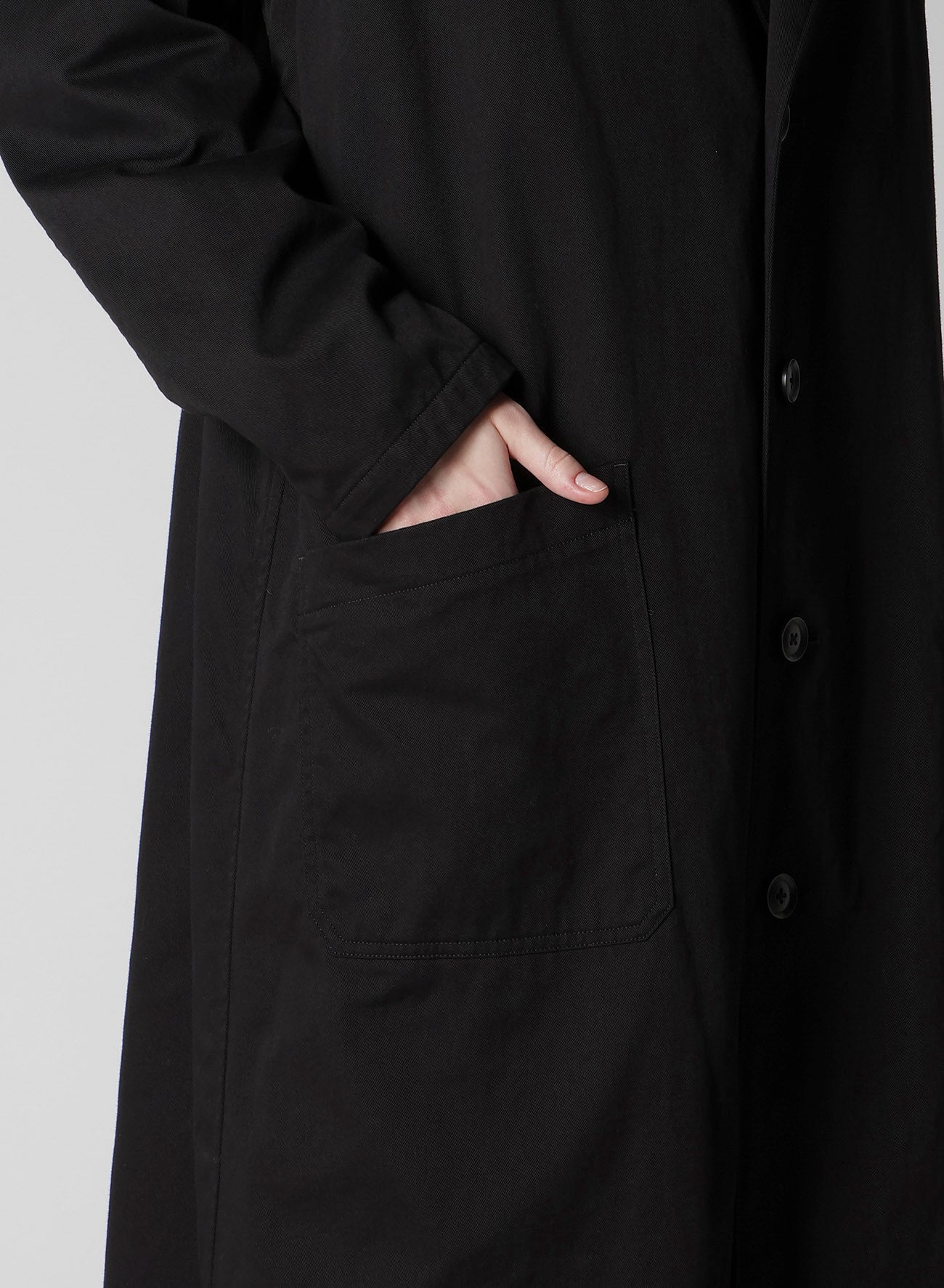 “Y's - BORN PRODUCT” 系列中的长外套采用棉质斜纹面料制成,经过柔软洗涤处理,提供舒适的质感。独特的设计包括不对称领口和口袋,成品可能会有自然的差异。