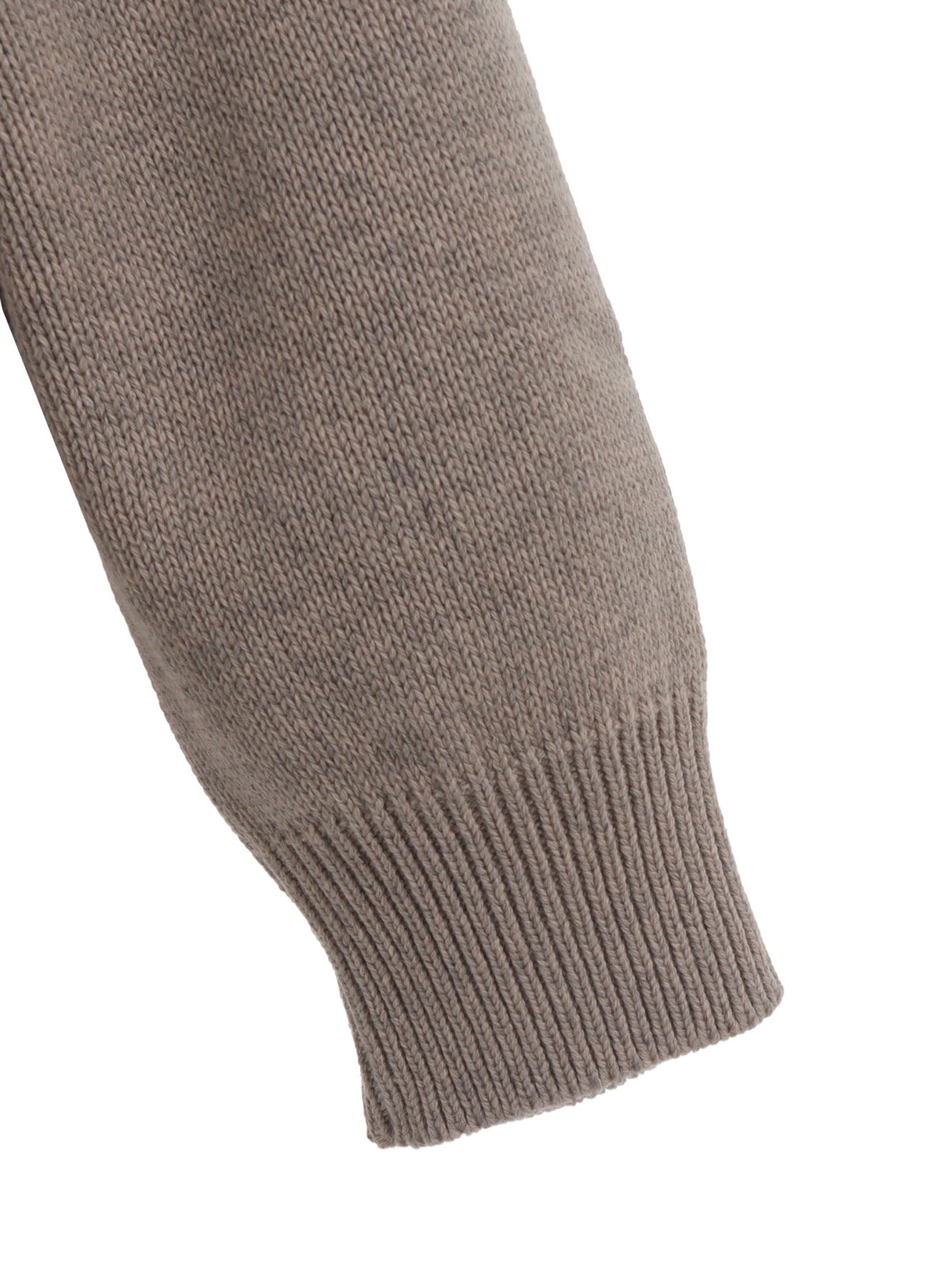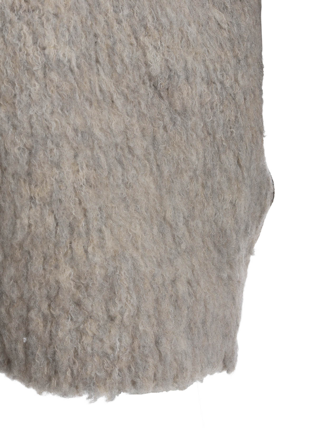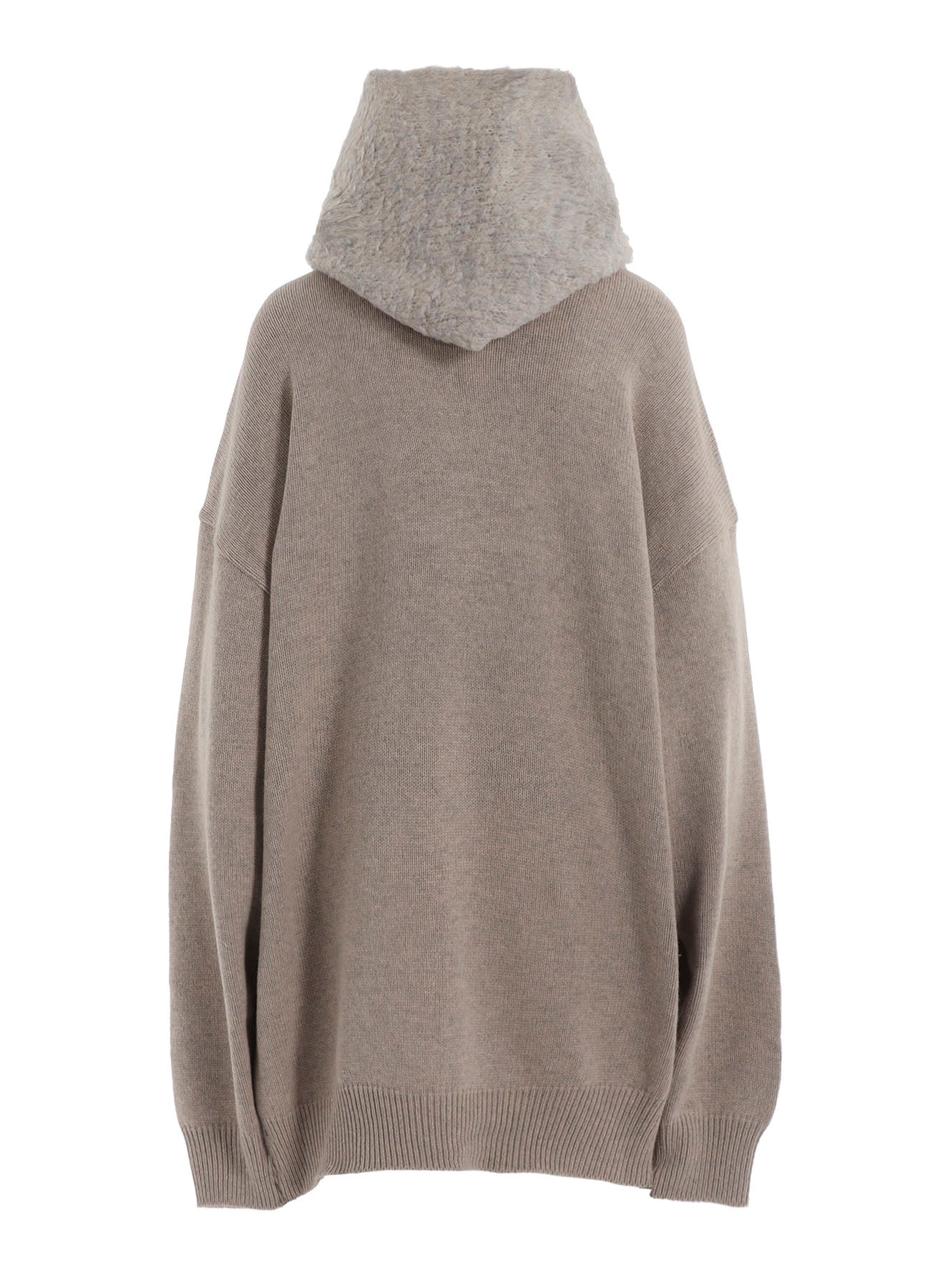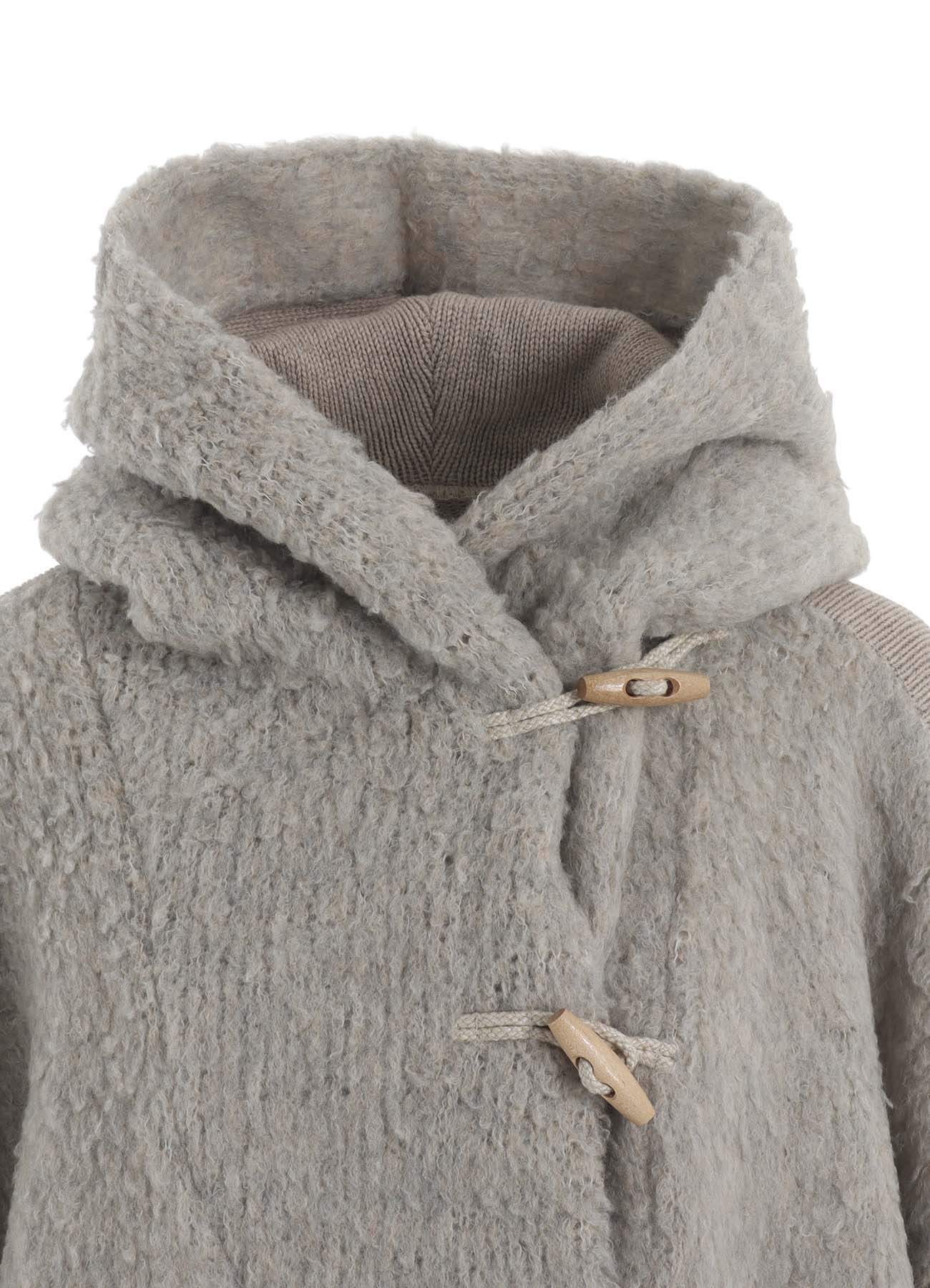 A hoodie pullover knit featuring a clip button accent with a cozy look. Crafted with a unique texture that mimics boa made by skilled artisans, it combines a fluffy knit base with a cotton-like material. The fabric feels incredibly lightweight yet offers exceptional warmth. Designed with side outer pockets.