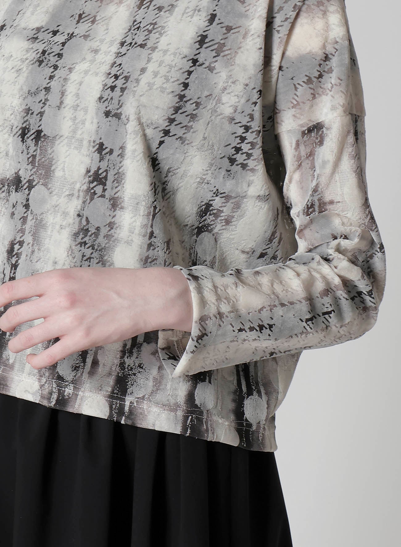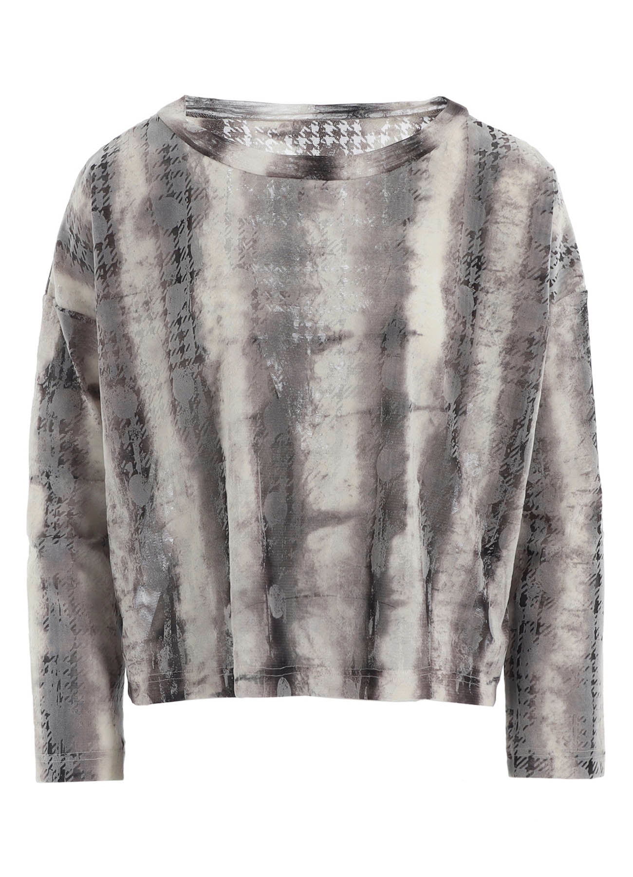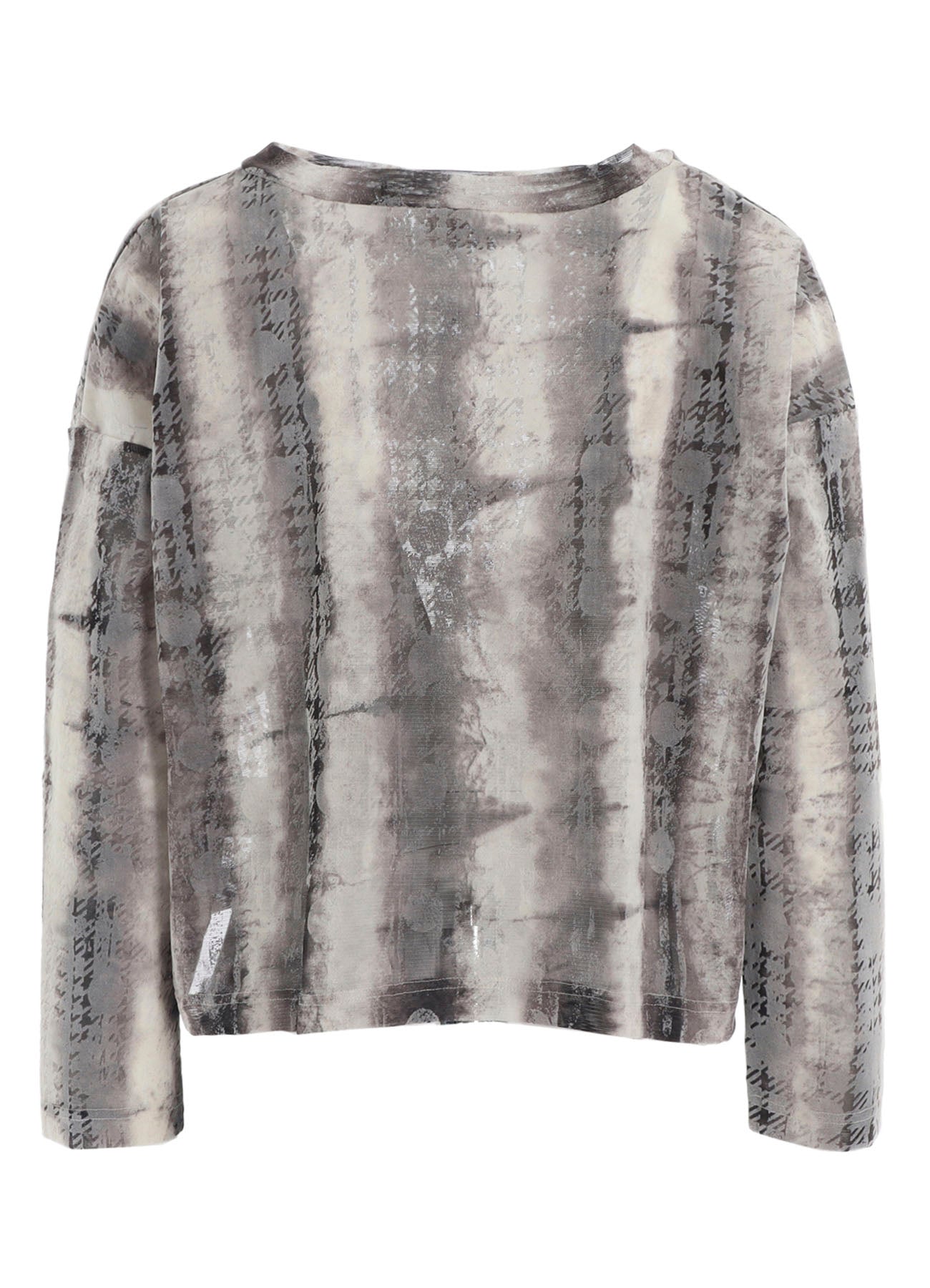 这款短款圆领长袖上衣,采用印花薄纱,叠加模糊条纹图案和逐渐磨损的人字纹圆点绒面印花。其多功能设计适用于各种服装搭配。 - 圆领设计,长袖 - 短款版型 - 模糊条纹印花薄纱 - 绒面印花人字纹圆点图案 - 为众多装扮提供平衡感