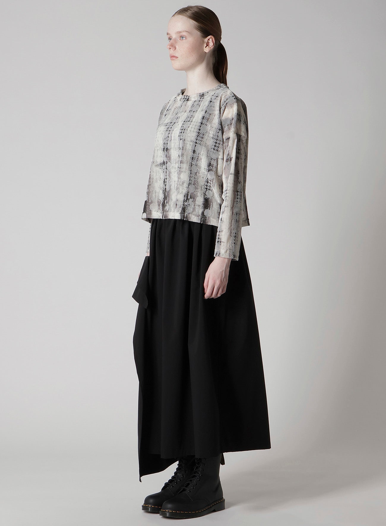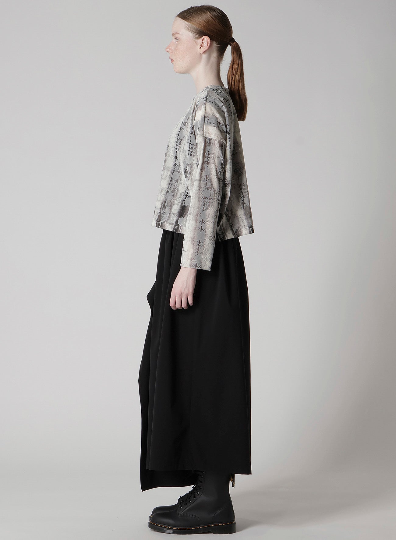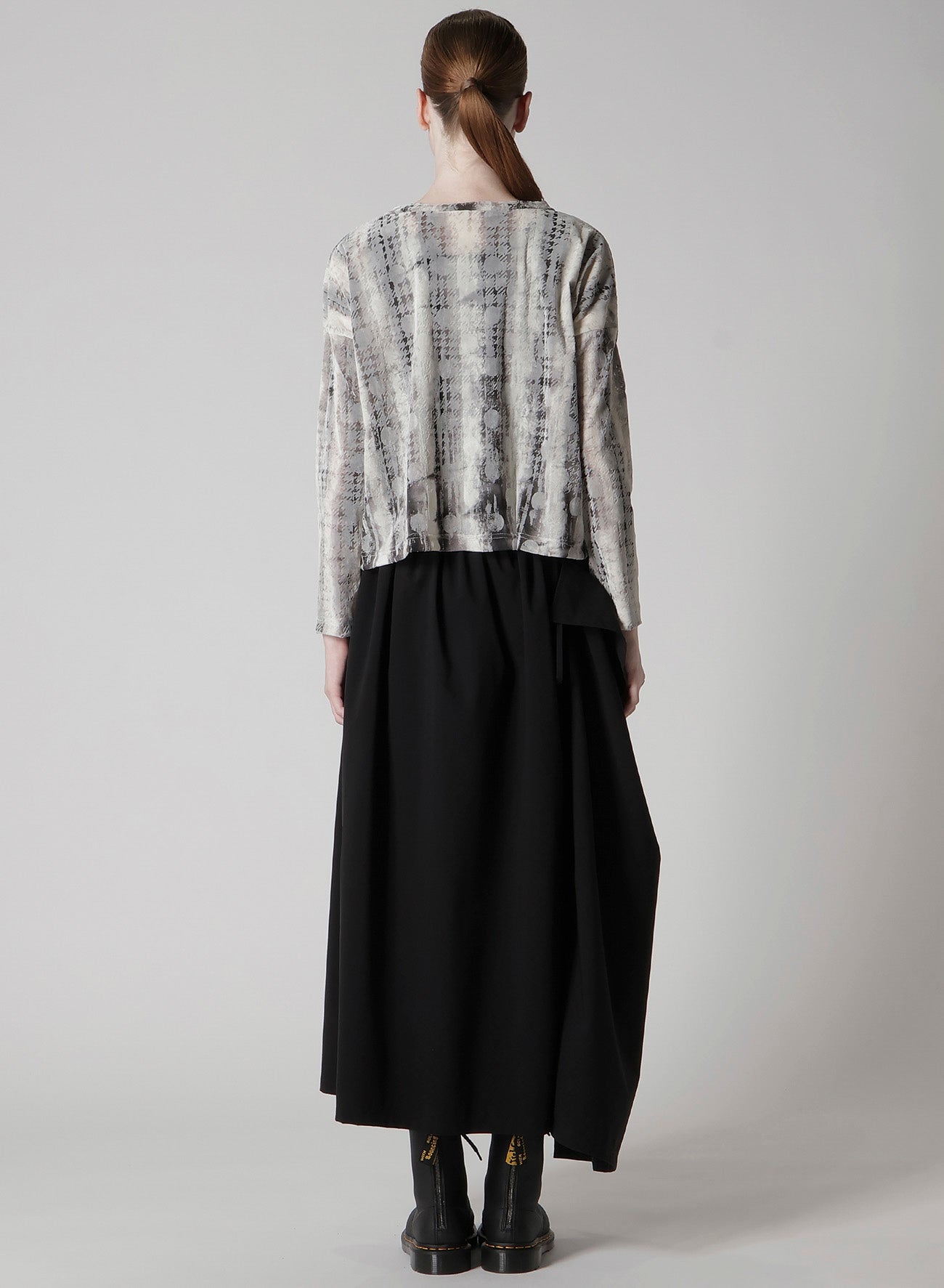这款短款圆领长袖上衣,采用印花薄纱,叠加模糊条纹图案和逐渐磨损的人字纹圆点绒面印花。其多功能设计适用于各种服装搭配。 - 圆领设计,长袖 - 短款版型 - 模糊条纹印花薄纱 - 绒面印花人字纹圆点图案 - 为众多装扮提供平衡感