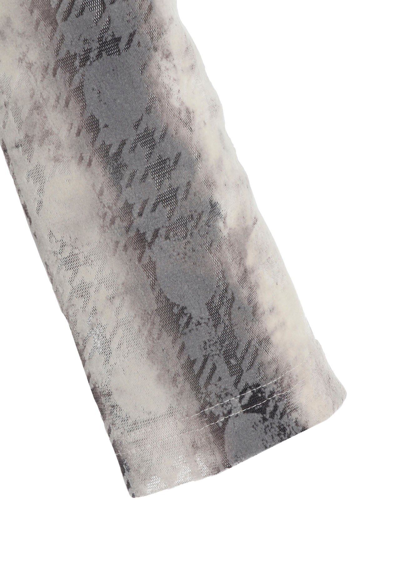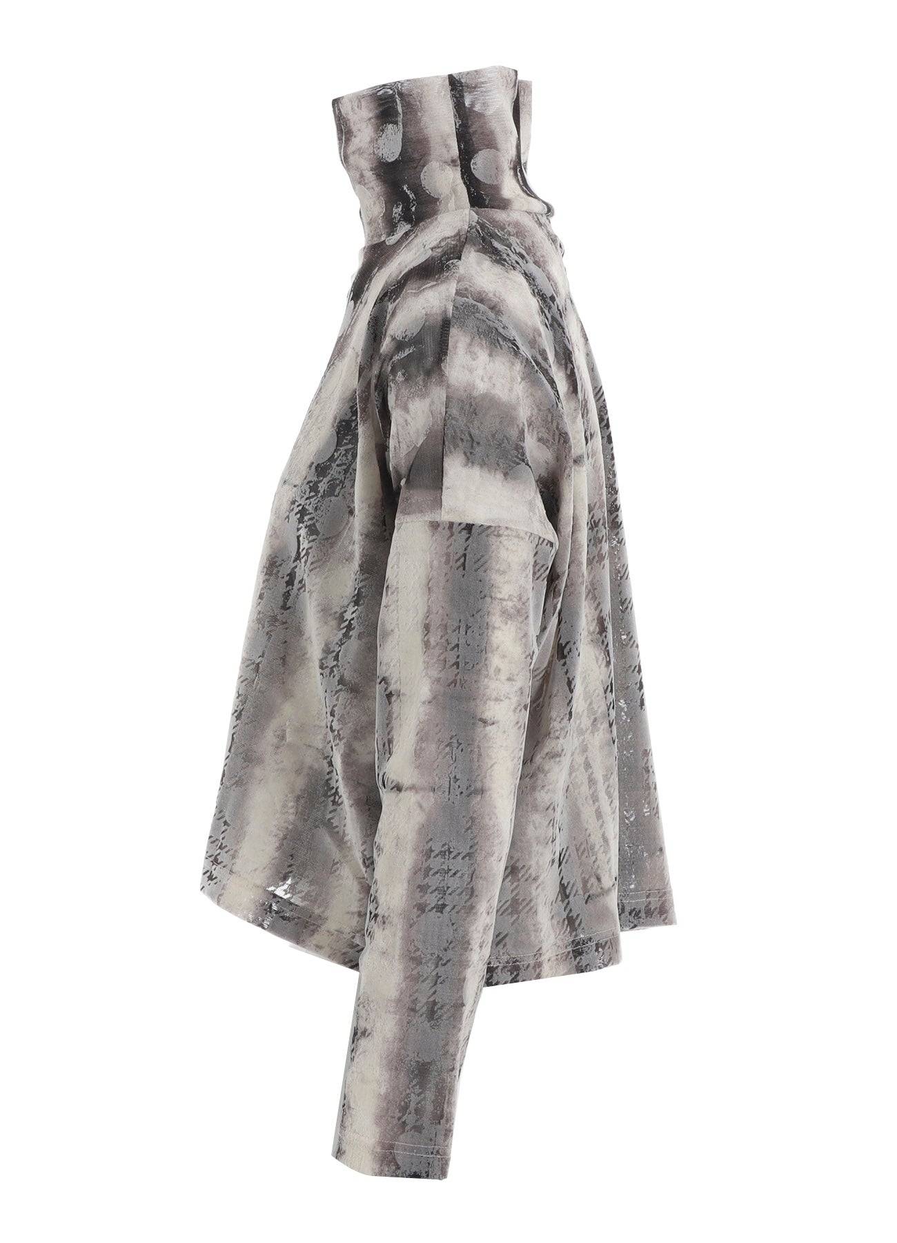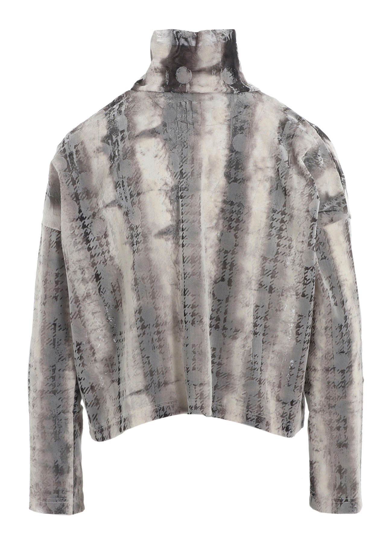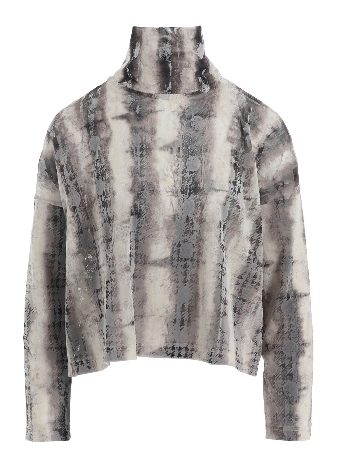 这款高领长袖短款上衣采用独特面料组合,混搭模糊条纹图案薄纱和渐变消失的千鸟格圆点植绒印花。它具有多种搭配选择,兼具风格和平衡。 - 高领长袖设计 - 短款版型 - 模糊条纹图案薄纱 - 渐变消失的千鸟格圆点植绒印花 - 多样化的搭配选择