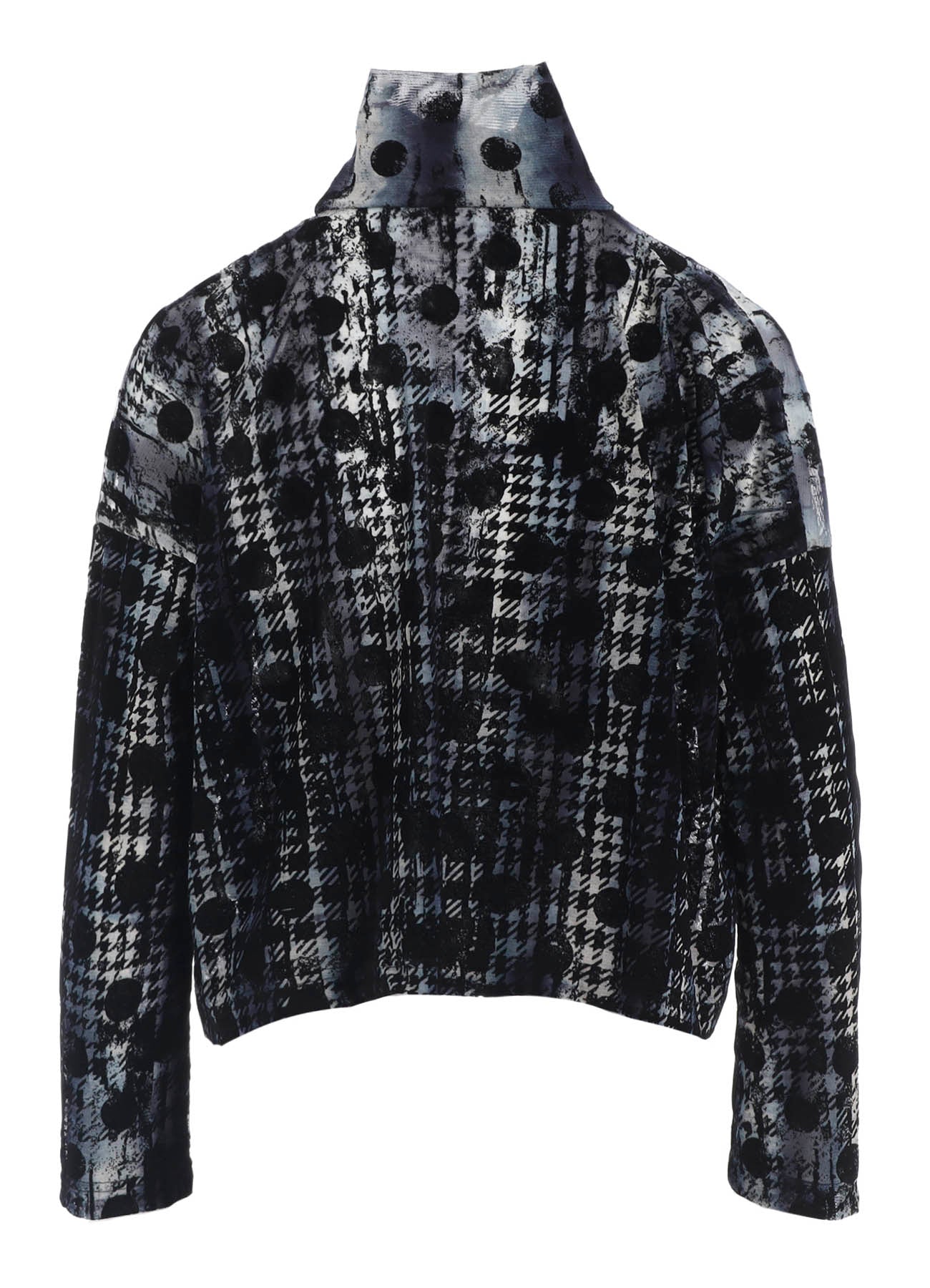 这款短款高领长袖上衣采用独特的面料组合,包括模糊的条纹图案网纱和渐变消退的千鸟格波点植绒印花。可搭配多种服装,兼具风格与平衡。 - 高领长袖设计 - 短款剪裁 - 模糊条纹图案网纱 - 渐变消退的千鸟格波点植绒印花 - 造型多样化选择
