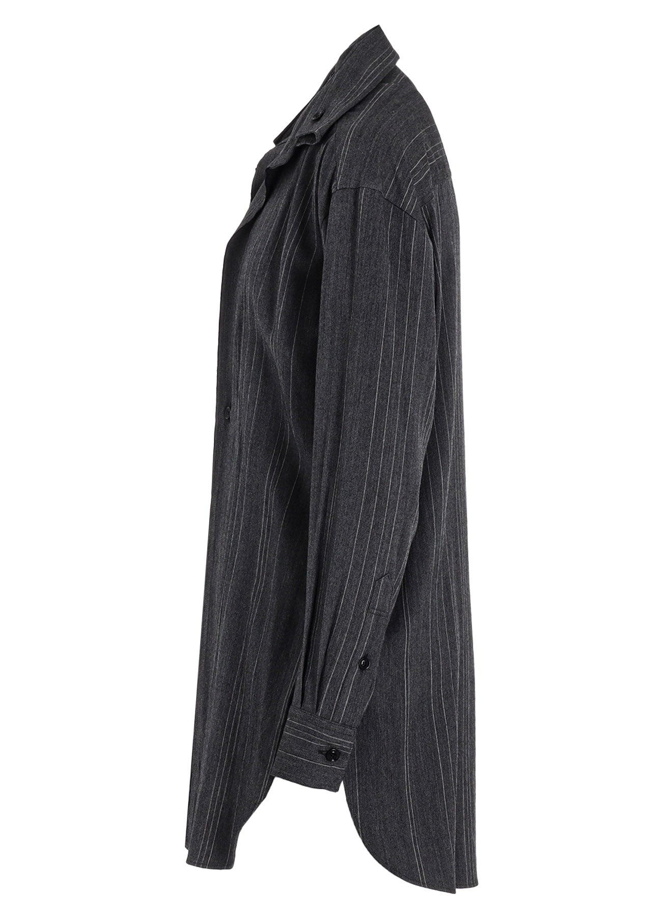 這款寬鬆襯衫式連衣裙,隨機拼接人字紋與條紋圖案。面料結合羊毛的硬挺與人造纖維的墜感,仿若穿著兩件襯衫的分層設計。衣領設有按扣,可提供多種風格選擇。毛邊與三重縫線增添隨性韻味。