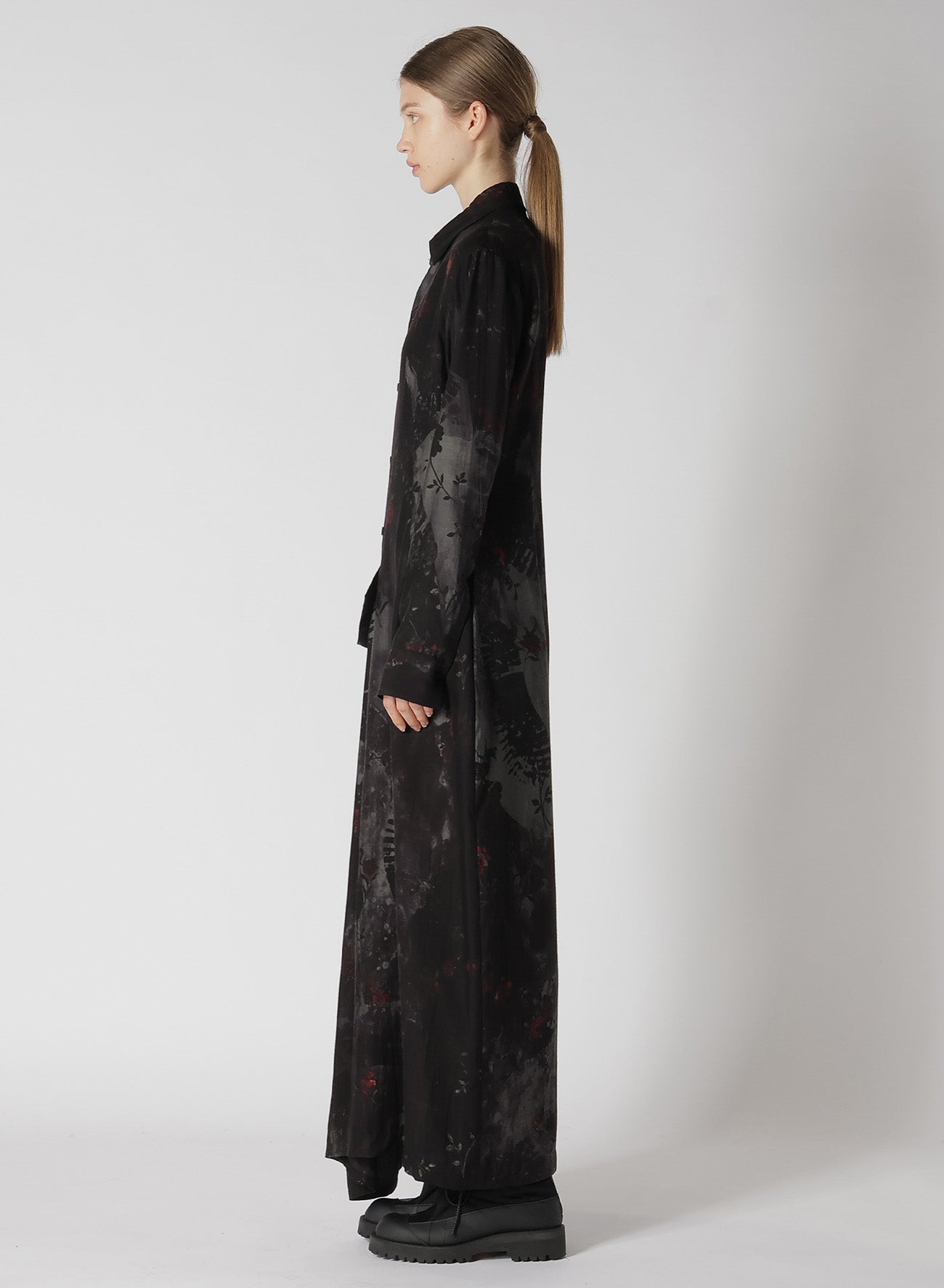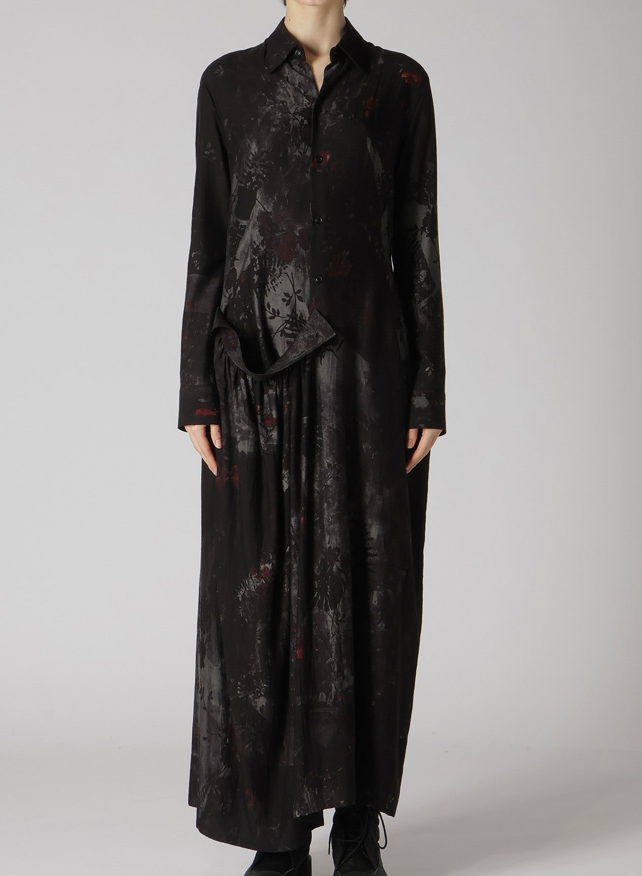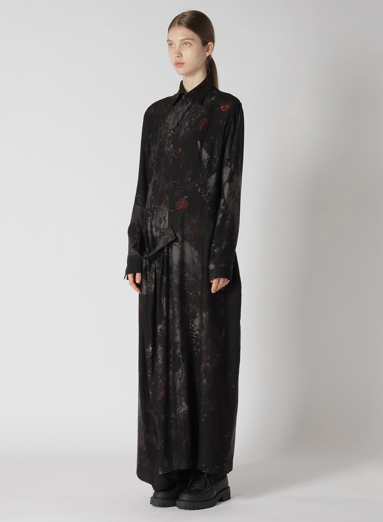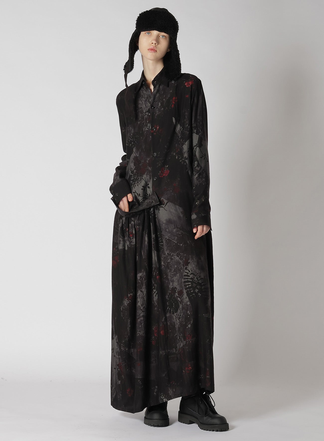 这款连衣裙概念将单独制作的上衣和裙子合并为一件,采用模仿街道上落花的印花。基础是修身的衬衫连衣裙,增强了褶皱层的悬垂面料,以增加动态的体积。模特图片使用样品;请查看尺码信息以获取详细信息。