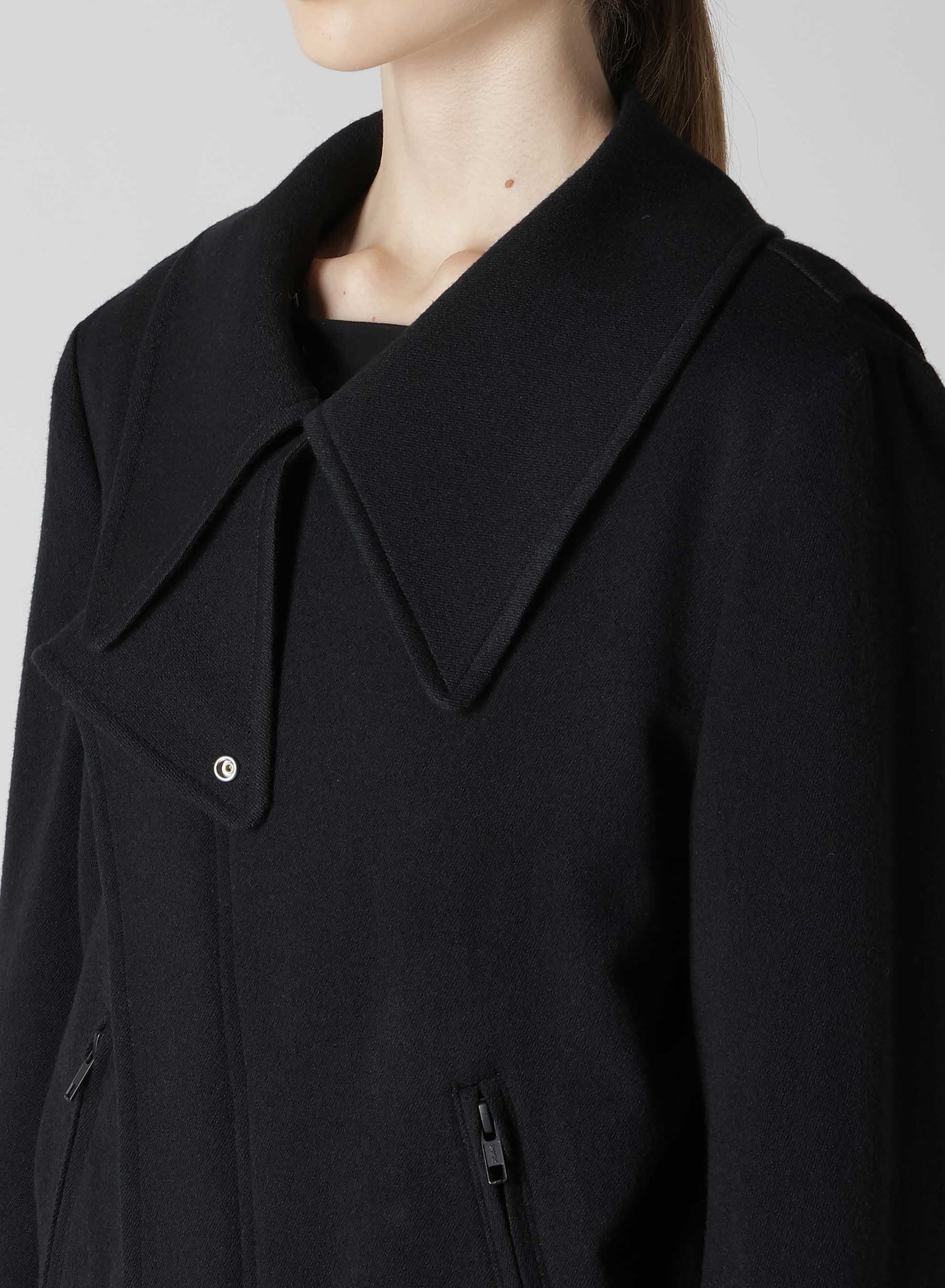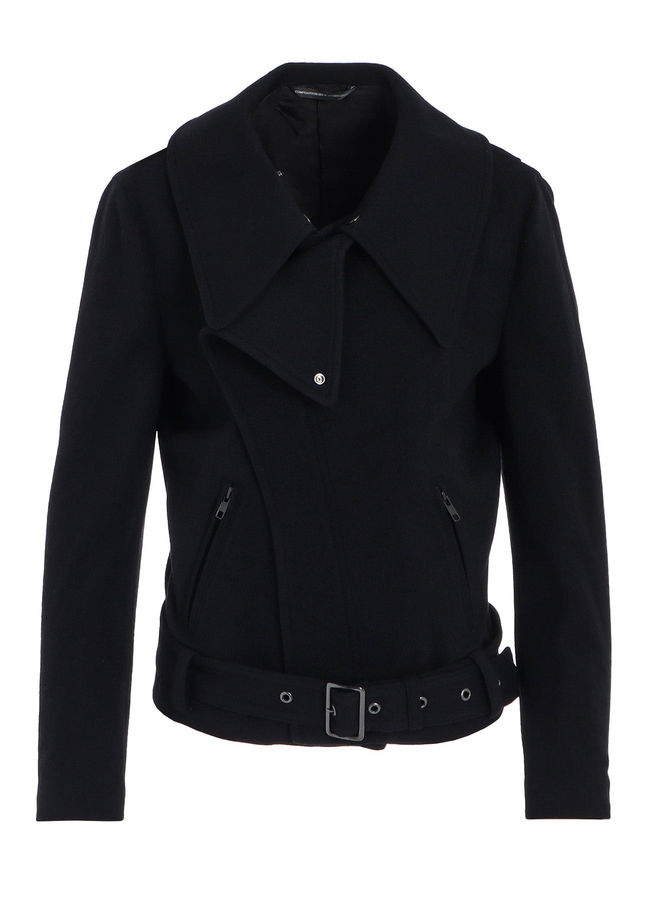 这款motorcycle jacket采用柔软而蓬松的Stretch Flannel面料,通过阳光晾晒工艺达到舒适效果。前方拉链隐藏,独特的领口设计使其成为抢眼单品。建议搭配相应裤装,形成时尚套装。