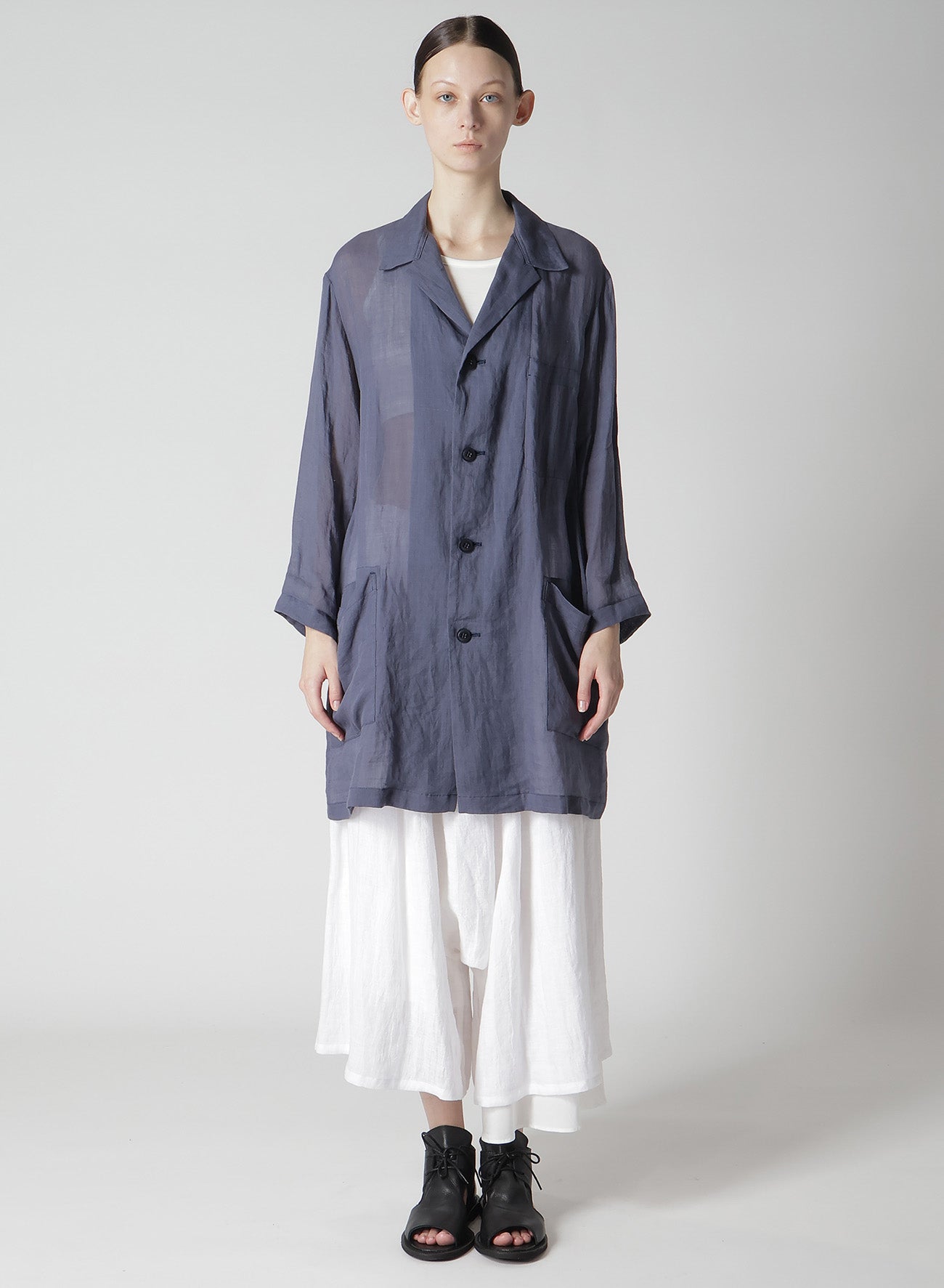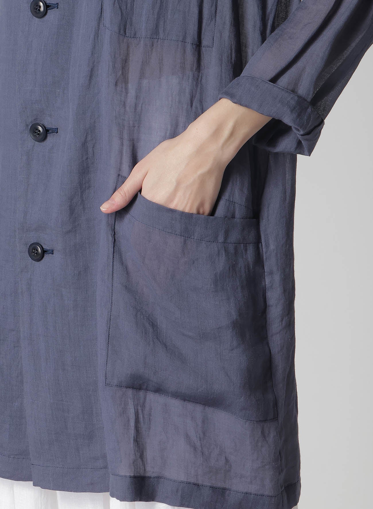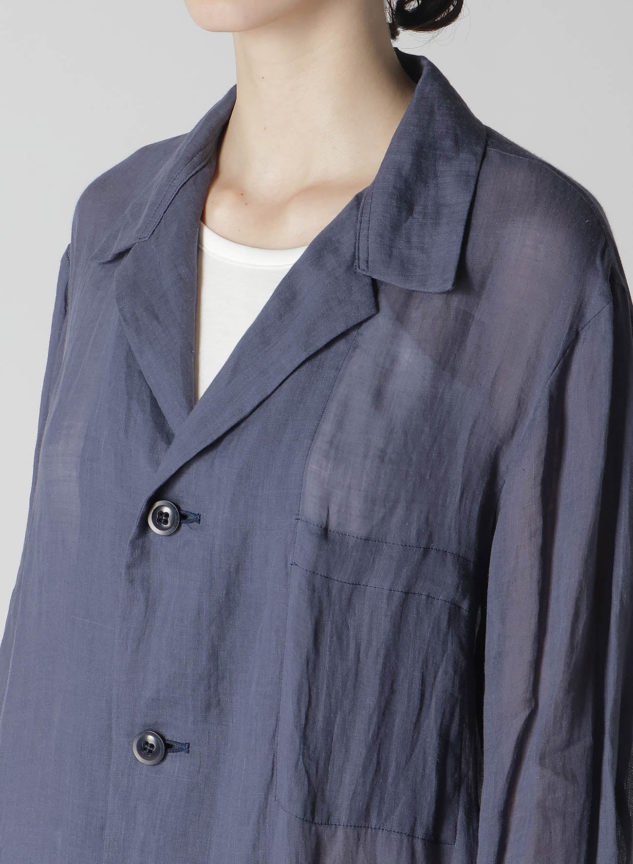 这款linen夹克因其染色工艺呈现出独特的柔软和丰盈质地。宽松版型和七分袖,适合休闲搭配。由于服装水洗,夹克在质感上展现出独特个性,天然纺织变化是linen的特征。