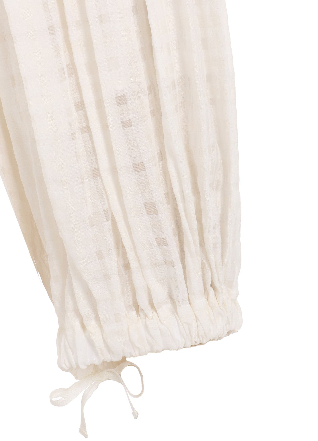 这款褶皱裤设计以针织方式展现Glen plaid图案,并混合丝绸增加光泽与透明度。干净的腰线过渡到宽松的面料,裤脚可通过抽绳调节。后腰采用弹性设计以增强舒适度。每件产品的质地因喷雾处理略有不同。