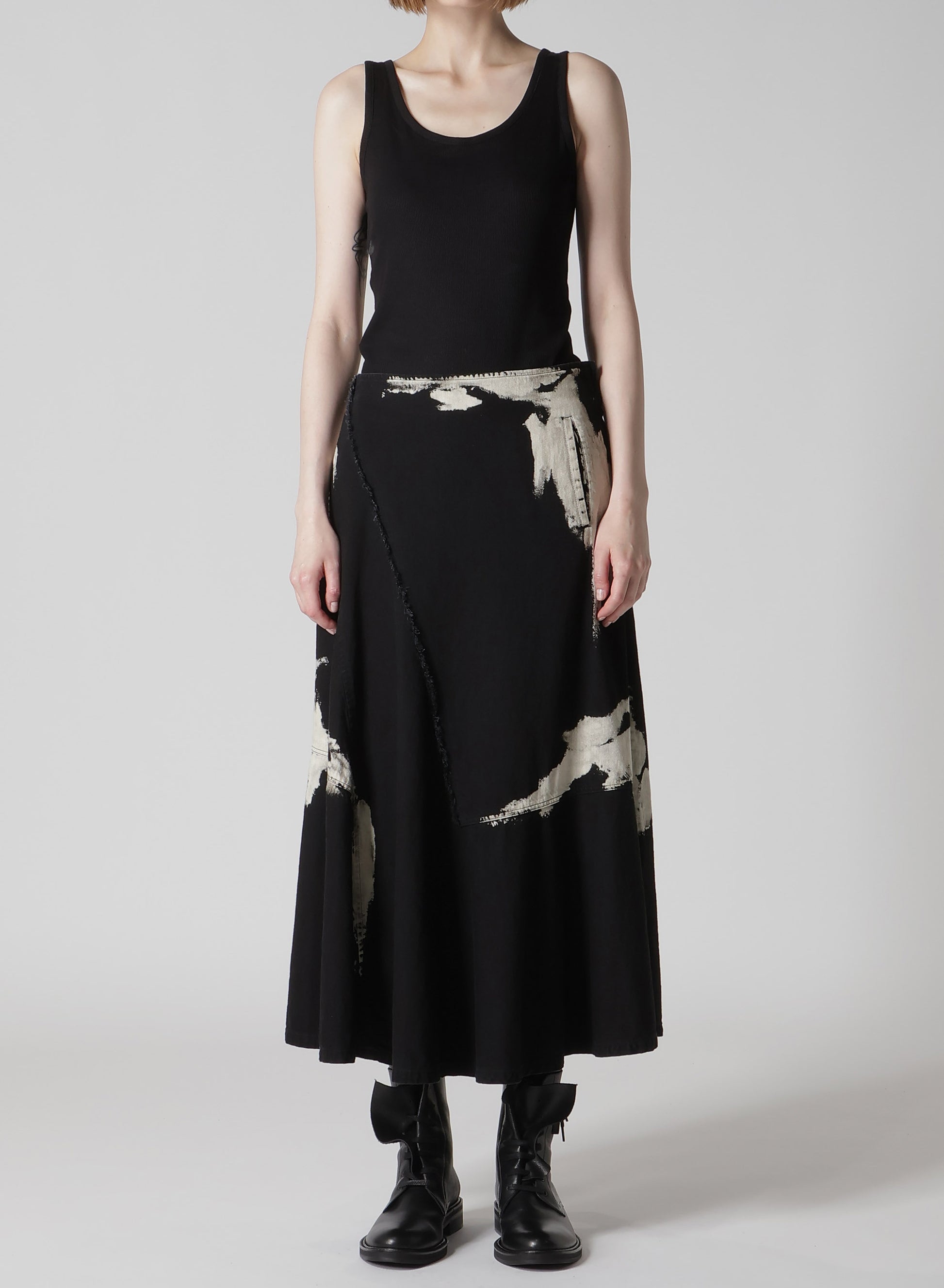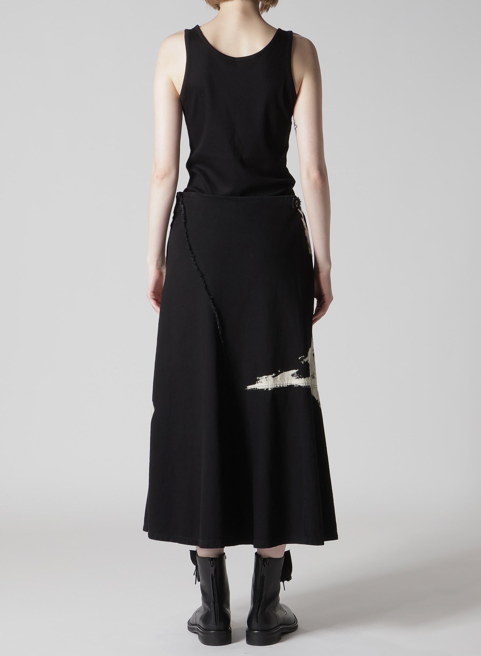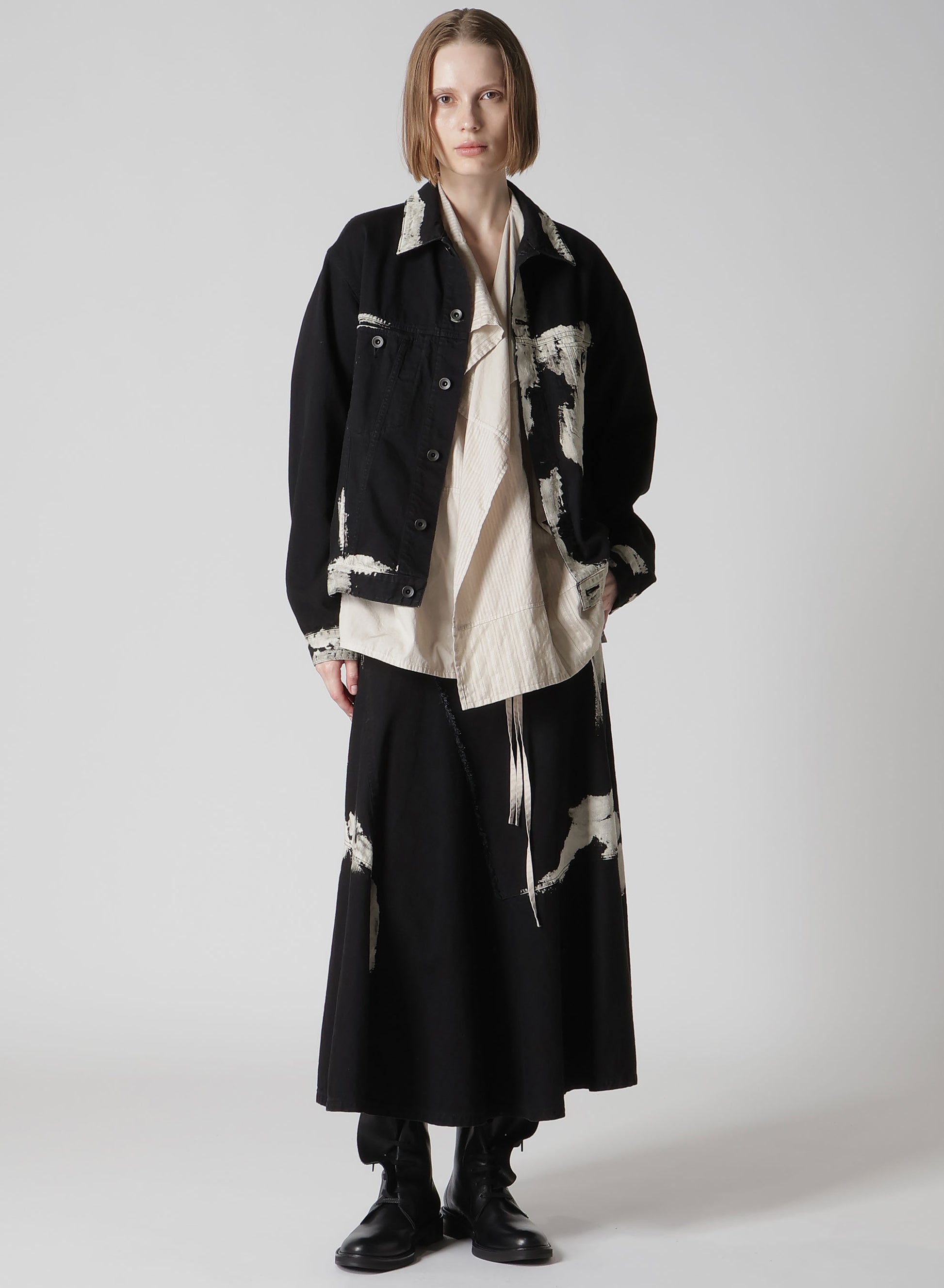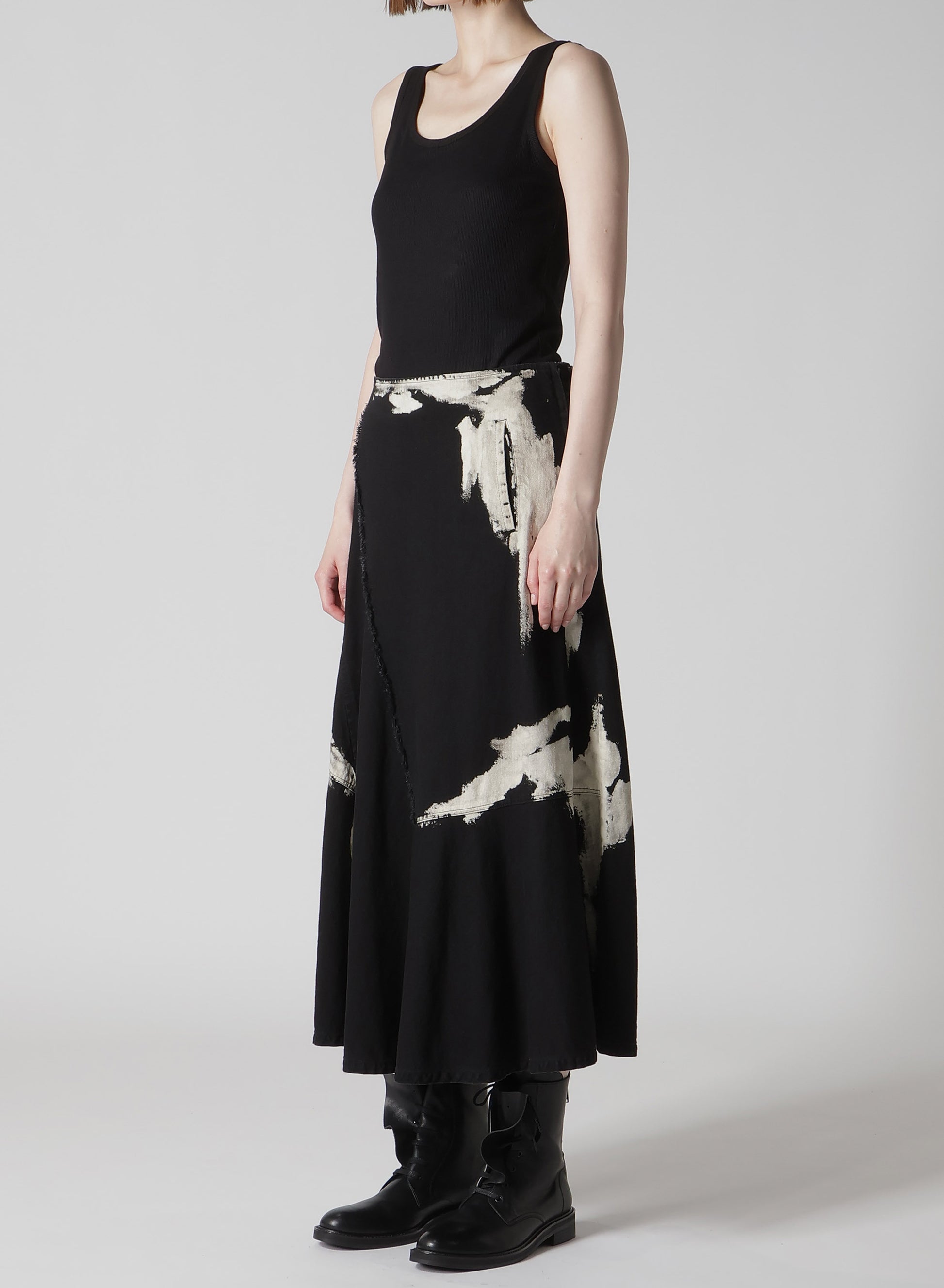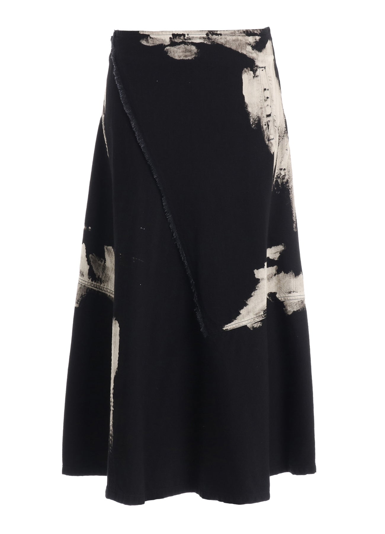 This 8oz denim long skirt features deep black denim with discharge for unique bleaching effects. The waist is adjustable with buttons. As each piece is hand-bleached, expect individual variations. Be cautious of potential color fading due to the denim fabrication.