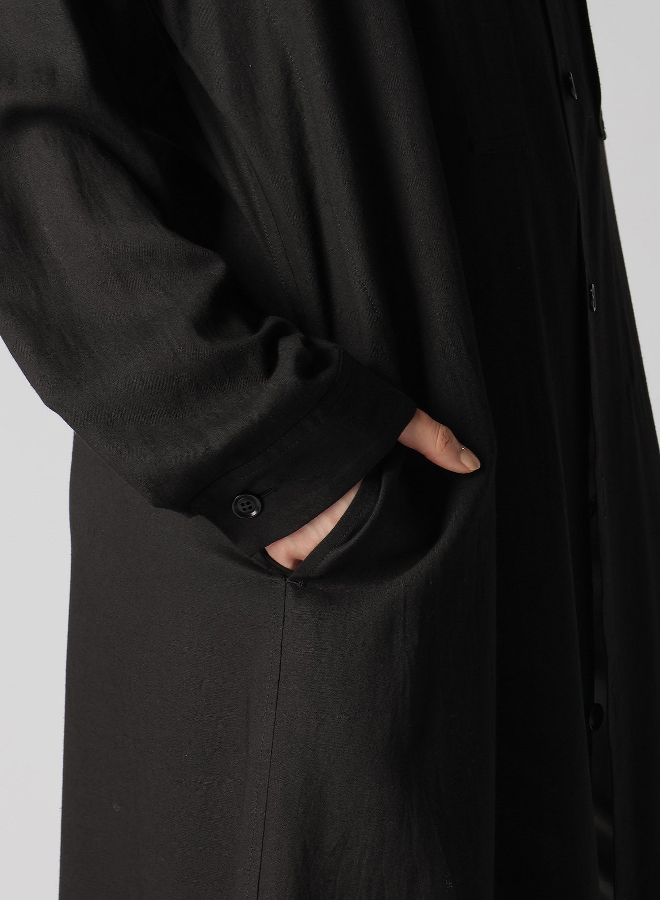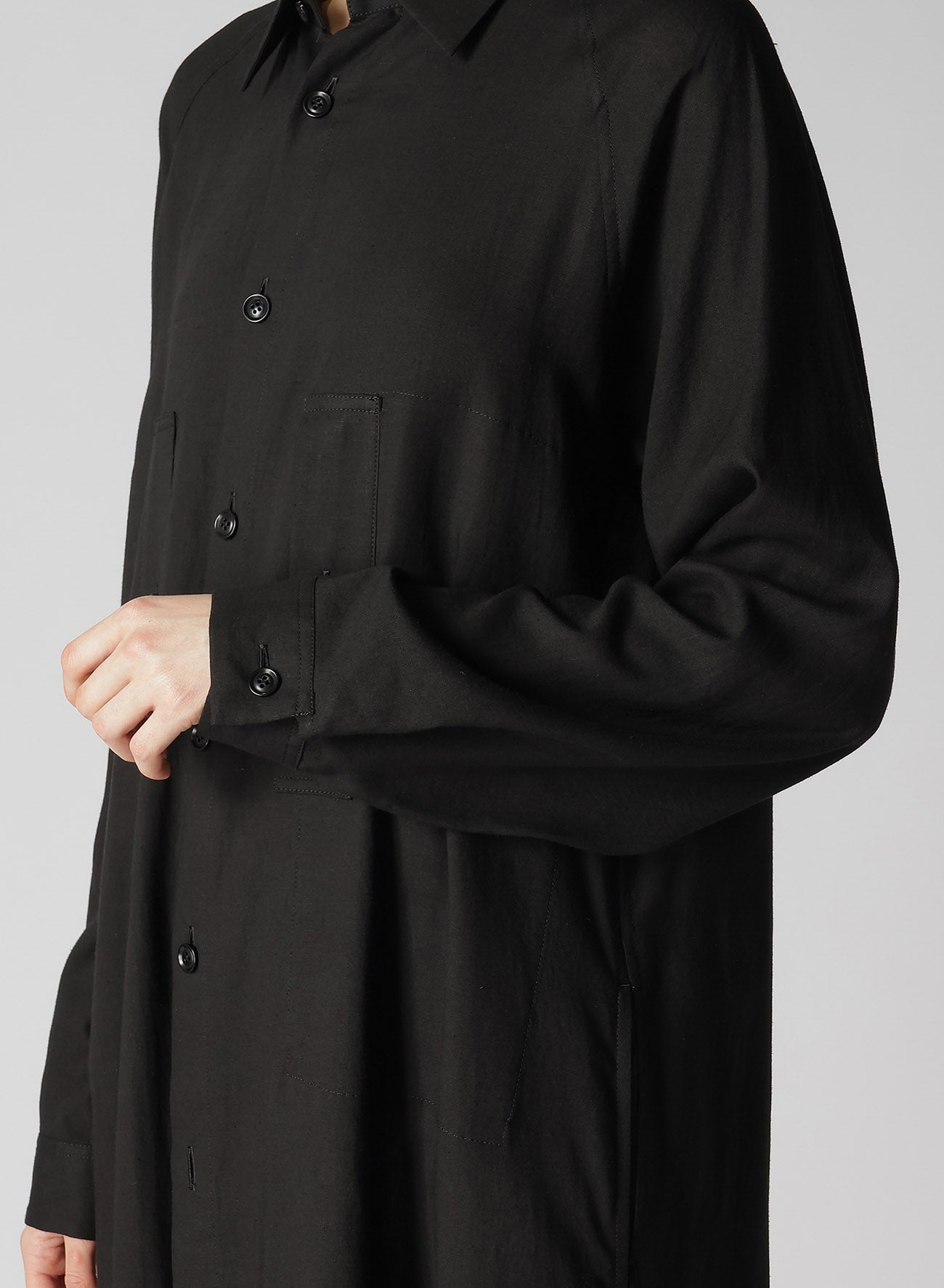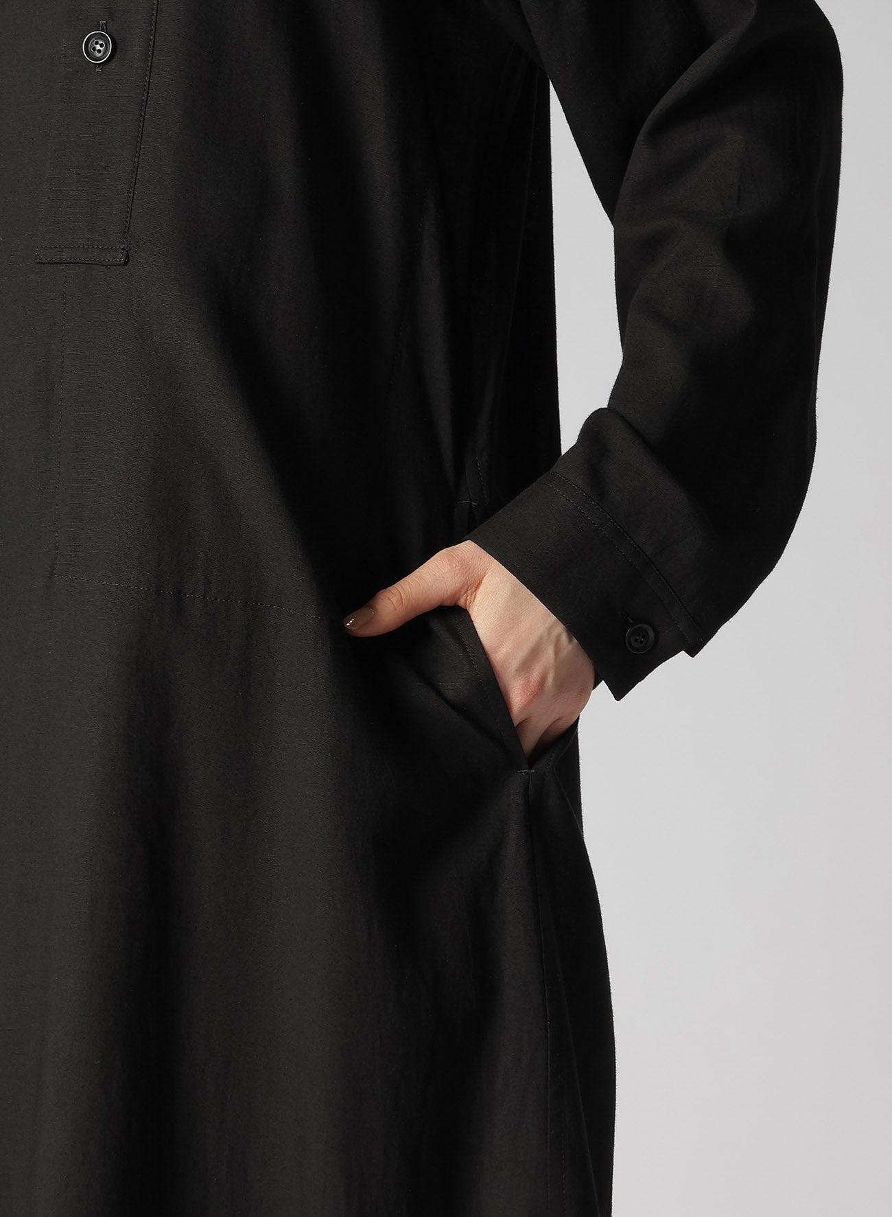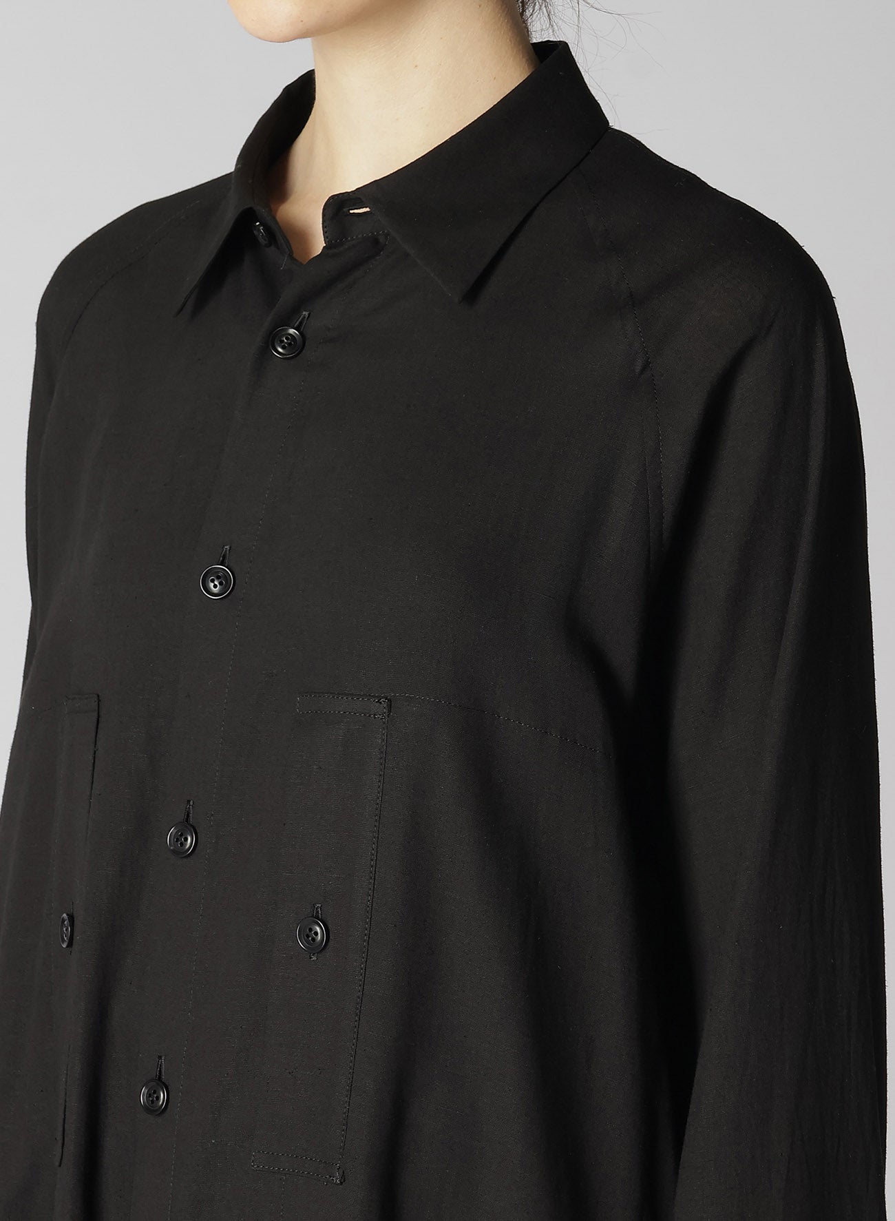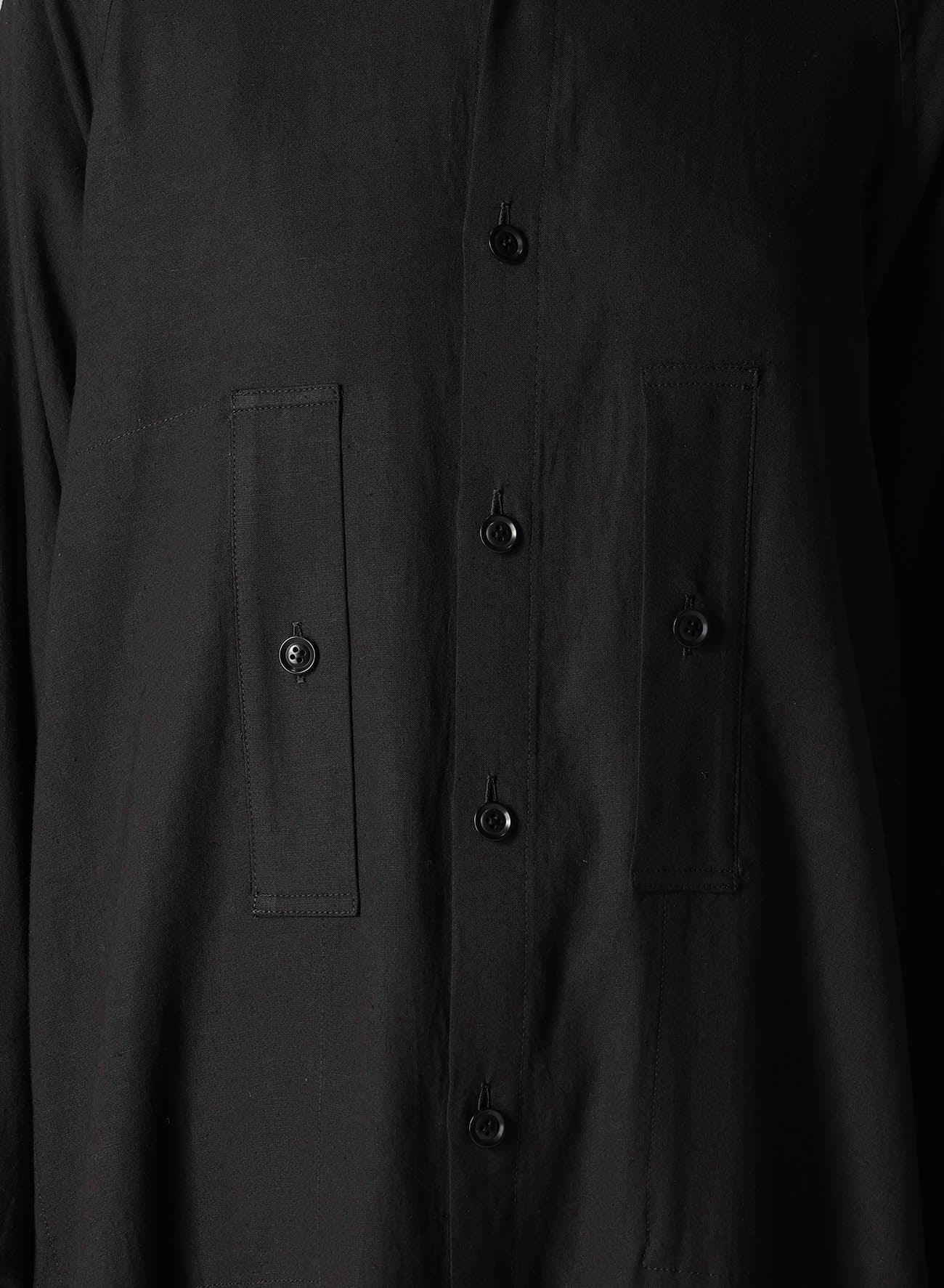 一款柔软、宽松的胸袋衬衫,由人造丝和亚麻混纺制成,染色后经过生物处理。当纽扣打开时,它还可以充当轻薄外套。织物的纹理可能呈现天然亚麻粗纱。