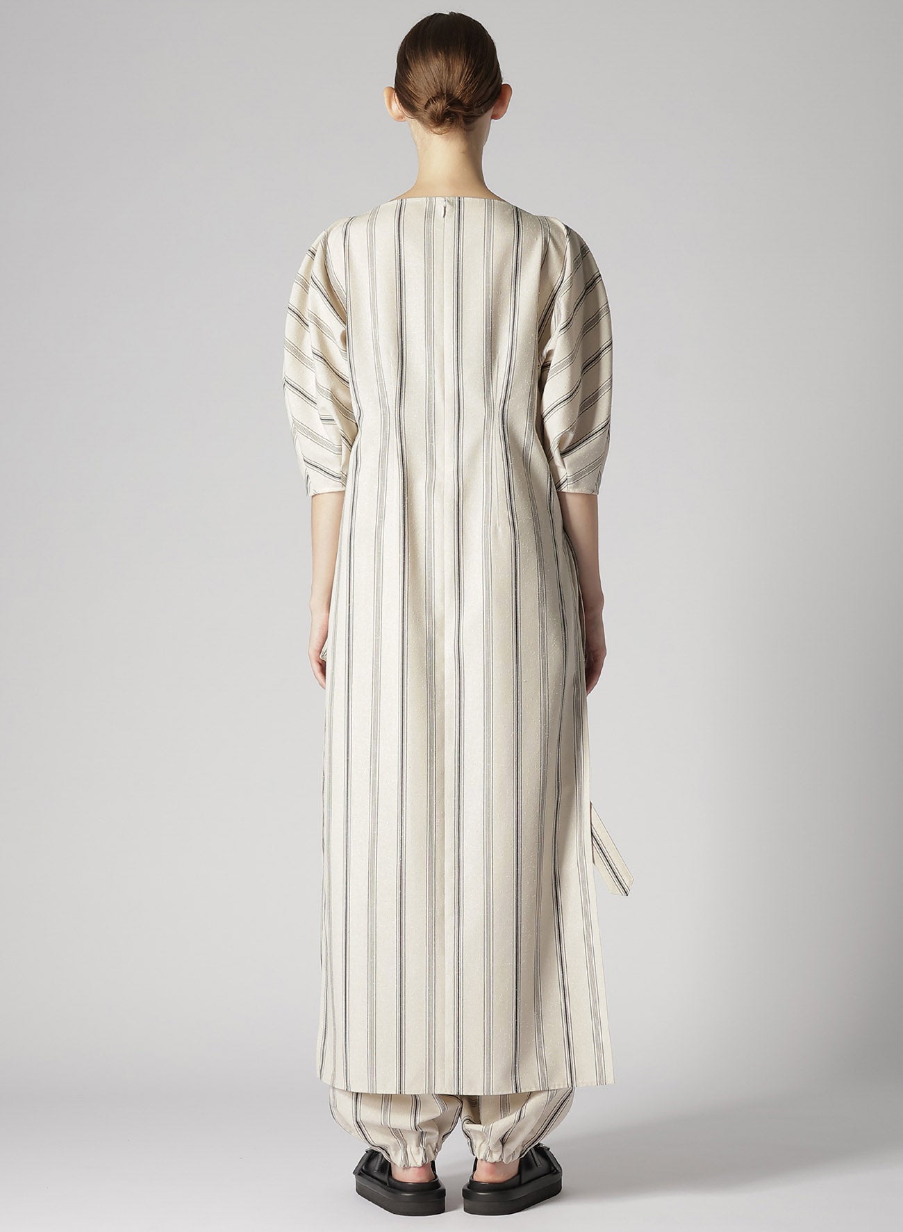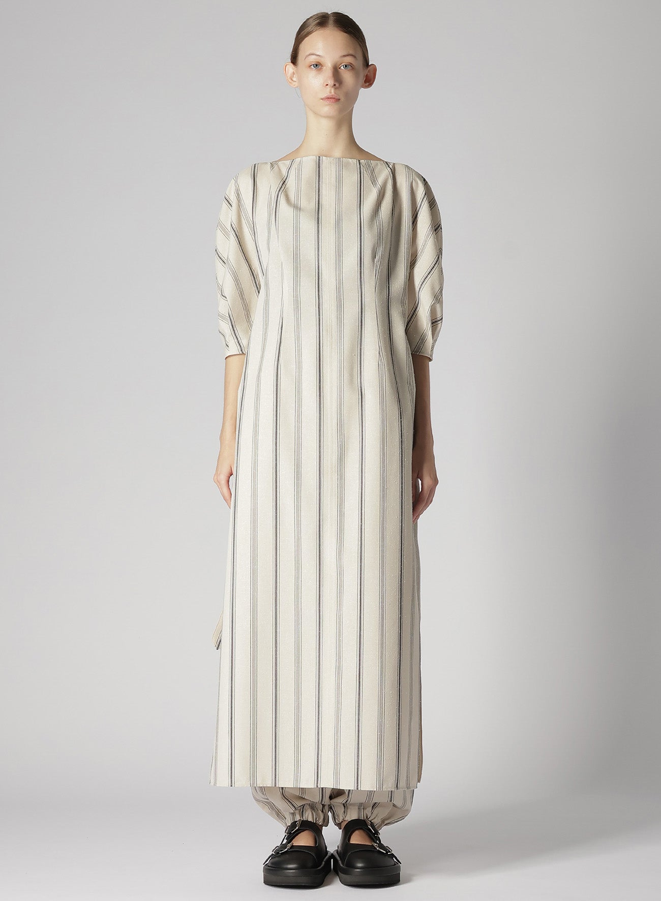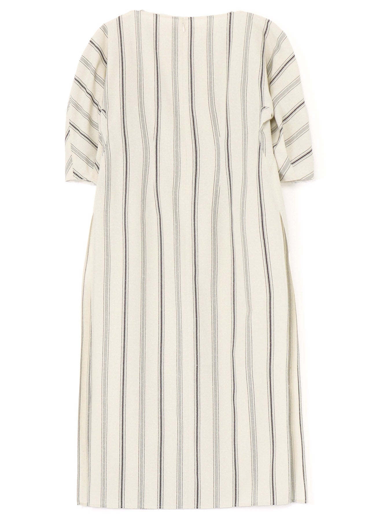 这款连衣裙具有自然条纹图案、圆形袖子和侧开衩。背部的拉链设计使穿脱变得简单。搭配裤子可以营造休闲造型。关键点包括其造型的灵活性和独特的开衩设计。