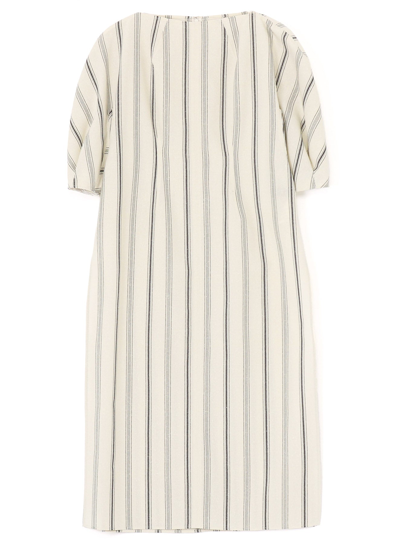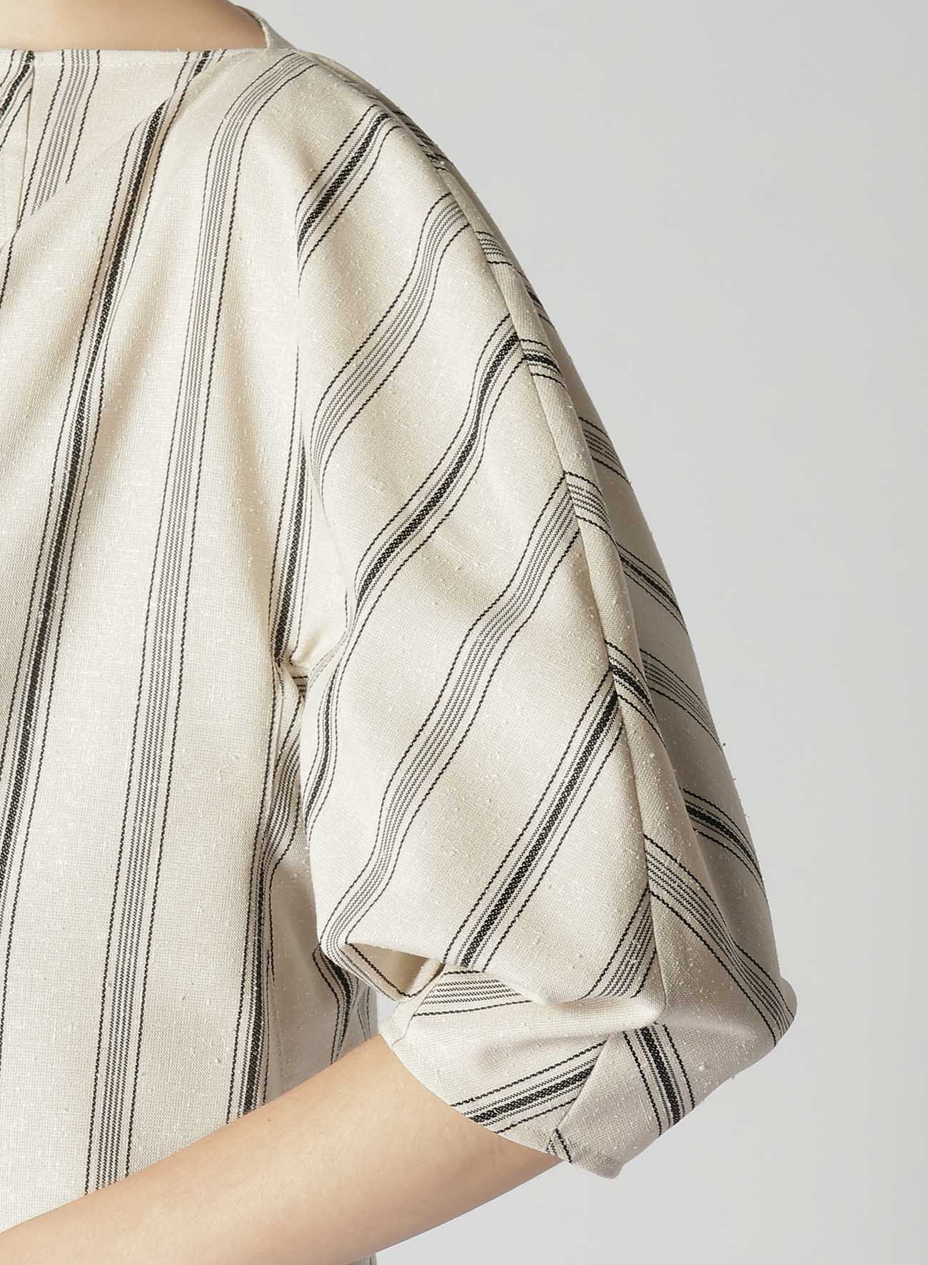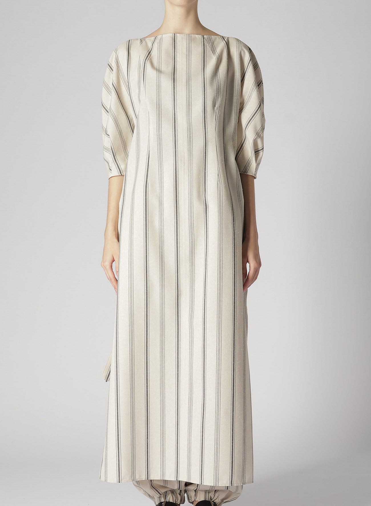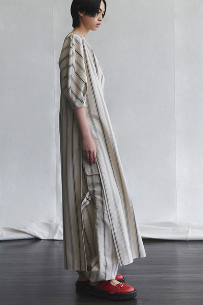 这款连衣裙具有自然条纹图案、圆形袖子和侧开衩。背部的拉链设计使穿脱变得简单。搭配裤子可以营造休闲造型。关键点包括其造型的灵活性和独特的开衩设计。