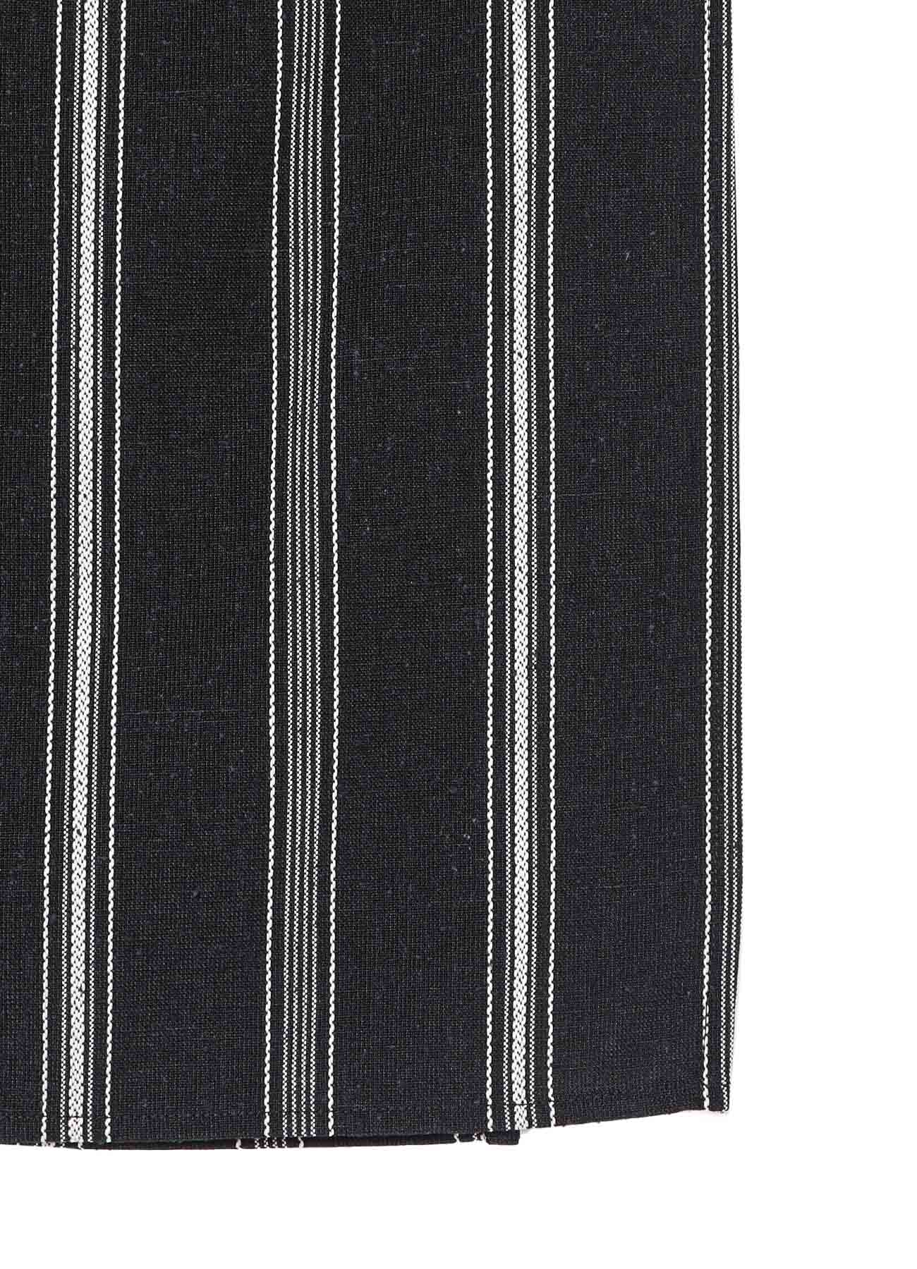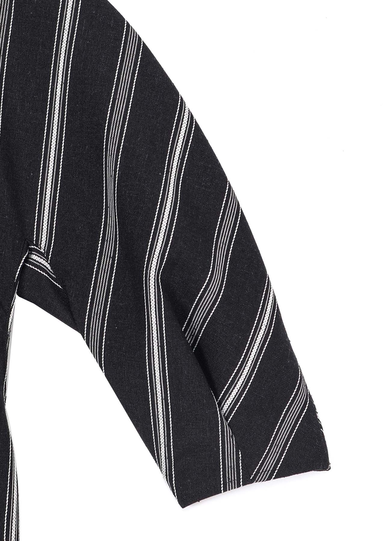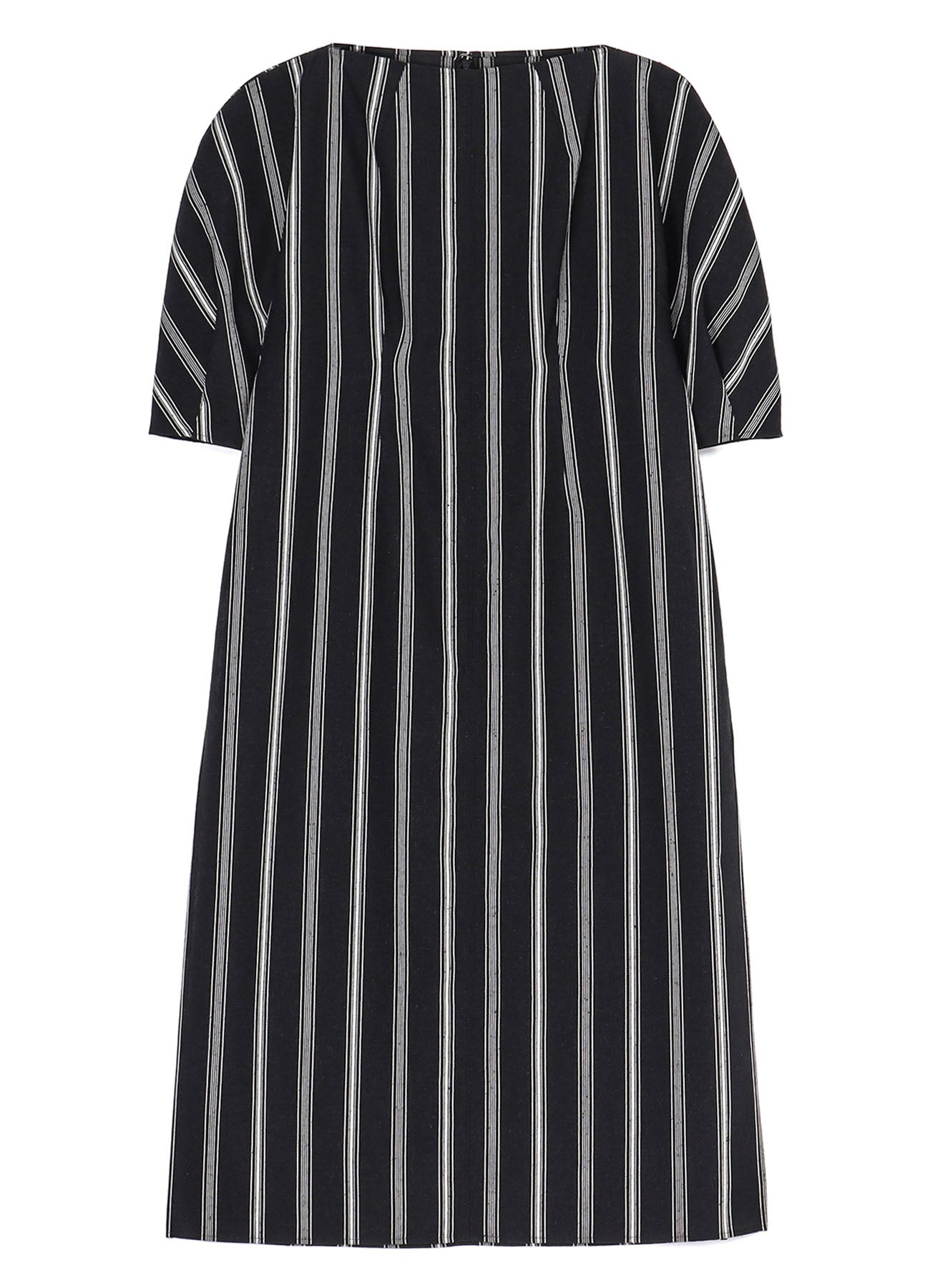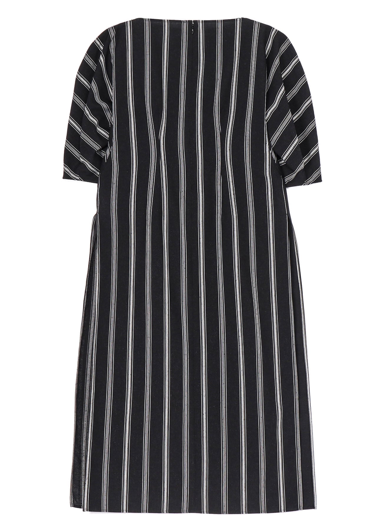 这款连衣裙具有自然条纹图案、圆形袖子和侧开衩。背部的拉链设计使穿脱变得简单。搭配裤子可以营造休闲造型。关键点包括其造型的灵活性和独特的开衩设计。