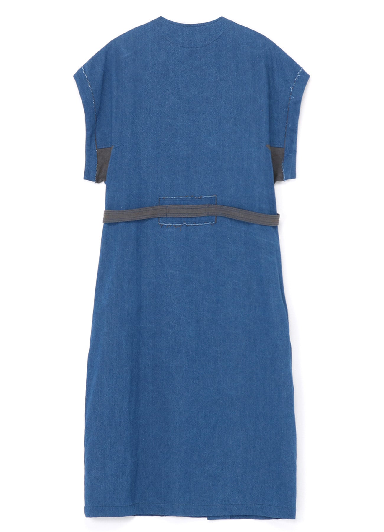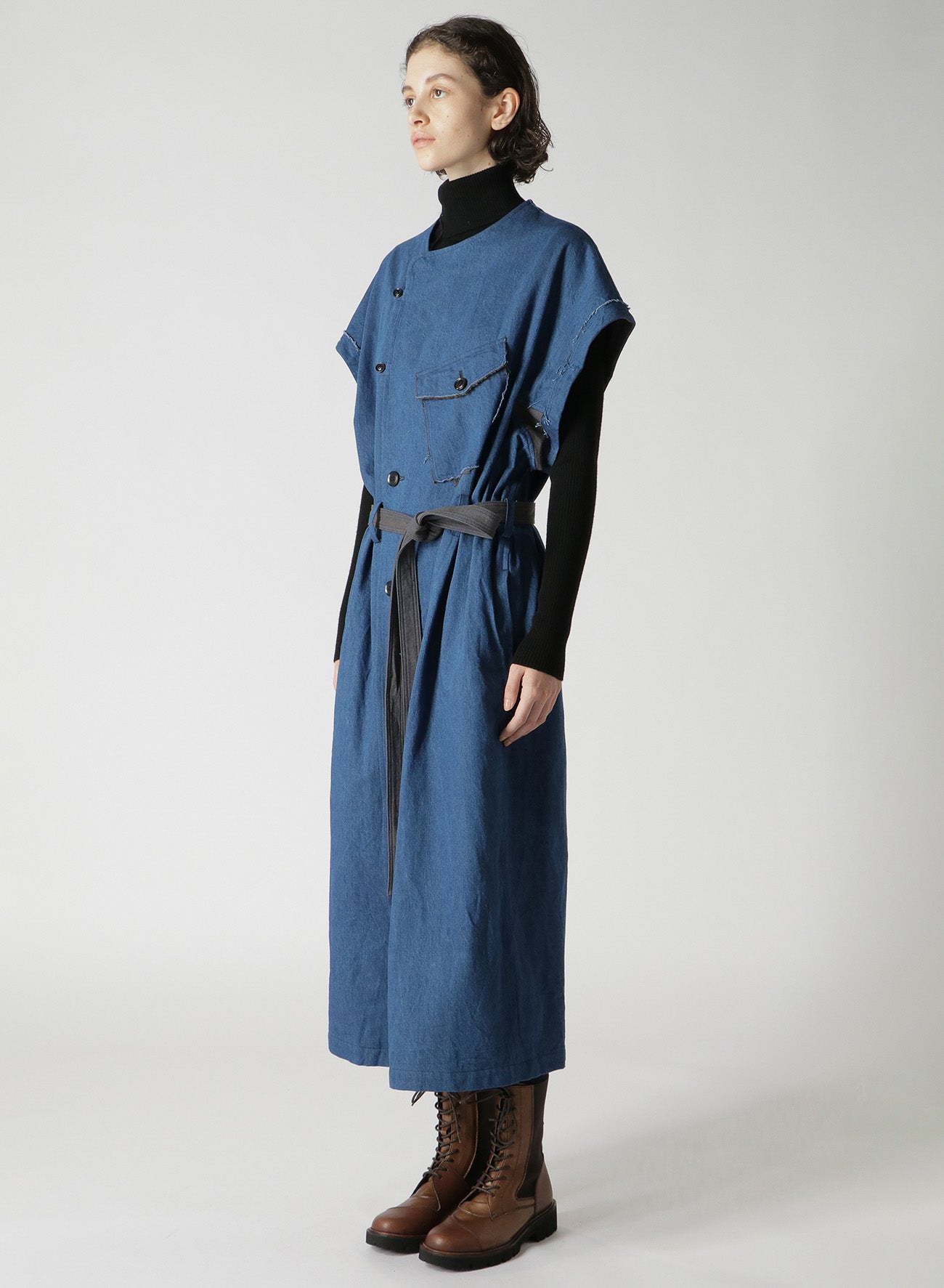 这款连衣裙由牛仔布制成,前后颜色不同,展现出微妙的色彩对比和原始边缘。宽松的轮廓可以通过抽绳在腰部收紧,以获得更明确的外观,也可以通过解开扣子作为外套穿着。