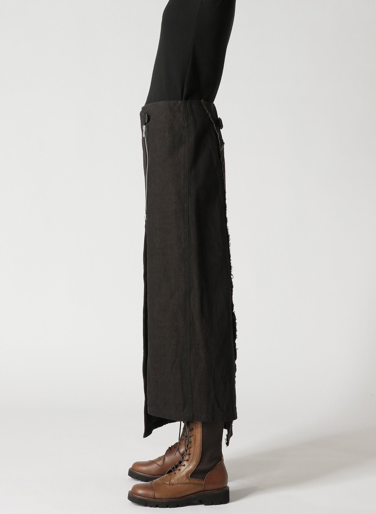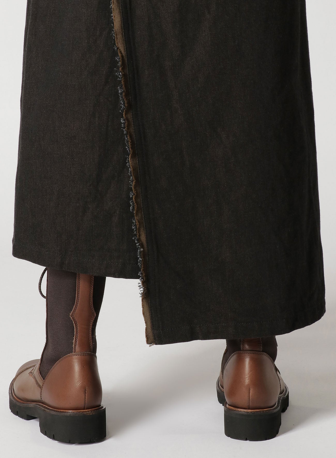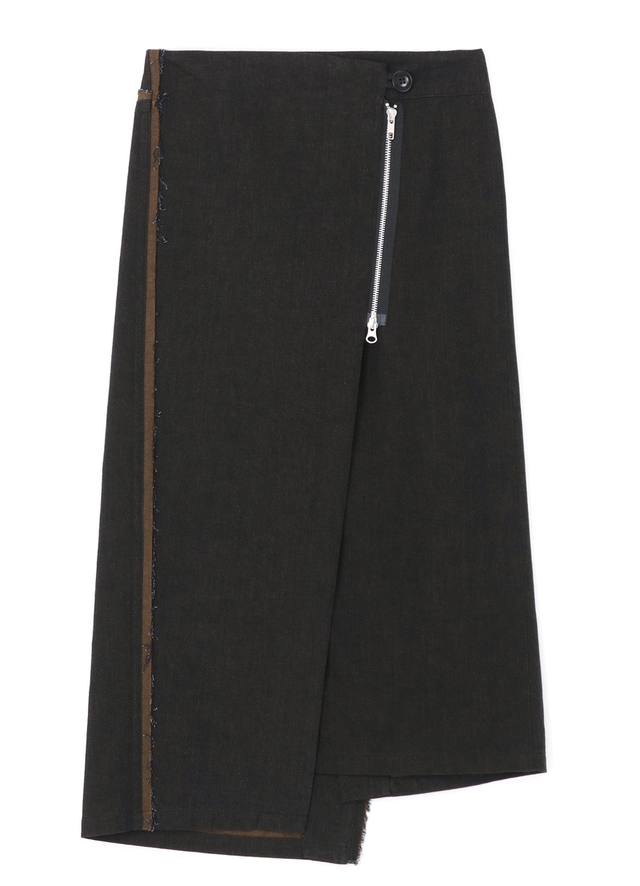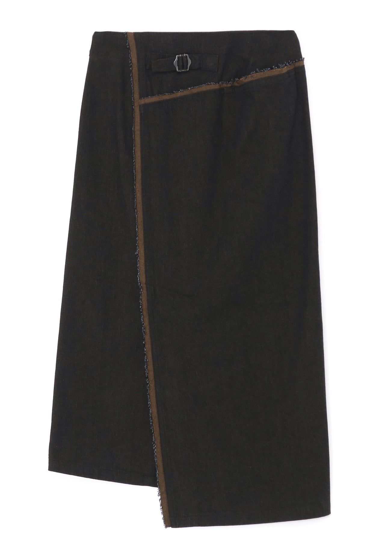 一款前后颜色不同的牛仔包裙。它的特点是适度的褪色和经过生物洗涤和石洗工艺处理后的柔软质感。后面的生边面料增添了动感的点缀。它具有直筒轮廓和后口袋,使其成为多功能的日常穿着。