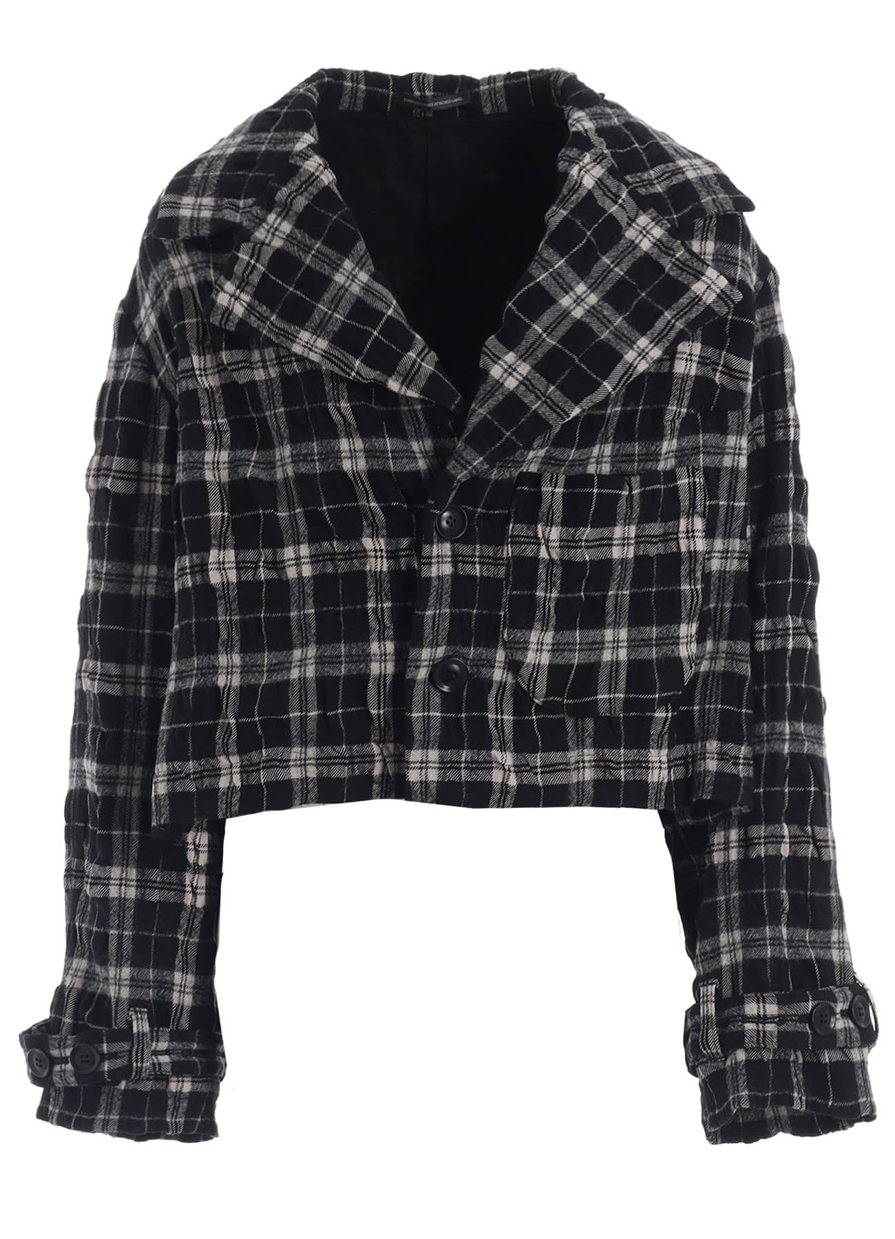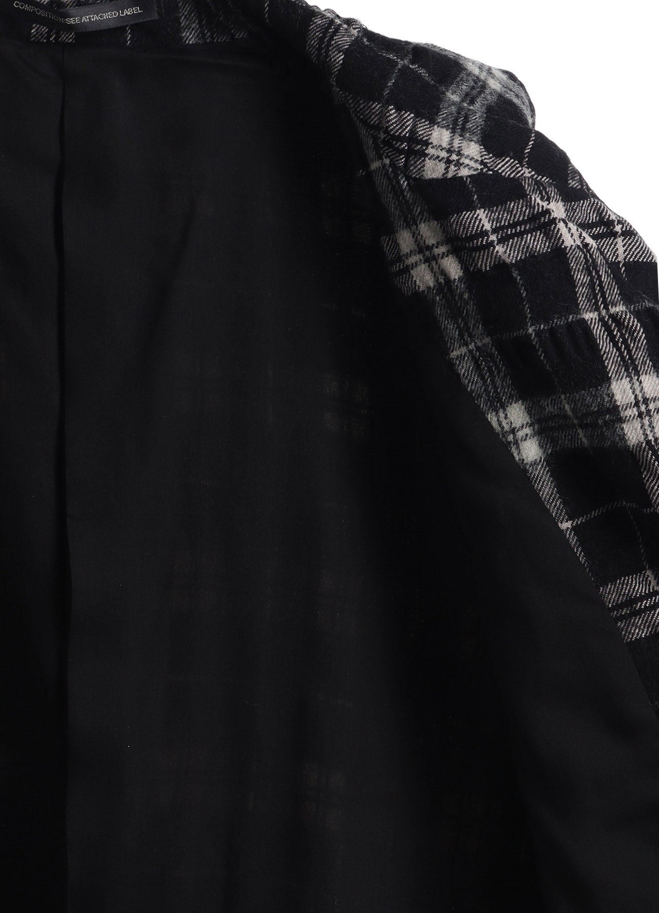 Y’s外套采用羊毛和棉混纺格纹设计,通过筒子机满缩加工工艺,创造出具有立体感的材质,使纤维以不同速度收缩。