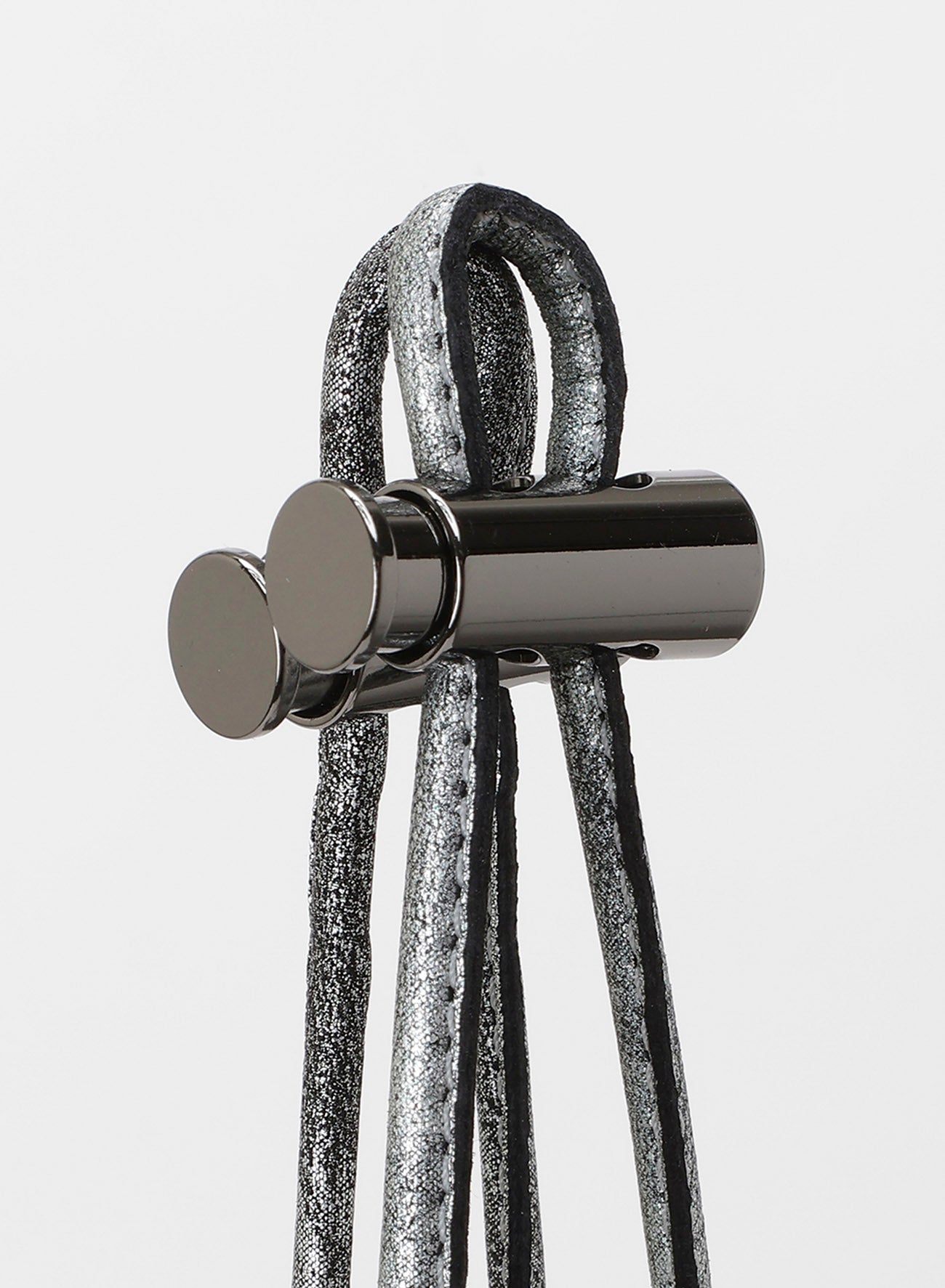 To celebrate Shibuya PARCO's 6th anniversary, a silver drawstring bag made from silky leather is available. It features pockets inside and outside and adjustable length. Each bag has a unique finish due to an antique-like foil applied by craftsmen, showcasing hand-crafted details and variations.