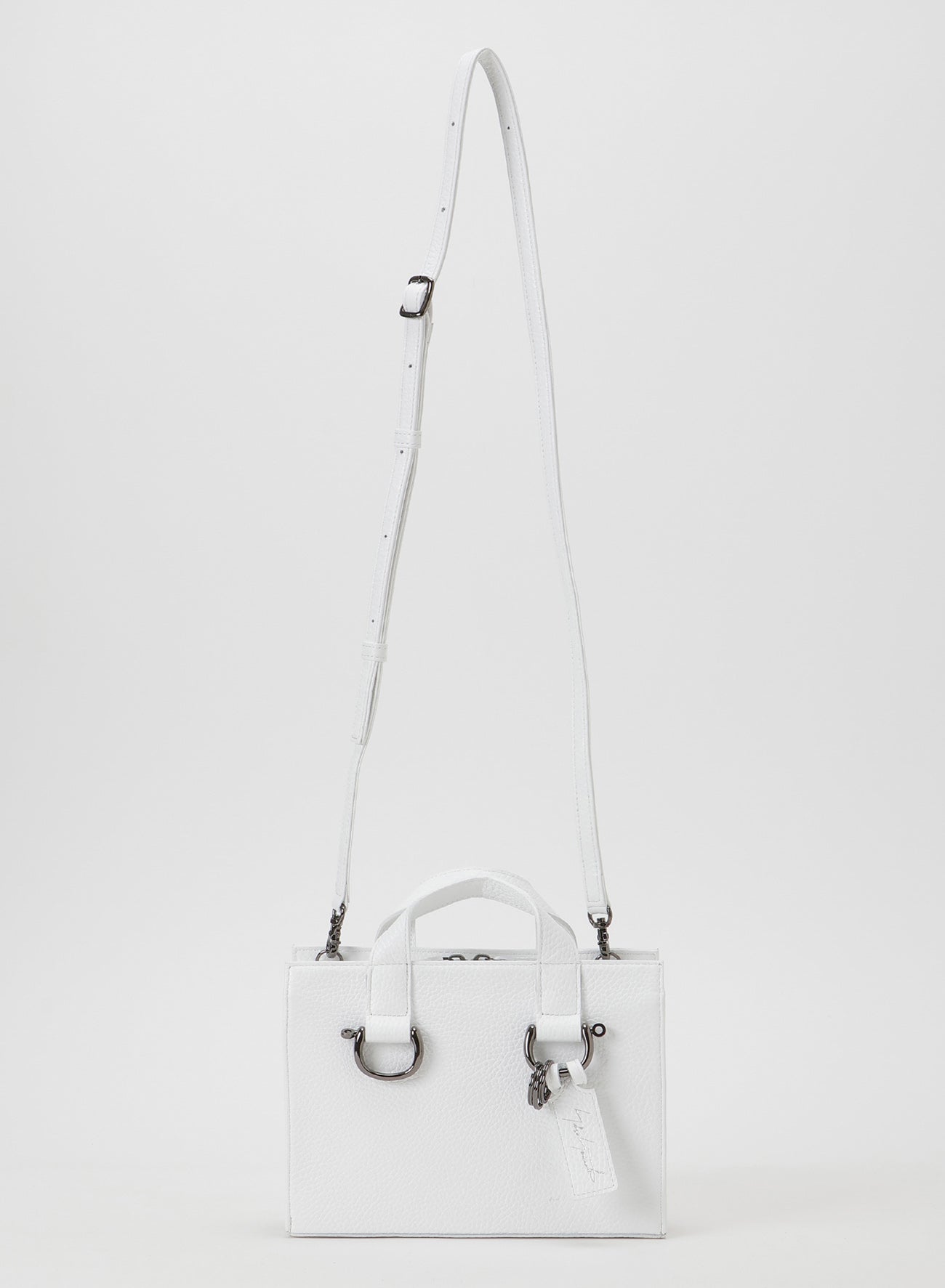 A mini bag from the Side Zip series featuring a detachable screw-type D-ring at the base of the handle. The metal fitting holds a double ring, perfect for adding keys or charms. Made with vibrant Italian shrink leather.
