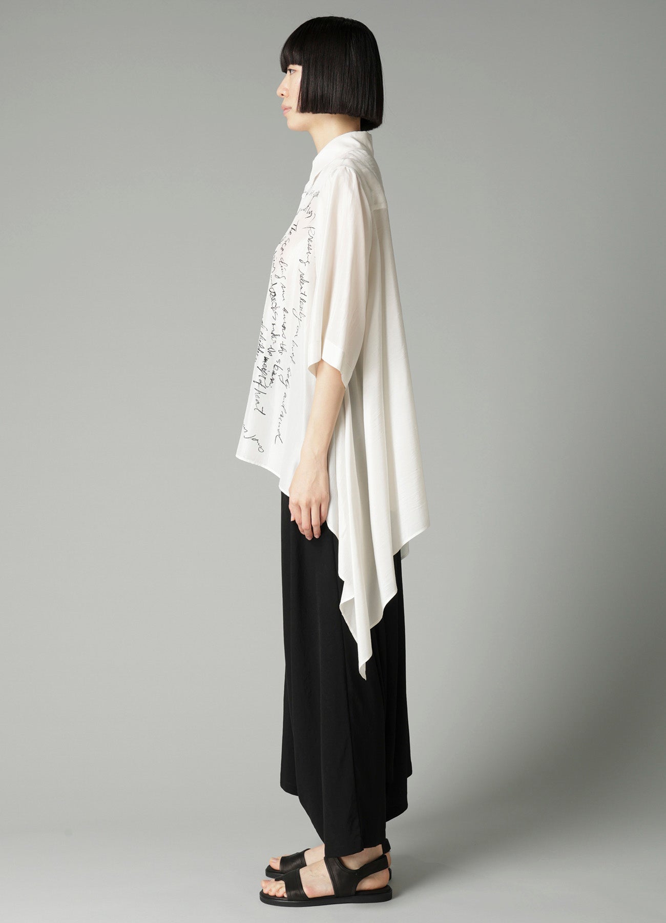 這款短袖襯衫採用絲滑材質,上有設計師訊息印刷。側邊的流動布料增添優雅輪廓,行走時展現優雅動感。模特穿著的是樣品,可能與實際產品在尺寸和質感上有所不同。請查閱SIZE INFO獲取詳細資訊。