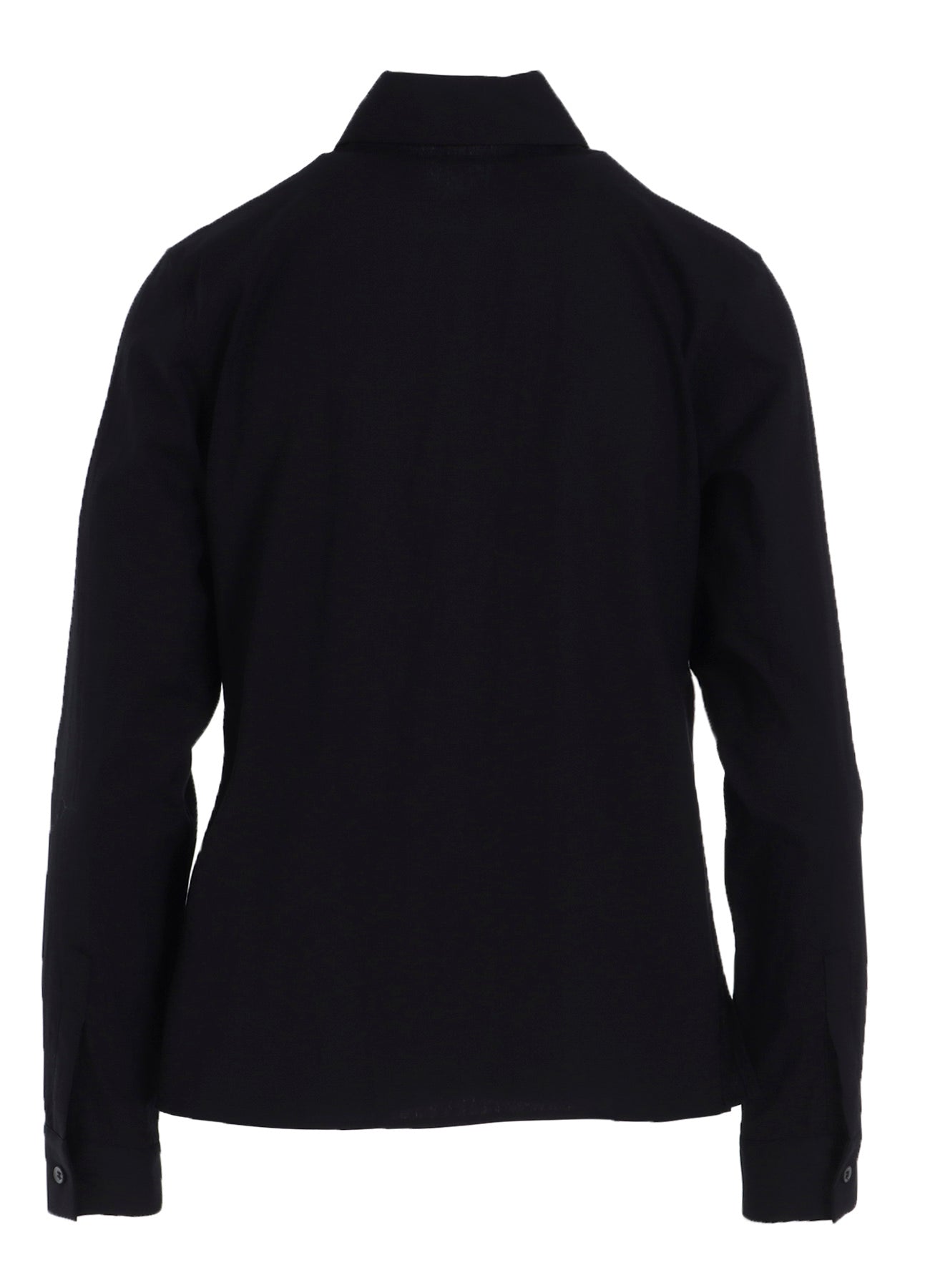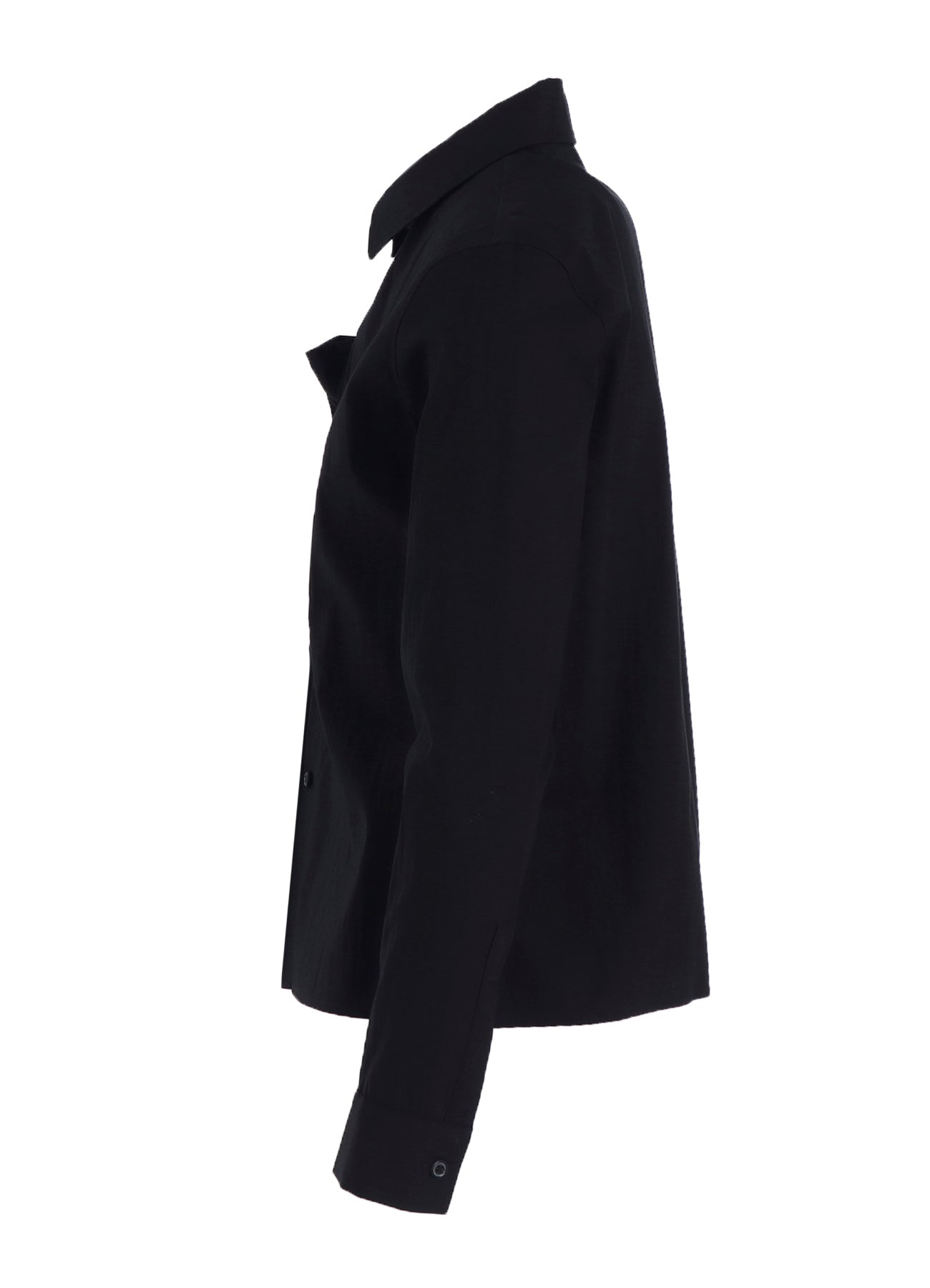 這款長袖上衣在一側採用優雅的細摺設計。它由高密度平紋布製成,表面光滑且帶有微微光澤,觸感舒適,經過皺洗處理呈現柔和自然的感覺。微緊身的剪裁和多用途的設計使它成為一件引人注目的單品。