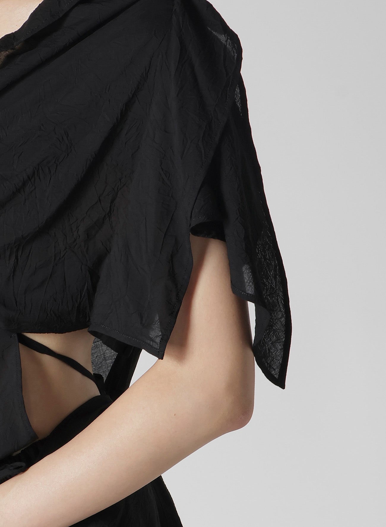 This dress features a bold back cut-out design, showcasing sophisticated drapery with a delicate change in texture. Crafted from lightweight rayon lawn with a catch wrinkle finish, it embodies elegance. Note that the model is wearing a sample, so there may be variations in size and texture.