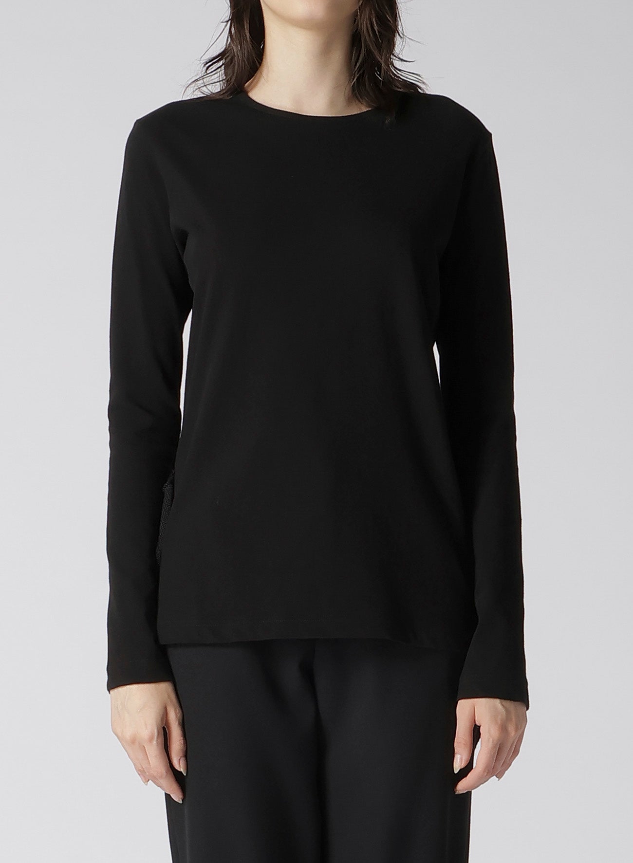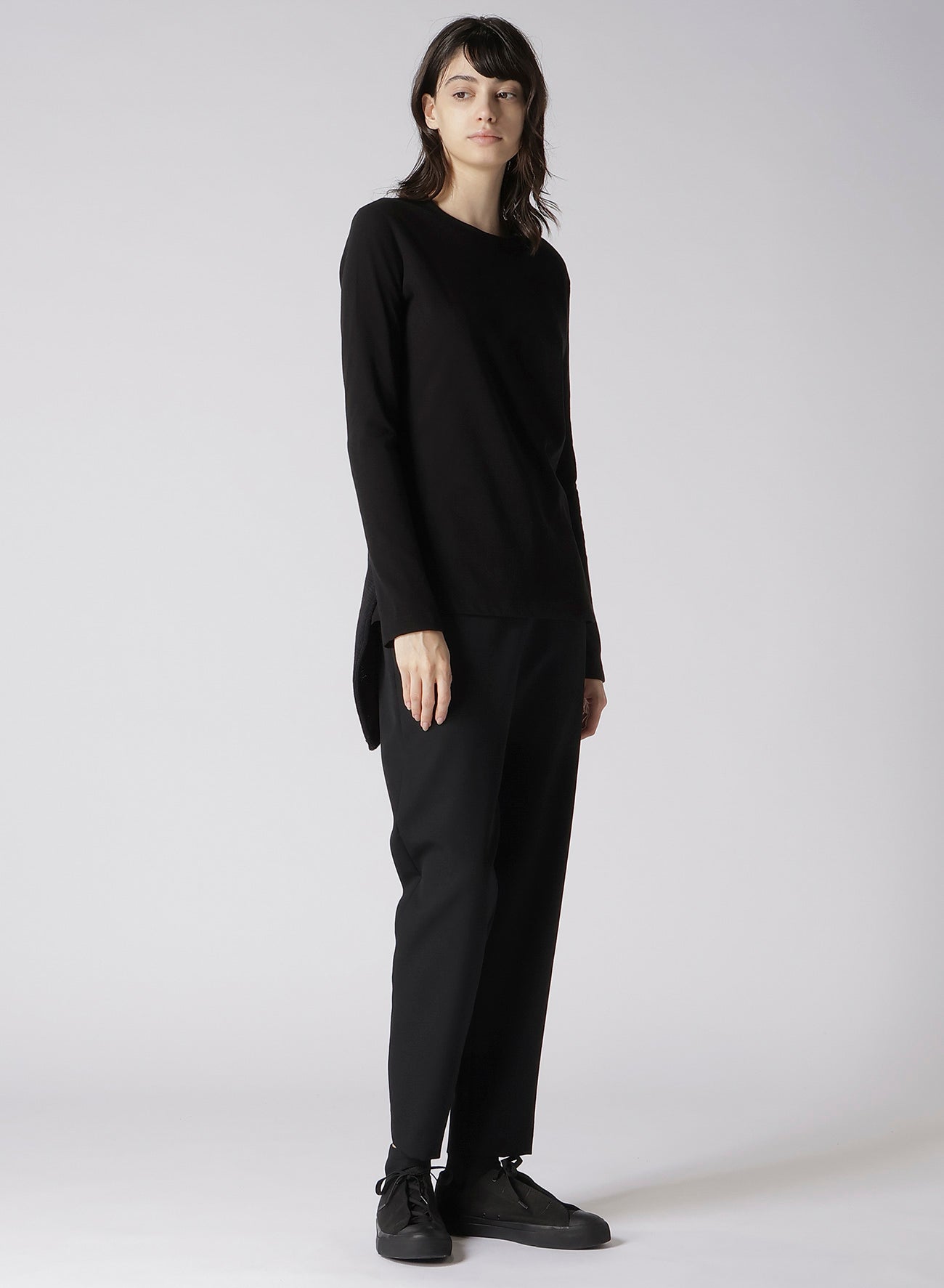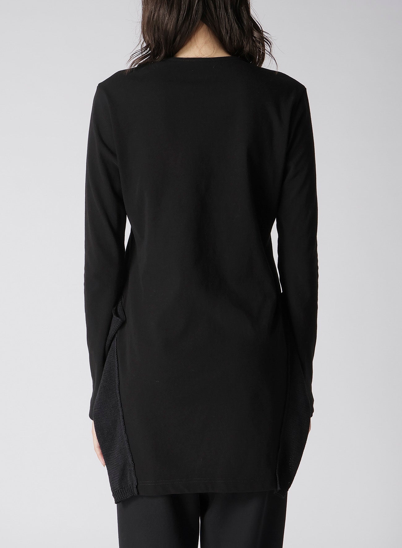 這款圓領長袖上衣採用一種以乾淨質感、垂墜感和透氣性著稱的面料製作。清晰、低毛絨的表面賦予其優雅的外觀。設計上採用不對稱下擺,與任何褲子搭配都很合適。請注意,模特圖片使用的是樣品,可能與最終產品略有不同。詳情請參考尺寸資訊。